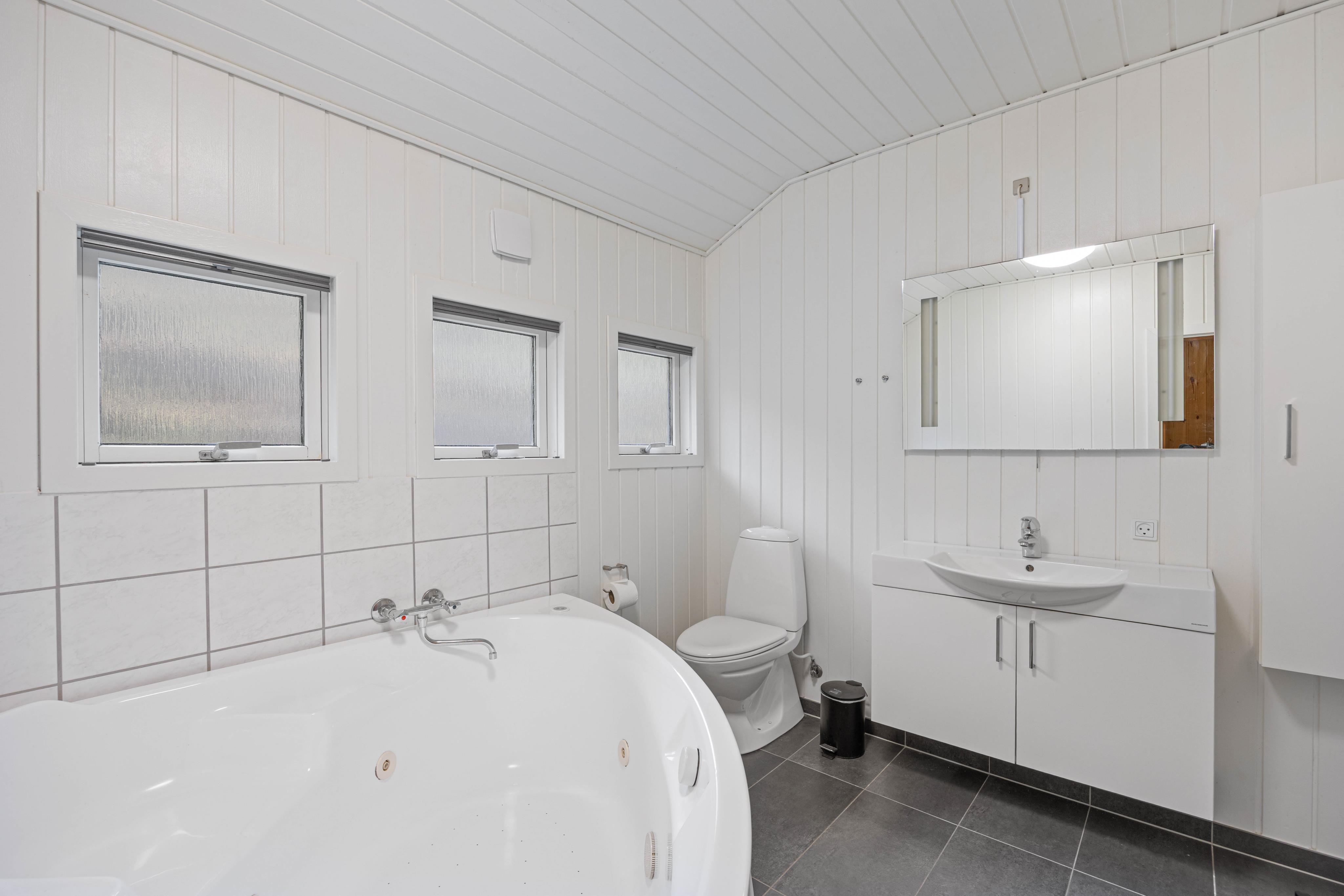 Efter en lang gåtur ved stranden, kan i blive varmet op i sommerhusets højdepunkt, de 2 badeværelser. Badeværelserne er begge udstyret med gulvvarme. Derudover finder i Wellness-området på det ene badeværelse, her kan I nyde et spabad efterfulgt af en tur i den rummelige sauna.