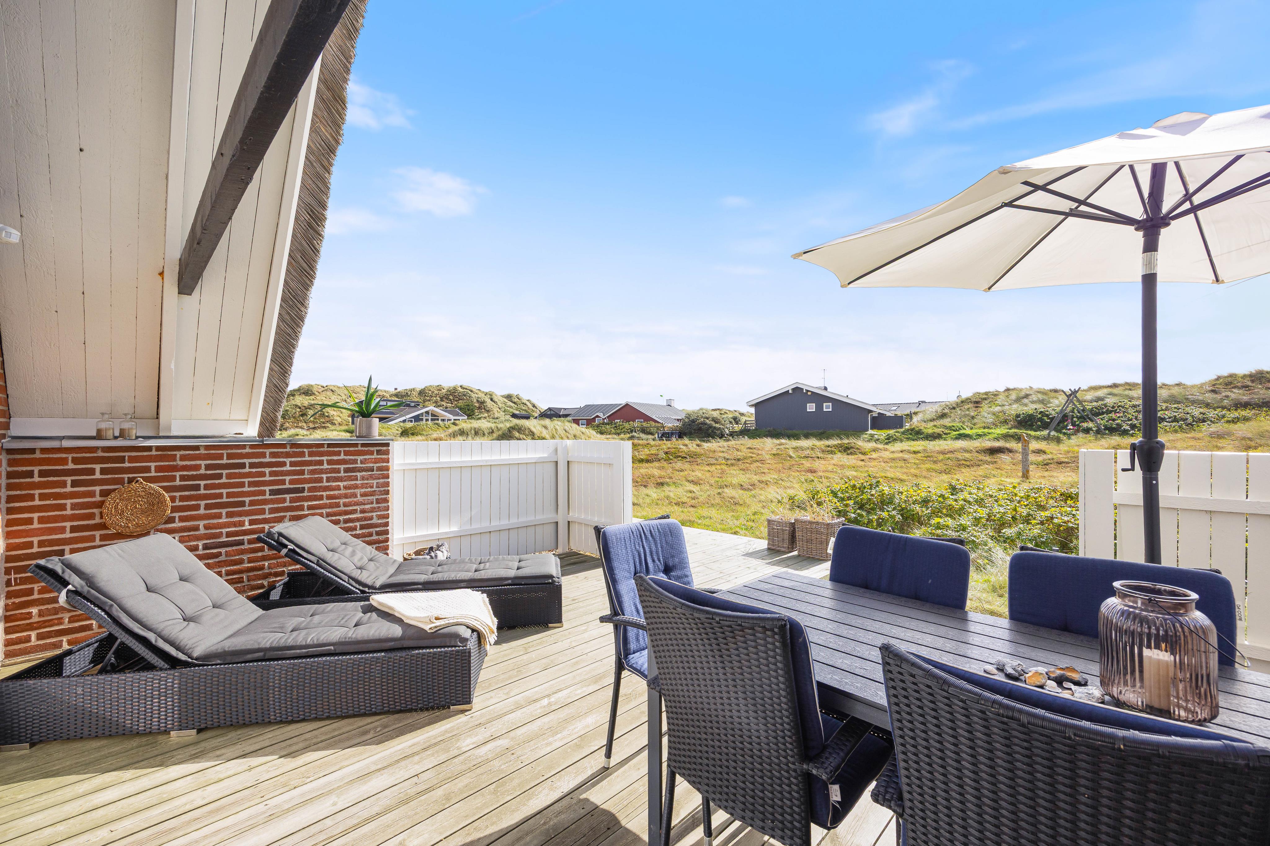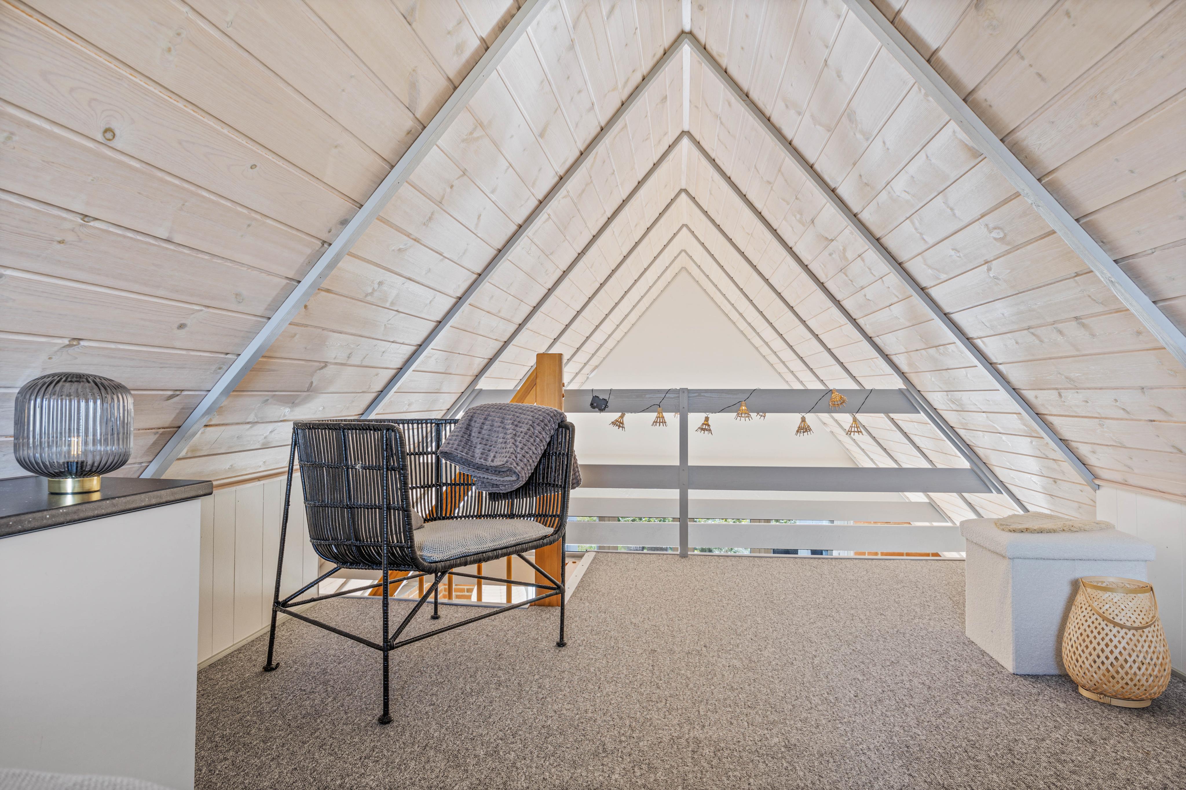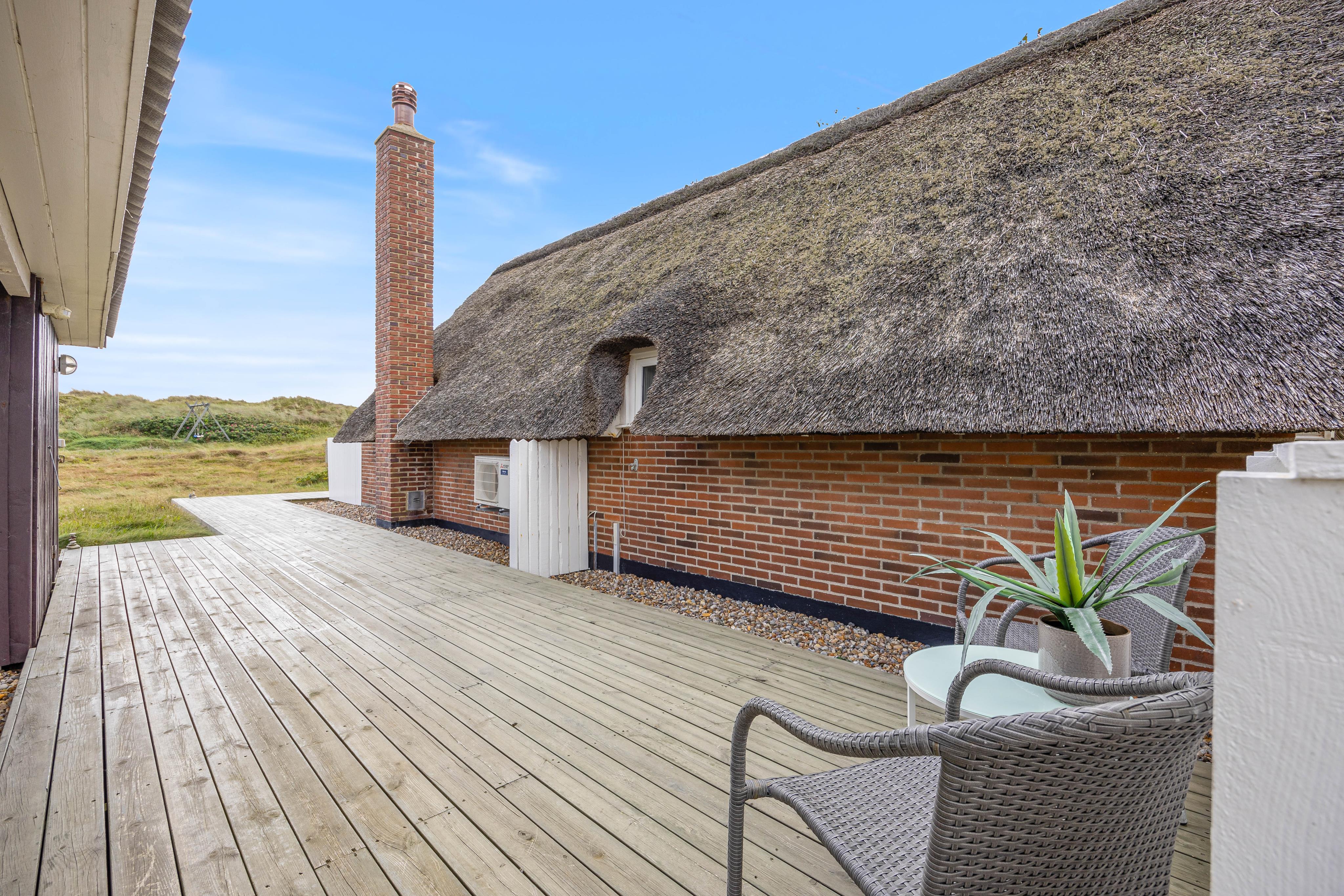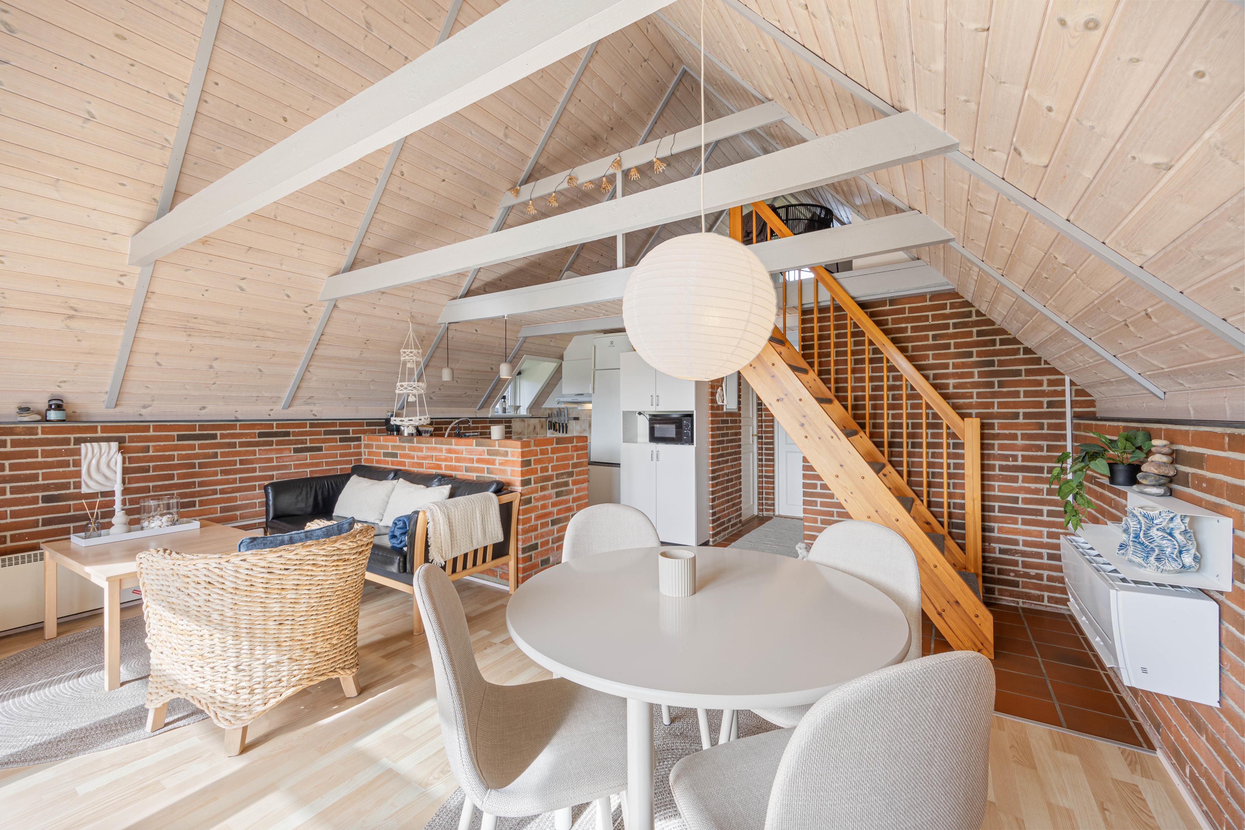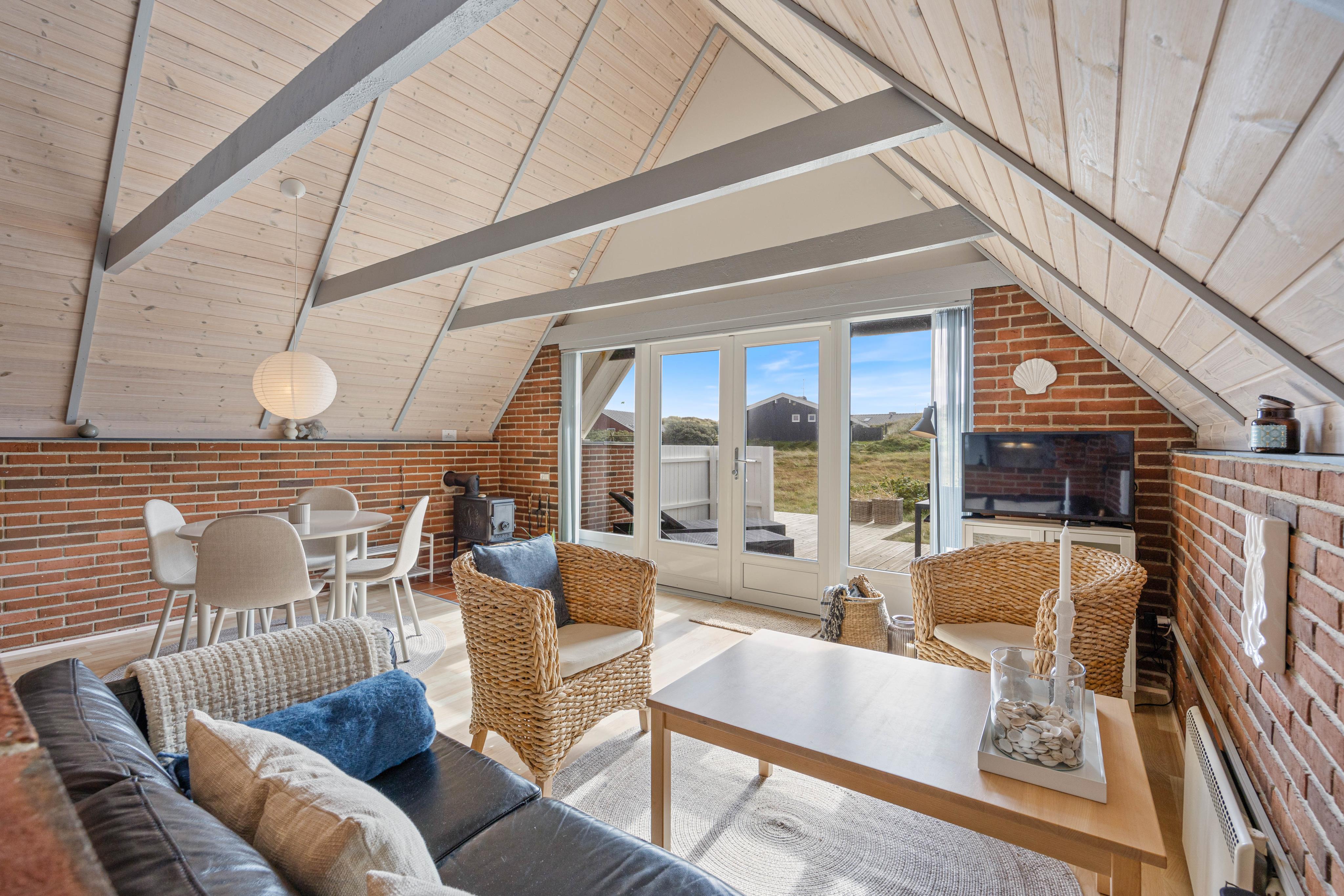 Indenfor mødes I af en hyggelig stue med højt til loftet, synlige bjælker og udsigt til de fredelige klitter. Her kan I slappe af i sofaen med en god bog eller samle familien til brætspil foran den knitrende brændeovn på de kølige dage. Udover brændeovnen er der også en varmepumpe som sørger for en behagelig inde temperatur, uanset årstid. Køkkenet ligger i åben forbindelse med stuen og er praktisk indrettet med alt, hvad I har brug for – herunder opvaskemaskine, så oprydningen klares nemt.