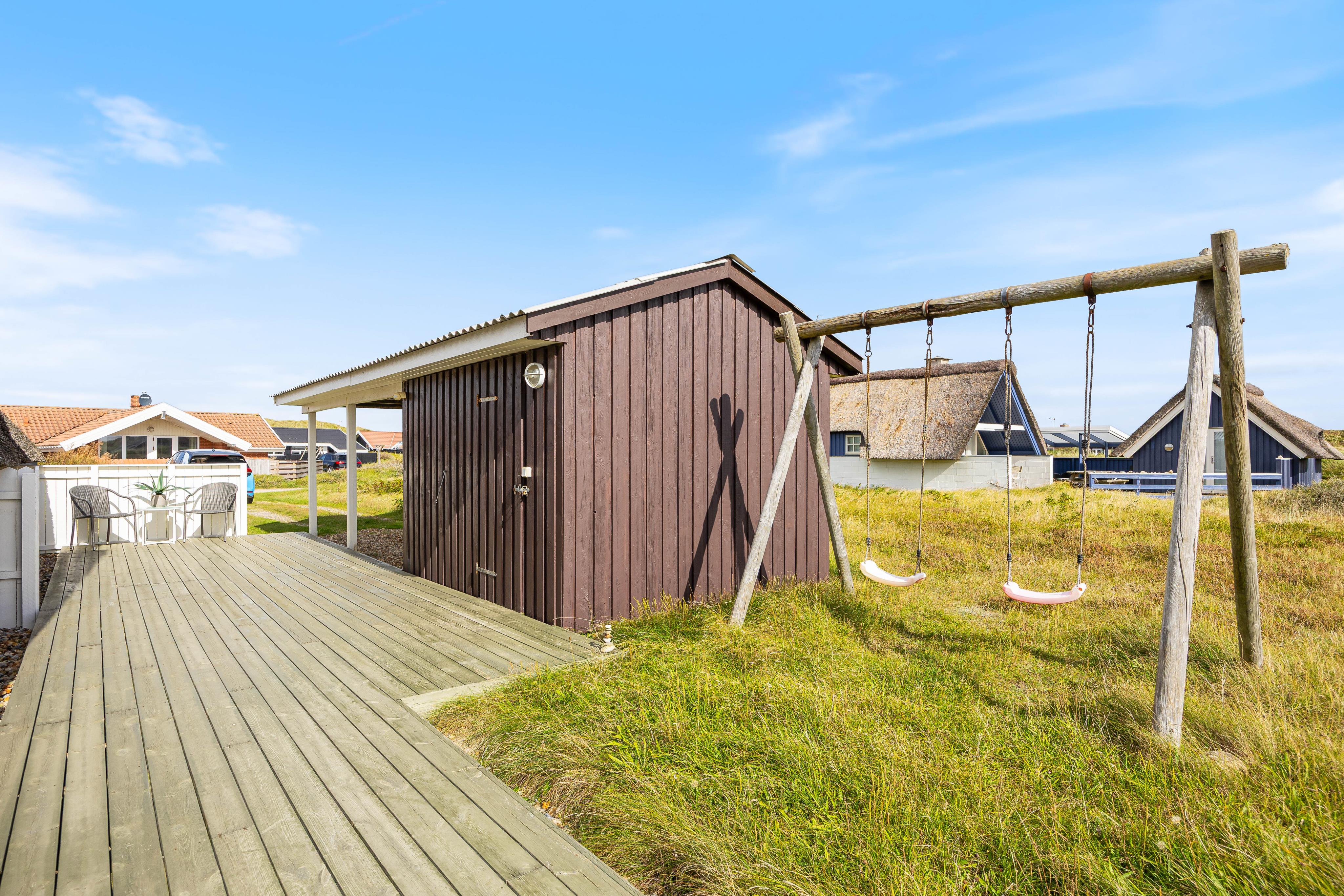 Sommerhuset ligger på en dejlig naturgrund, hvor I kan nyde ferien i rolige omgivelser. Den åbne terrasse er udstyret med havemøbler og grill, så I kan tilberede lækre måltider under åben himmel. For familiens yngste er der en gynge, hvor timerne kan gå med leg og latter, mens de voksne nyder solen og den friske havluft.