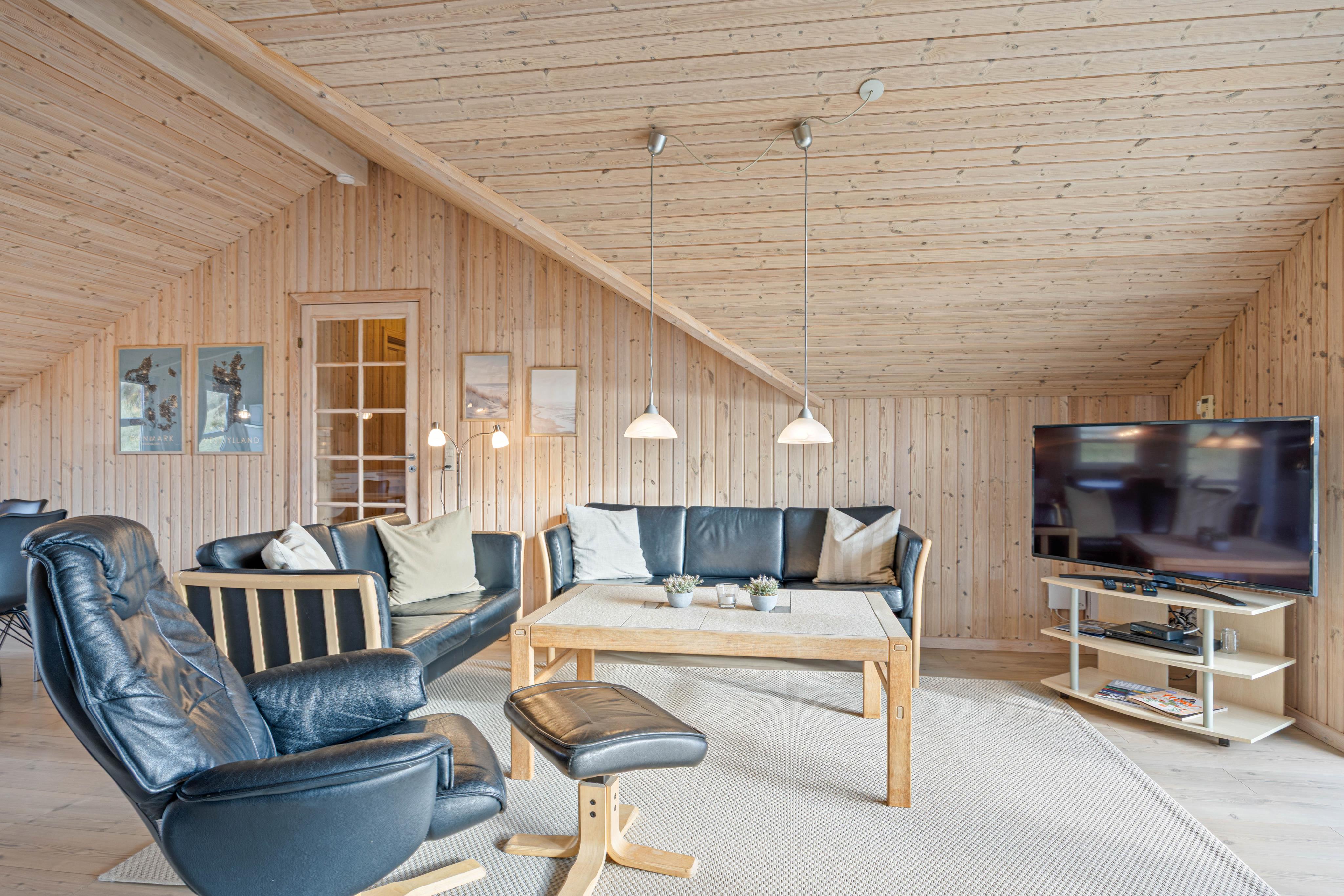 Samlingspunktet i sommerhuset er opholdsrummet, som ligger i åben forbindelse med det veludstyrede køkken. Stuen indbyder til mange hyggelige stunder i familiens selskab, mens brændeovnen sørger for varme på en blæsende efterårsdag. I kan desuden også benytte jer af varmepumpen, som hjælper med at holde temperaturen i rummet behagelig.