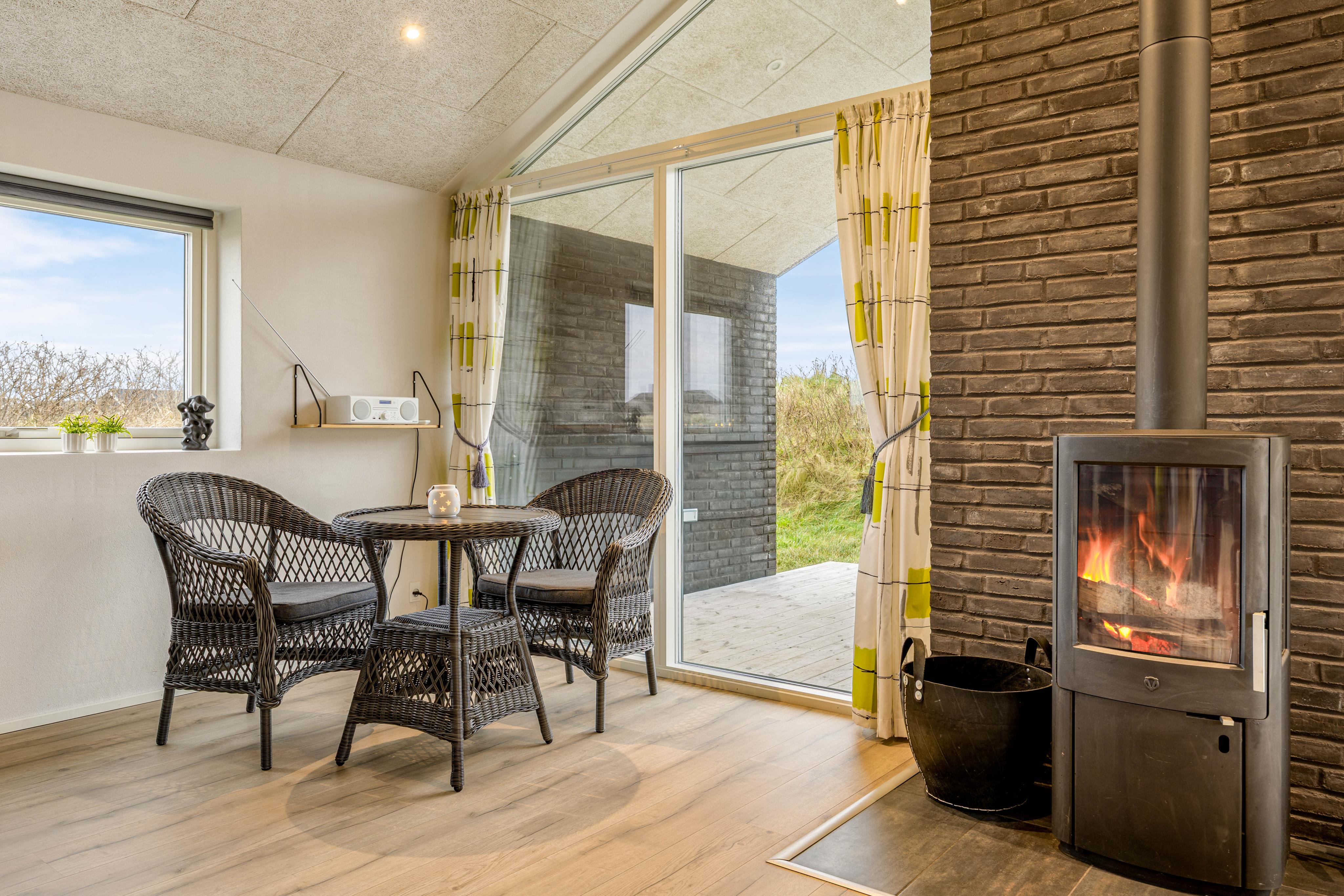 Terrasserne rundt om huset giver rig mulighed for at og nyde solen, naturen og Vesterhavet. - Den ultimative nydelse og ren afslapning må være en veltilberedt grillmiddag på terrassen, et godt glas vin og at se solnedgangen farve himlen orangerød over klitterne – med havets brusen og salte duft i baggrunden.