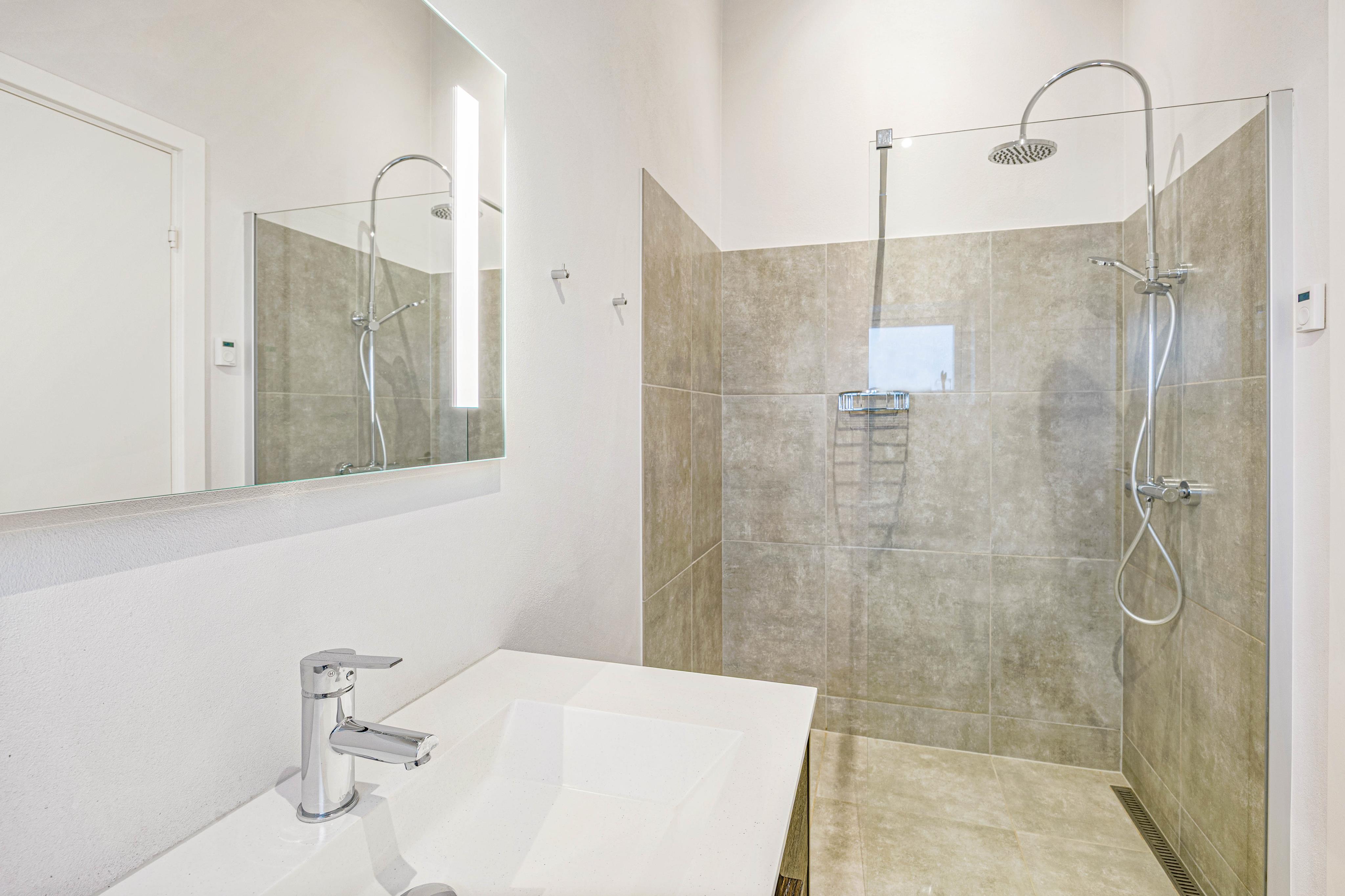 De 2 badeværelser er begge med gulvvarme og bruseniche. Fra det ene badeværelse er der desuden adgang til en sauna.