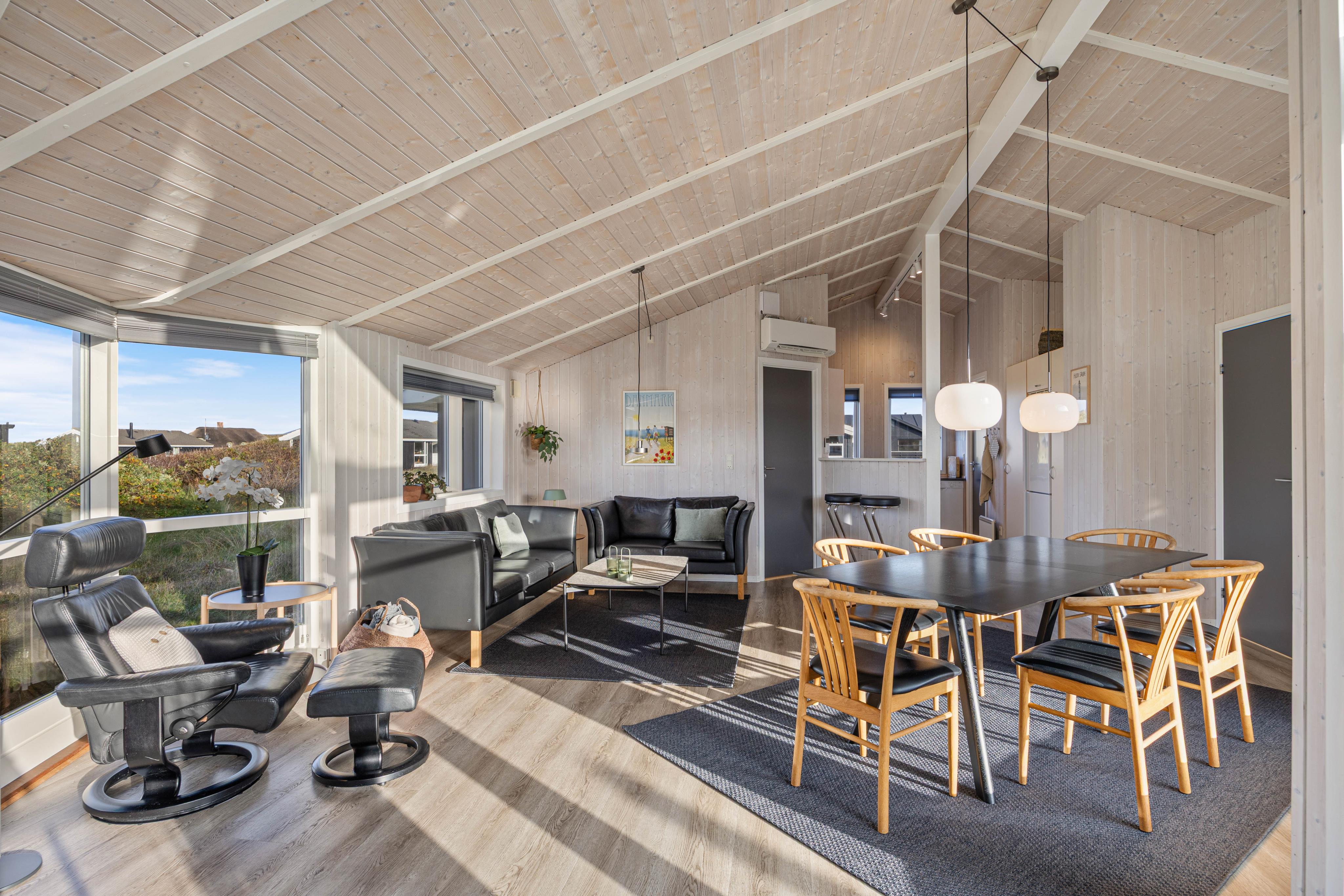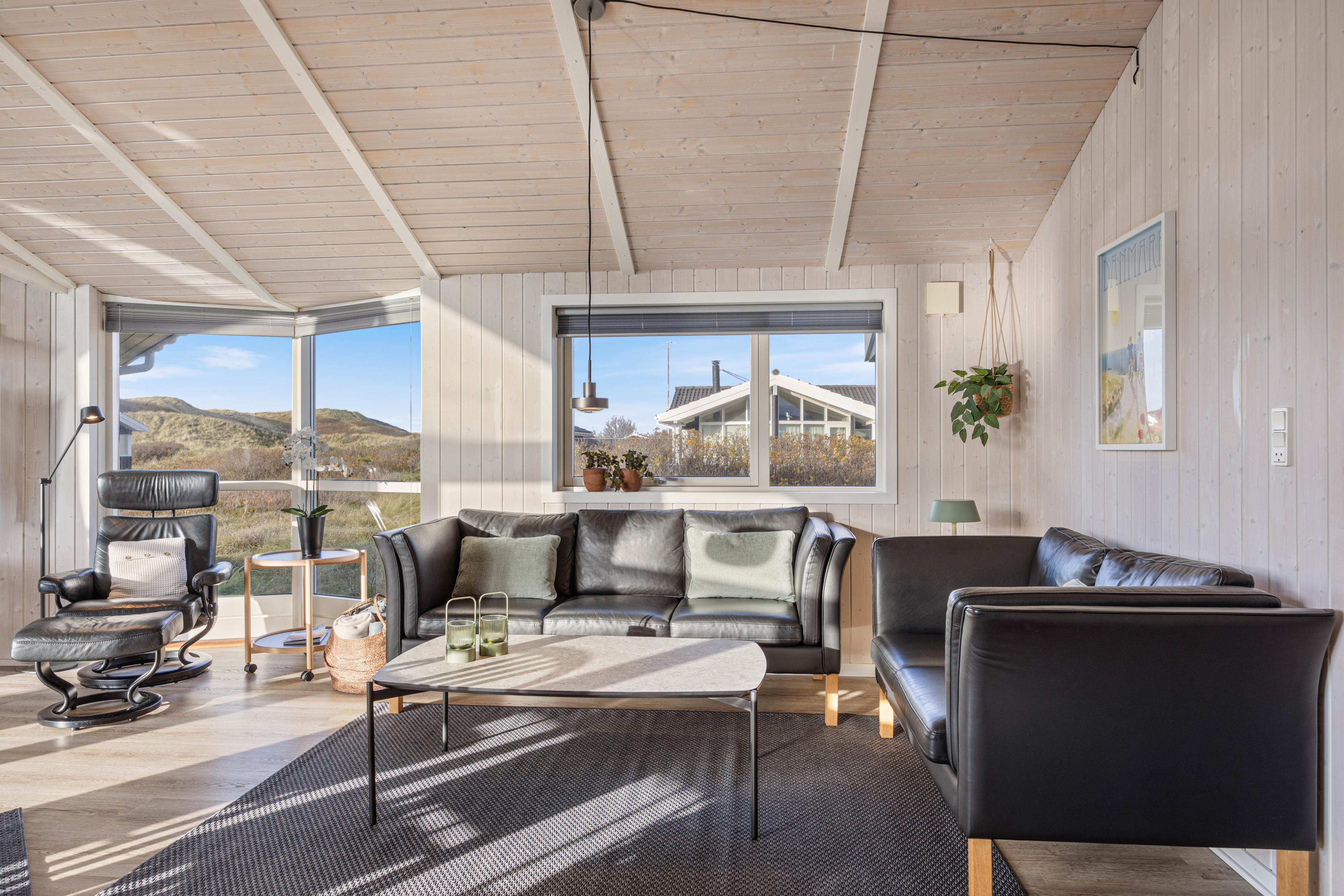 Køkken og stue ligger i forlængelse af hinanden, og de store vinduespartier gør rummet endnu mere åbent og giver jer udsigt til det smukke klitlandskab. Brændeovnen sørger for varme og hyggelig atmosfære året rundt.