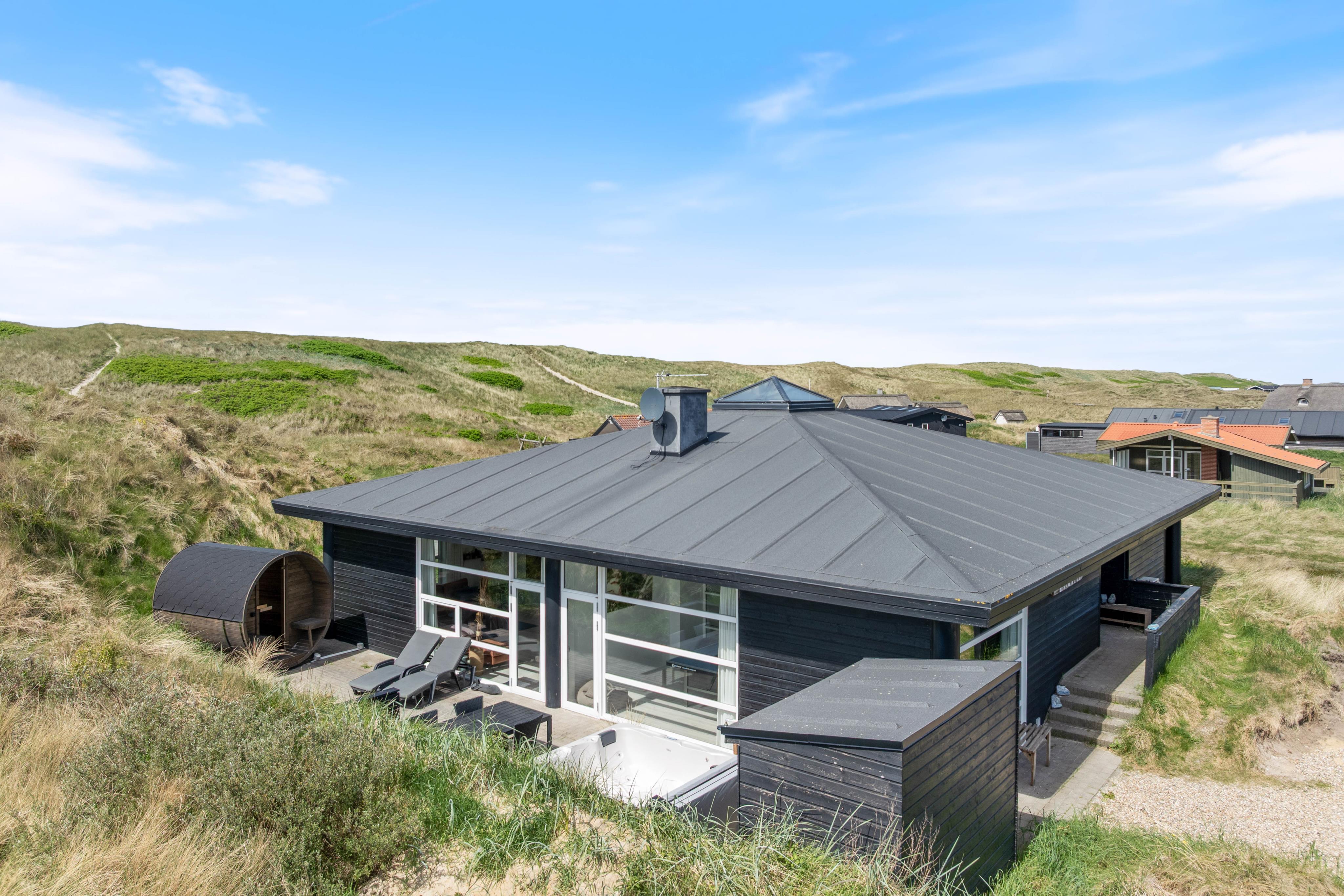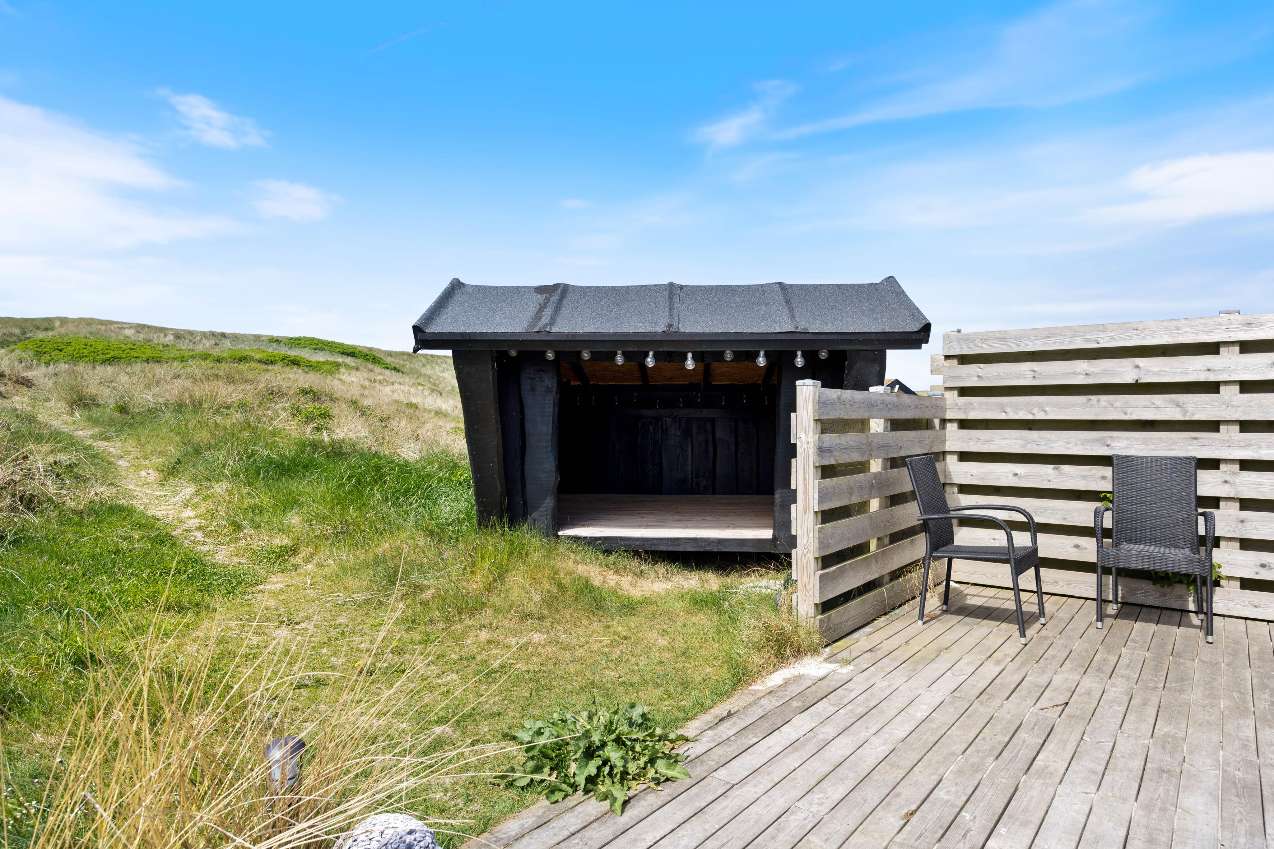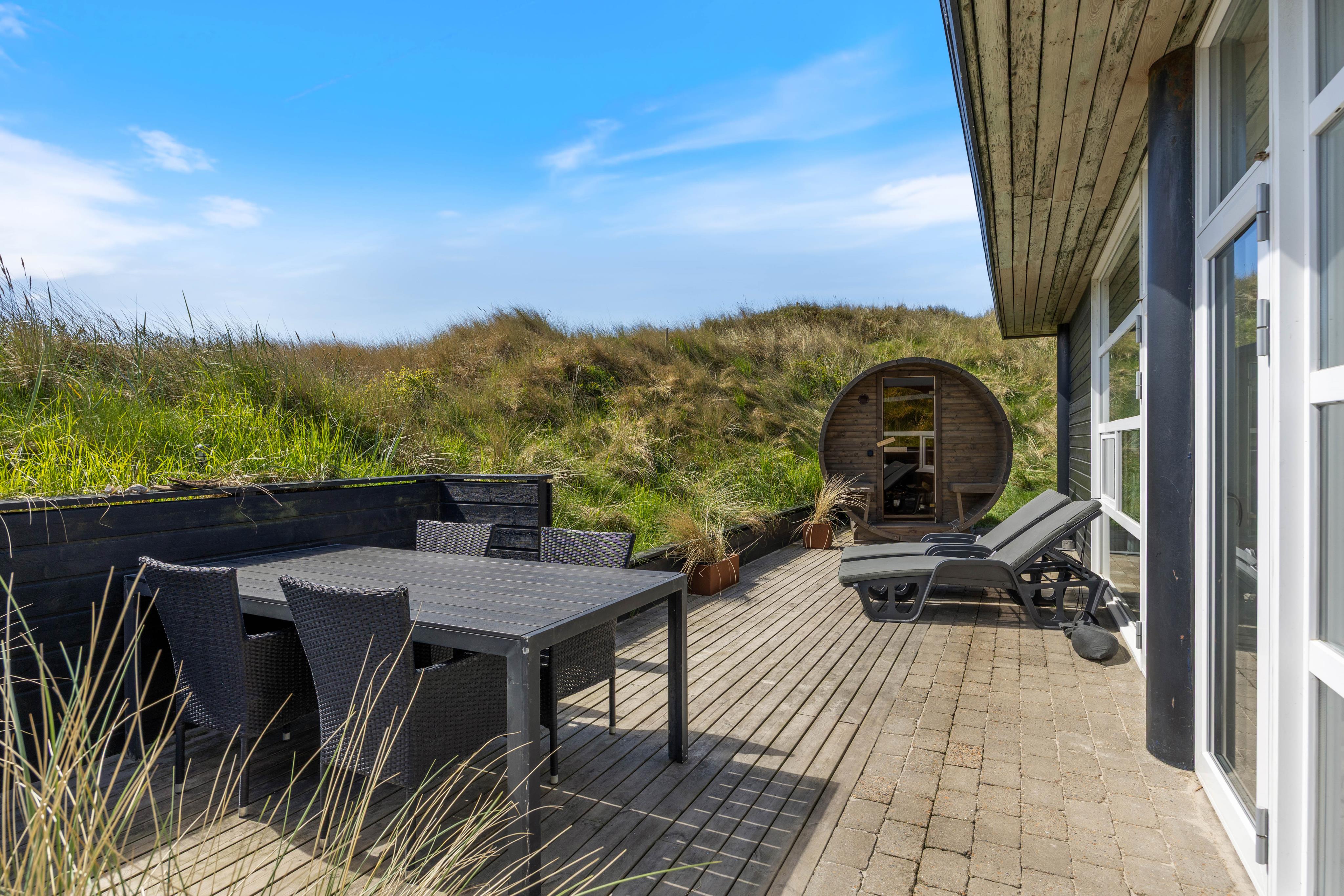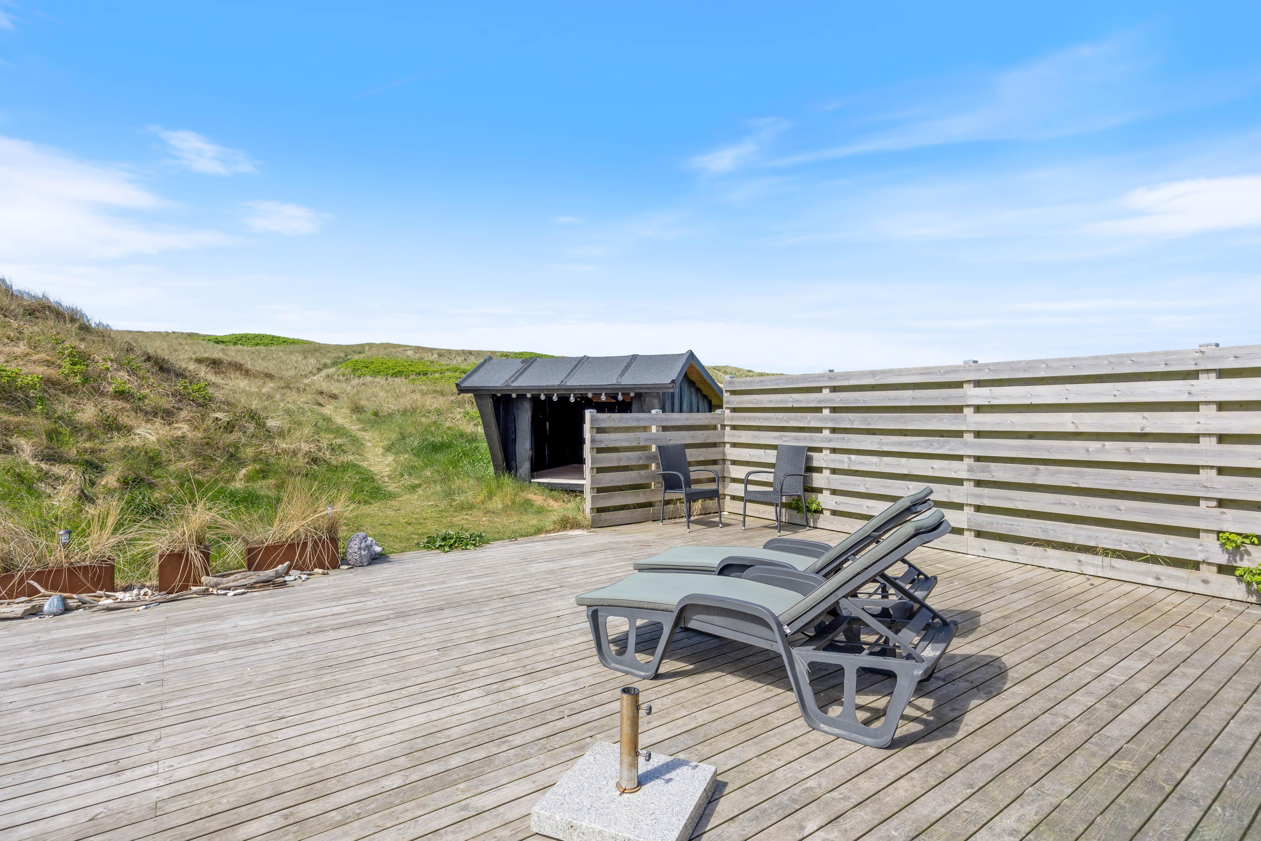 Rundt om huset er der gode terrasser, hvorfra det er muligt at grille eller bare at sidde ude og nyde solen samt læ fra den nærtliggende klit. Når I trænger til at komme helt ned i gear, kan I sætte jer ned i spaen og nyde den skønne vesterhavsluft.