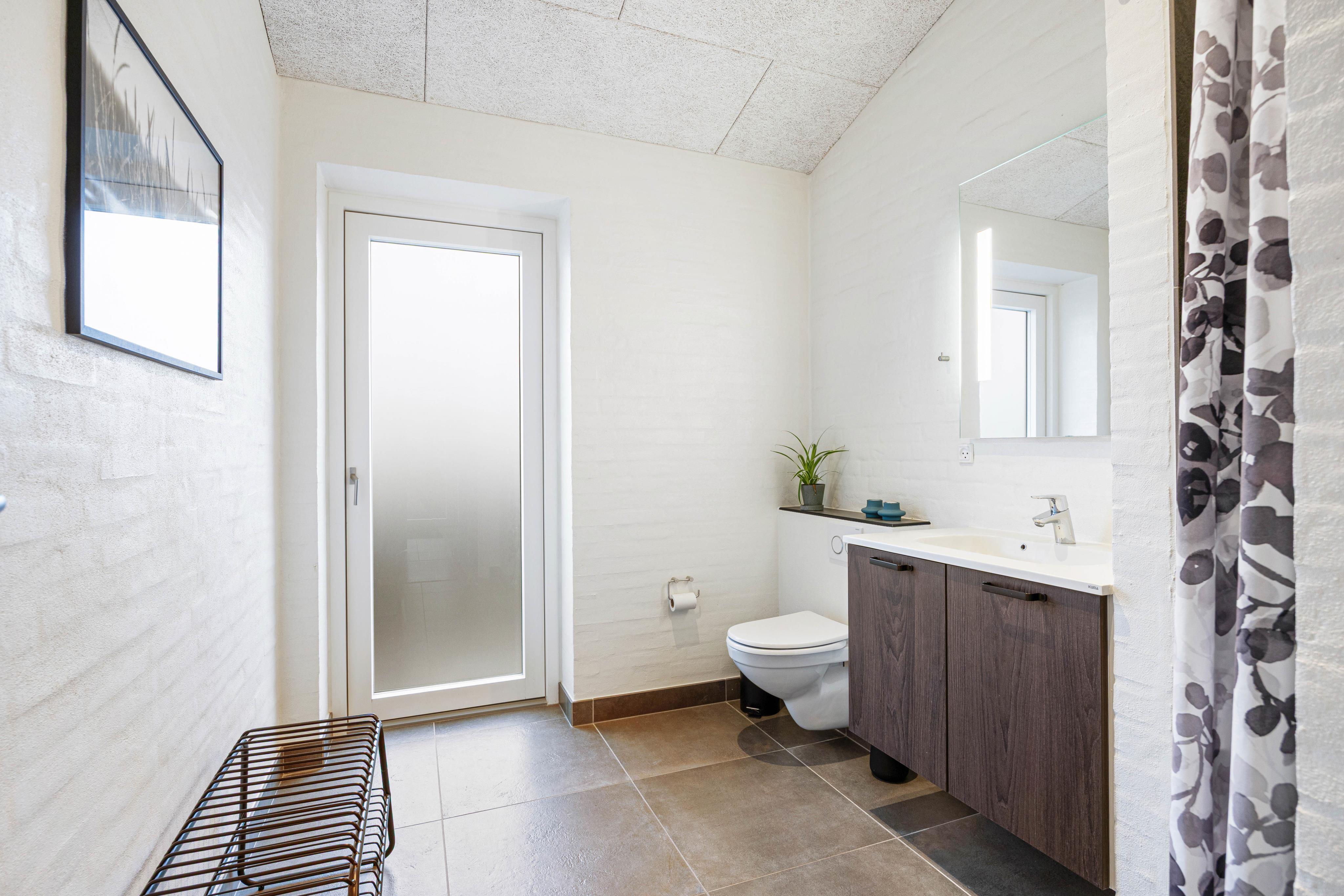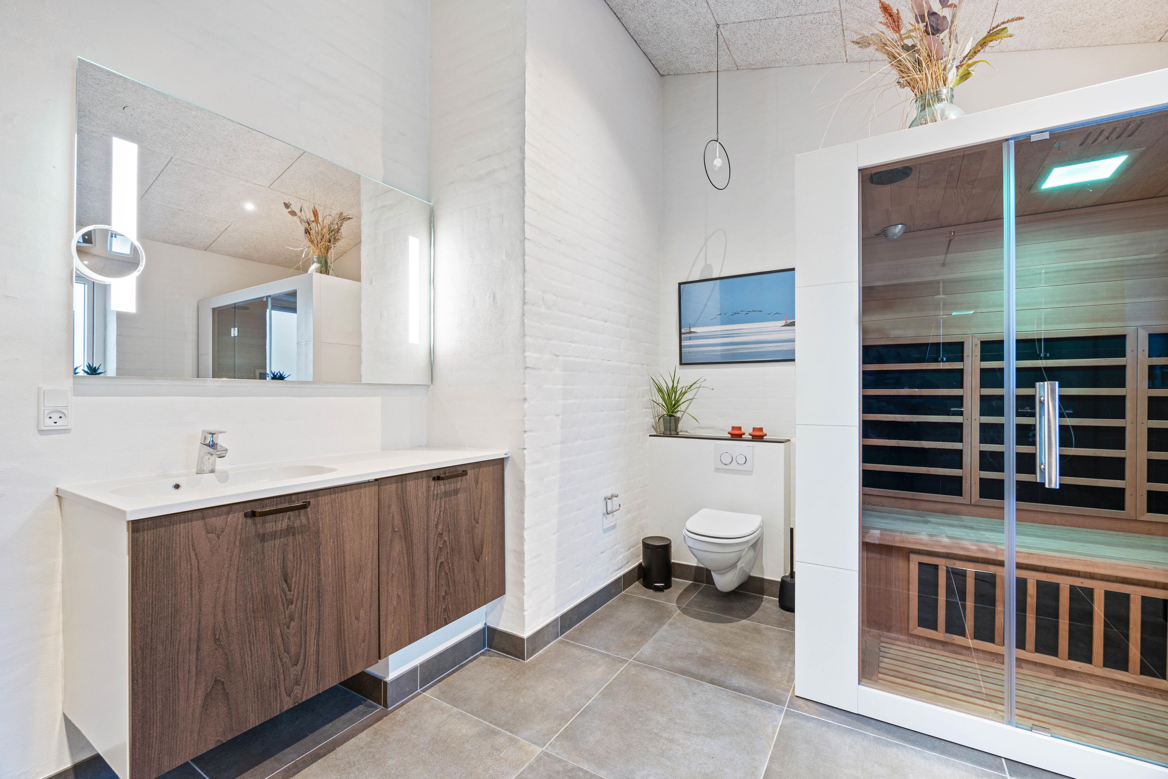 Badeværelserne er flotte og praktisk indrettede. Det største har, udover en lækker dobbeltbruser, også infrarød sauna, hvor man kan slappe af efter en lang dag i klitterne.