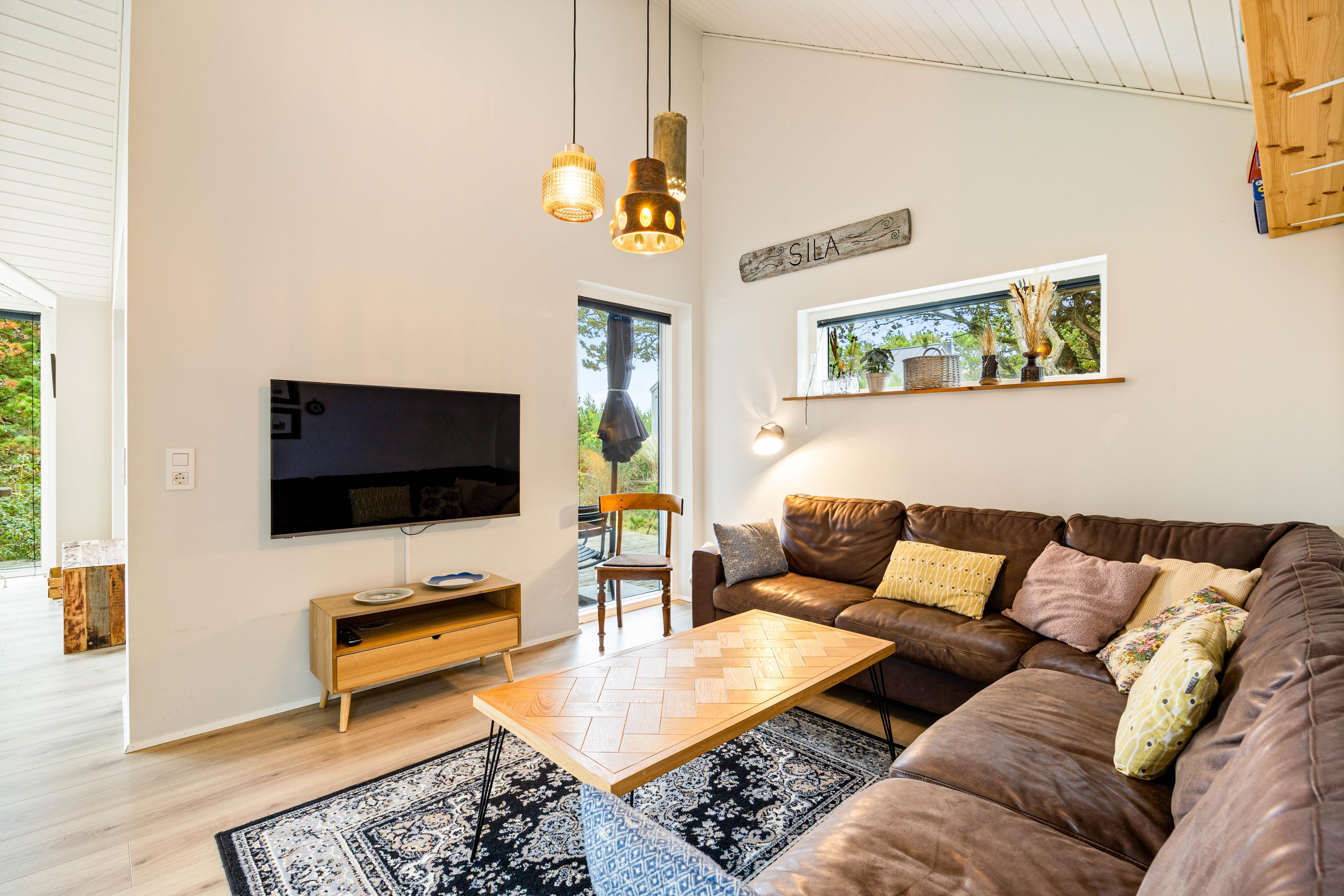 Sommerhusets hjerte er det store hyggelige opholdsrum, hvor der ligesom i resten af huset, er åbent op til kip. De store vinduespartier mod sydøst inviterer lyset og den storslåede udsigt helt ind i huset.