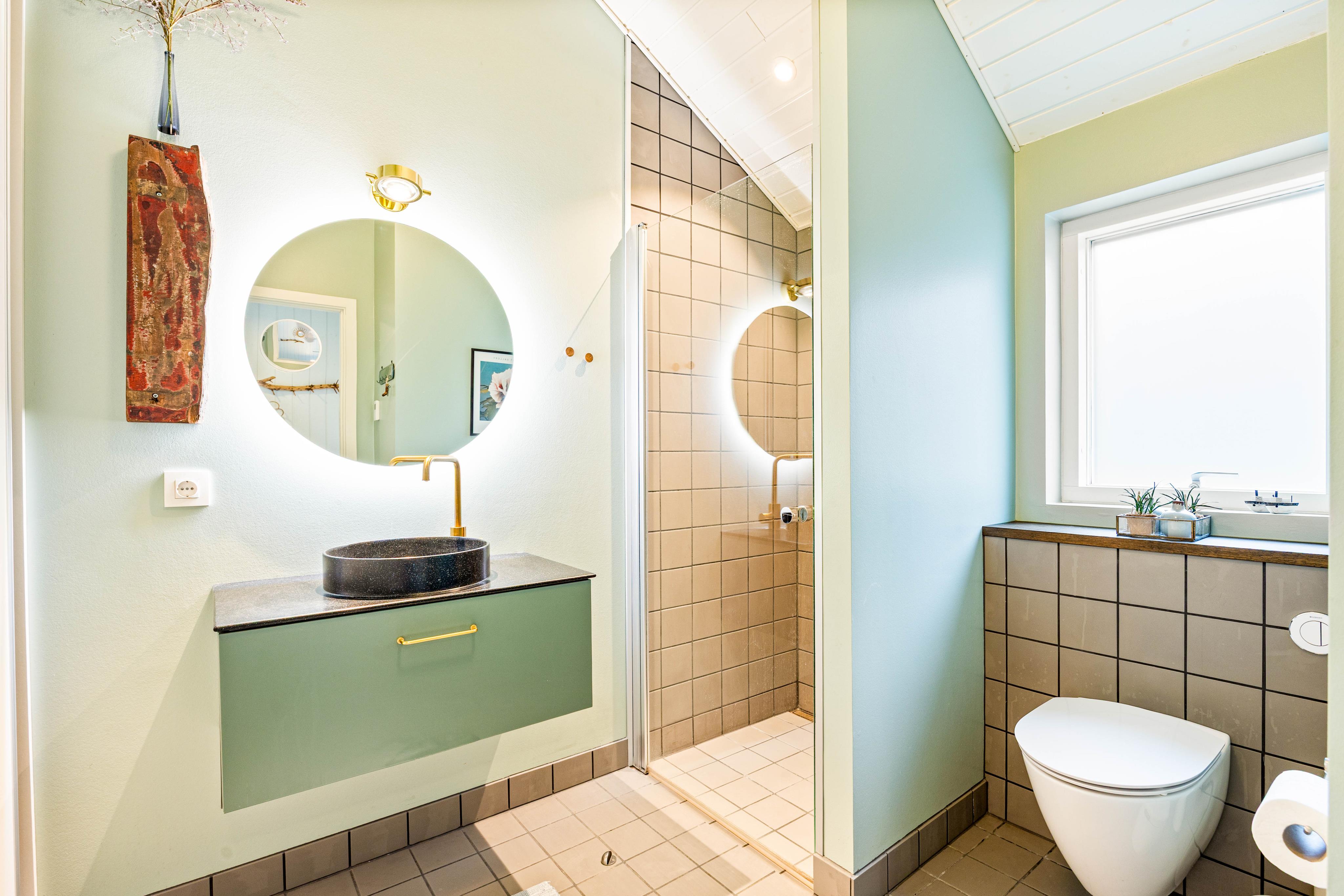 Badeværelset er smart indrettet - bl.a. med en væg med skydedøre. Her finder I ekstra opbevaringsplads, samt vaskemaskine og tørretumbler, som er med til at gøre feriepakningen lettere.