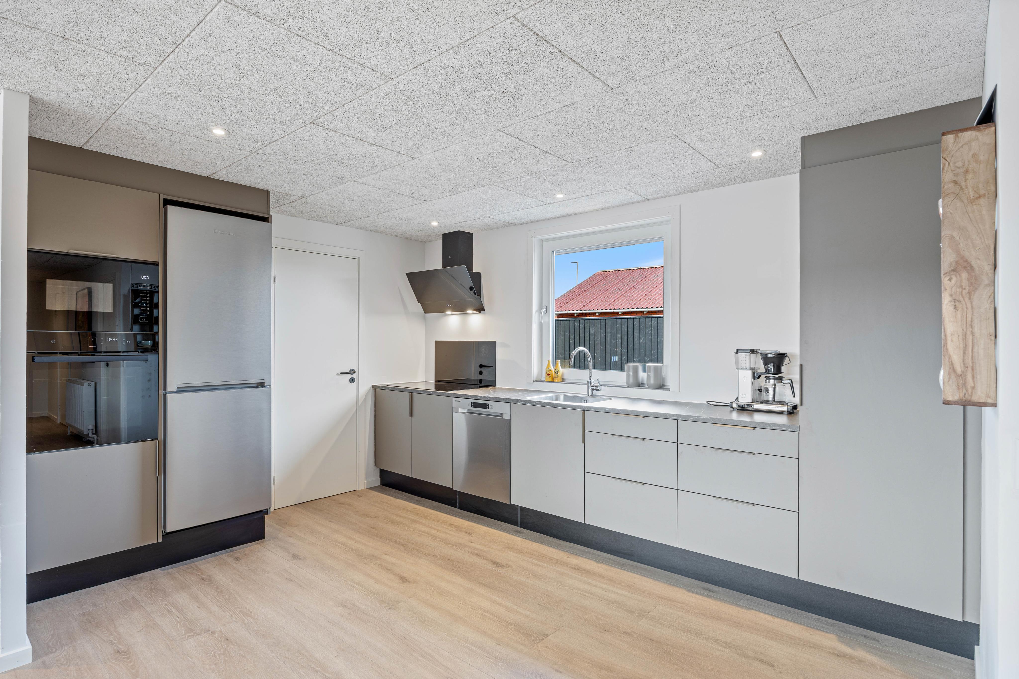 Feriehuset byder på et dejligt køkken, som er fuldt udstyret med både opvaskemaskine, ovn og mikroovn, så der er plads til fælles madlavning og hyggelige måltider. I stuen skaber de store vinduespartier et lyst og åbent rum - her kan I læne jer tilbage i sofaen og slappe af efter en dejlig dag ved stranden.