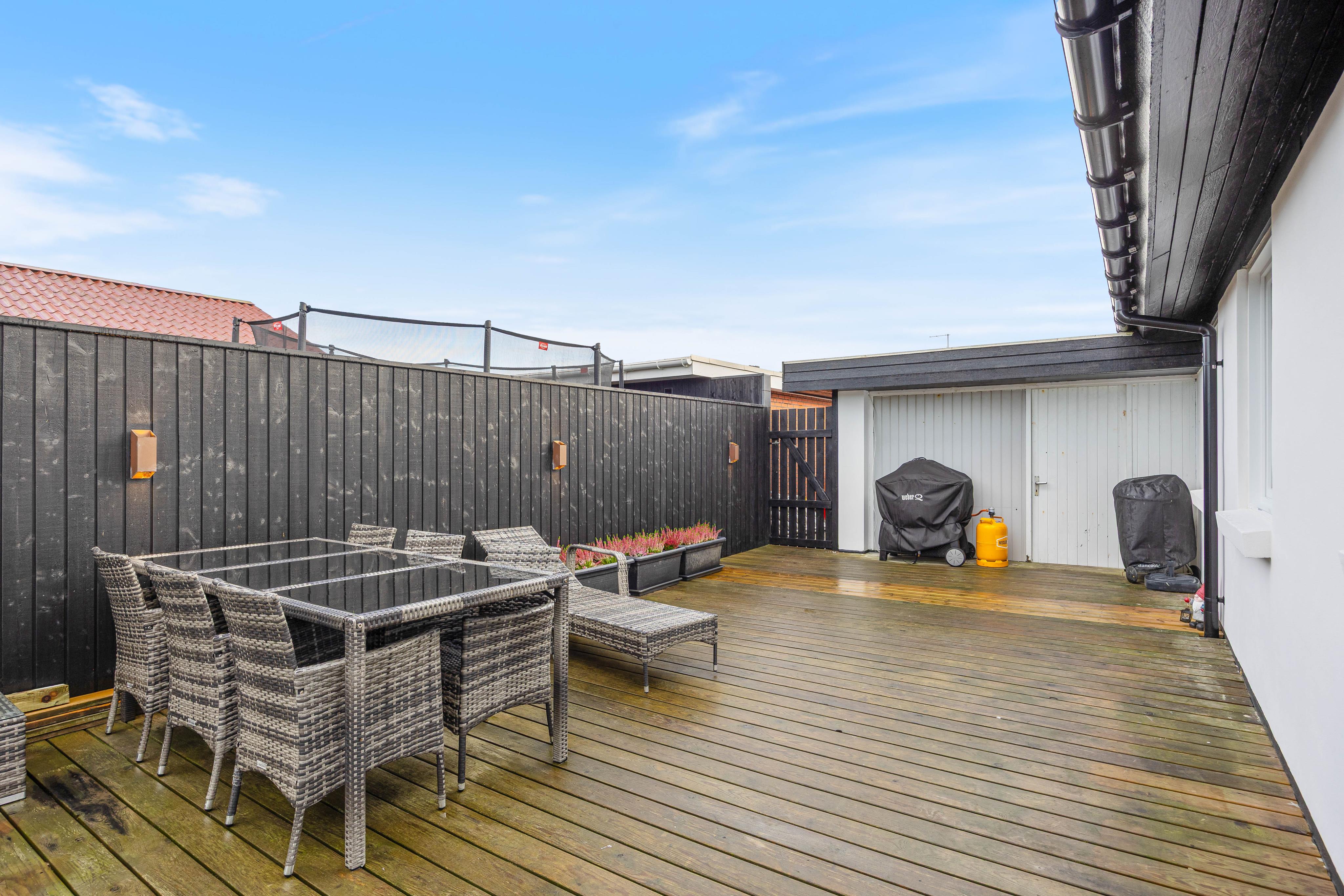 Udendørs byder sommerhuset på en dejlig terrasse, hvor I kan sidde uforstyrret og nyde ferien. Terrassen er ideel til morgenkaffen eller en god bog i solen, og om aften kan I finde grillen frem og nyde en hyggelig aften i det fri.