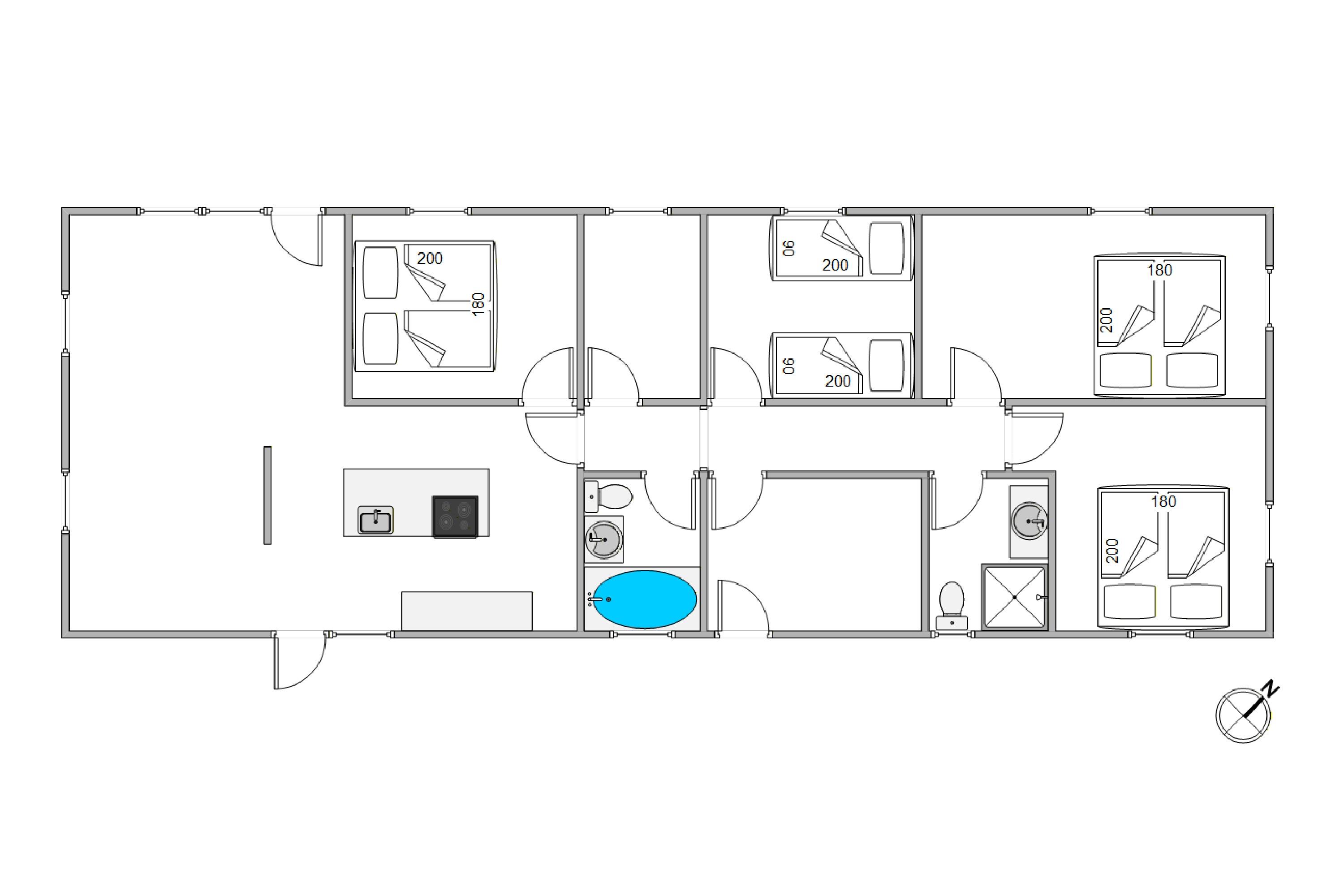 Stort rummeligt feriehus med fantastisk opholdsområde, stort spisebord og køkkenø. Fire dobbeltsengs-soveværelser, to af dem med store høje boksmadrasser. Et badeværelse med bruser og bruseforhæng, hvor vandet løber rigtig godt. Et badeværelse med badekar til børnene. I den kolde årstid godt til opvarmning. I indgangsområdet er der nok plads til jakker og sko.