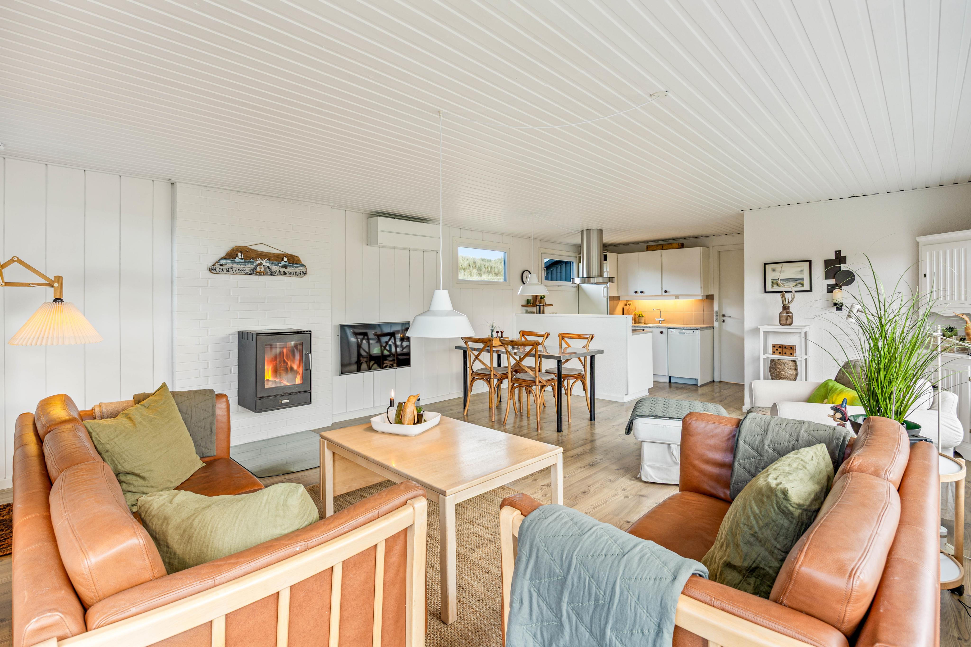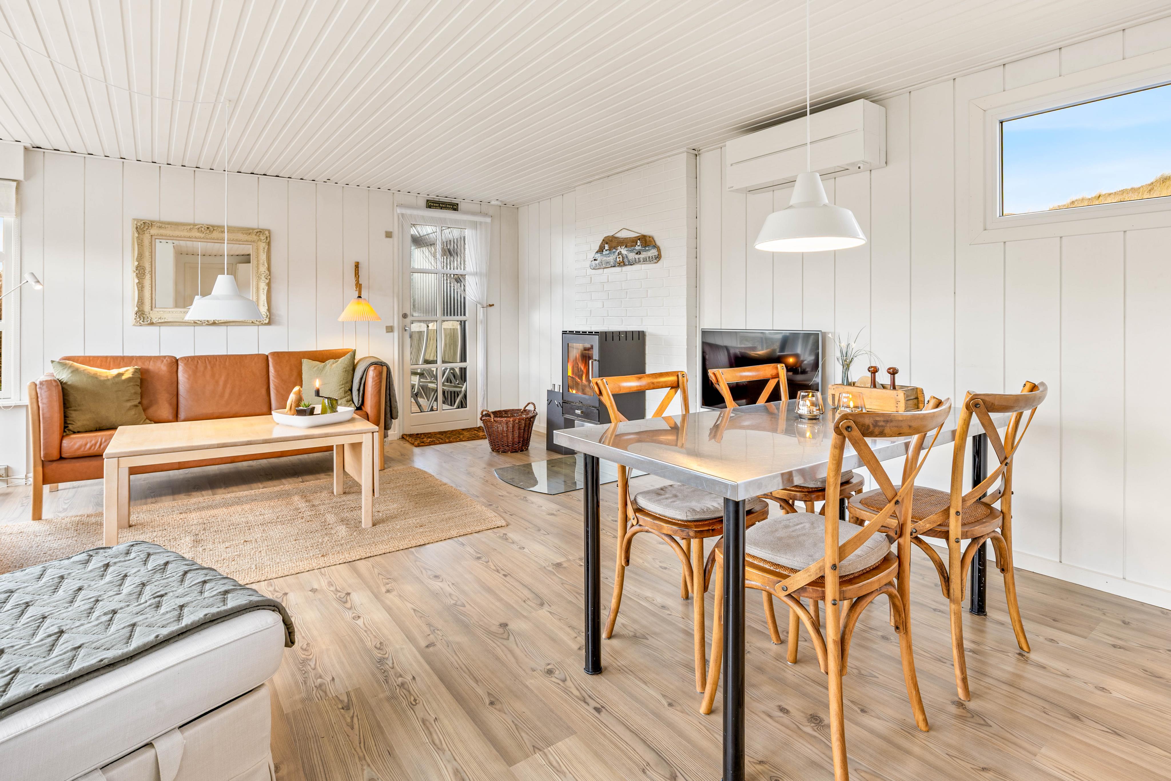 Sommerhuset har plads til 4 personer fordelt på 3 soveværelser og rummer alt, hvad I har brug for til en afslappende ferie. Den lyse opholdsstue har en brændeovn, der spreder varme og hygge på kølige dage, mens varmepumpen sikrer en behagelig indetemperatur året rundt.