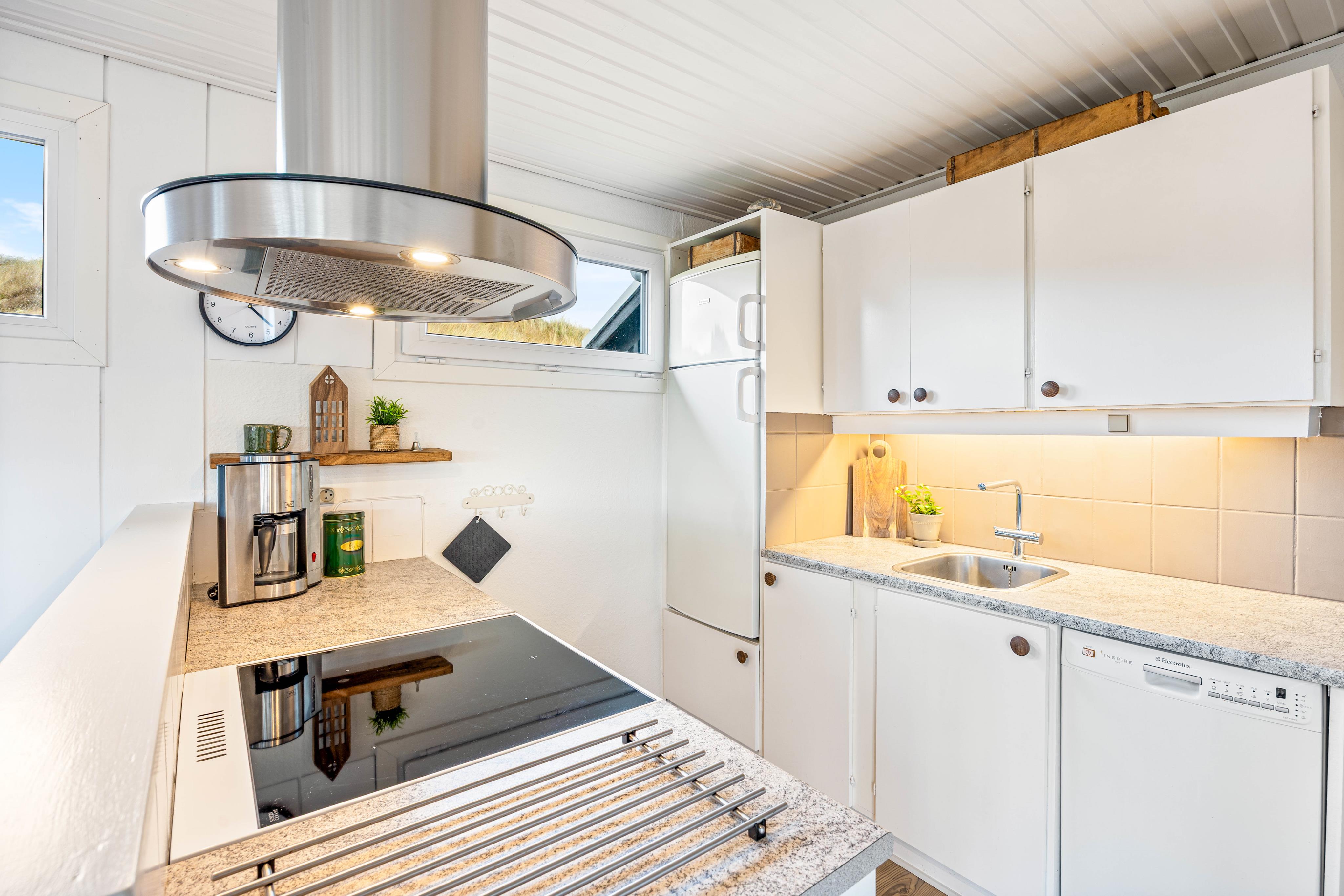 I åben forbindelse med stuen ligger køkkenet, som blandt andet er udstyret med opvaskemaskine, så I kan spare tid på opvasken og i stedet slappe af sammen. Hvis I får brug for at vaske jeres tøj under ferien, finder I både en vaskemaskine og tørretumbler i sommerhuset.