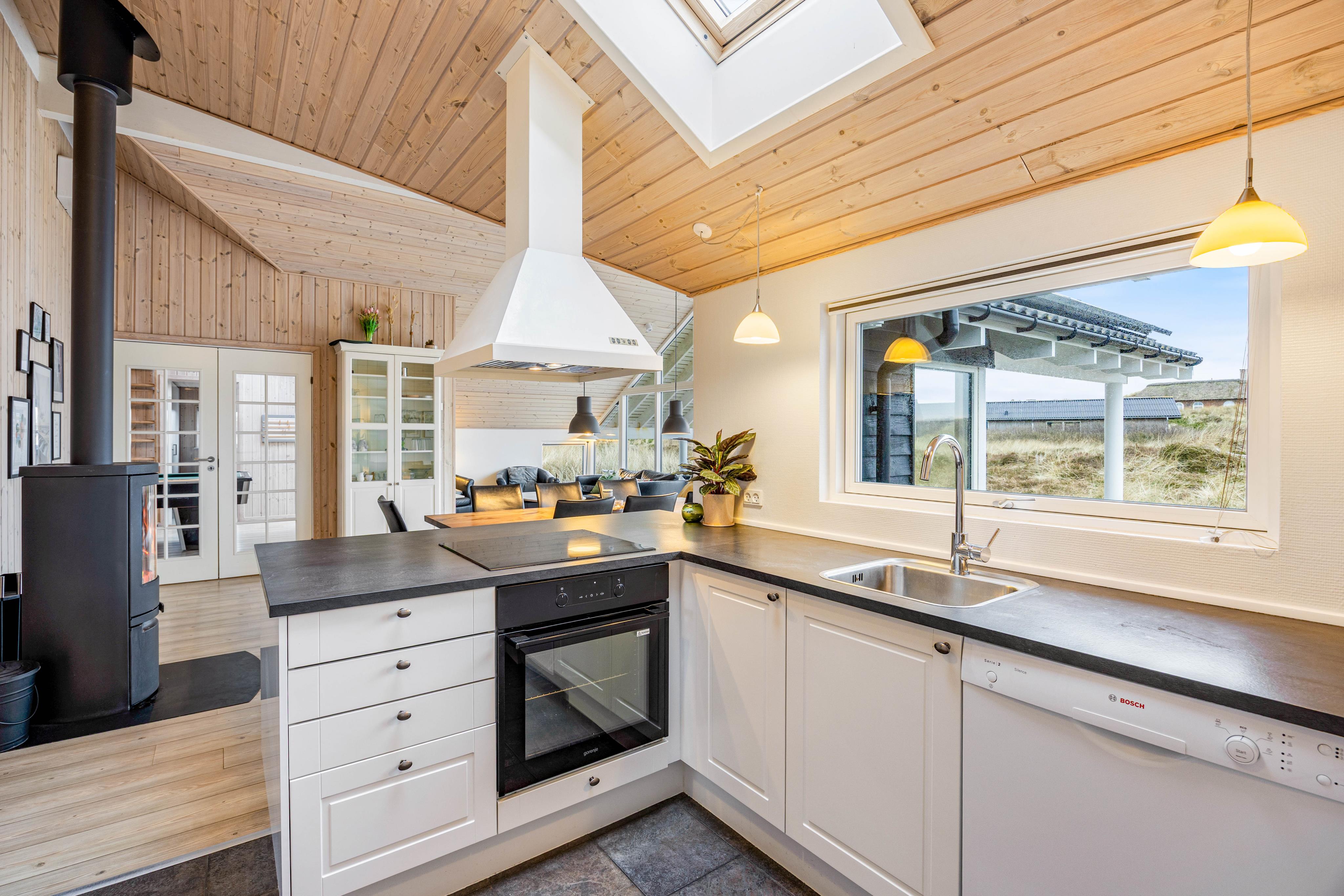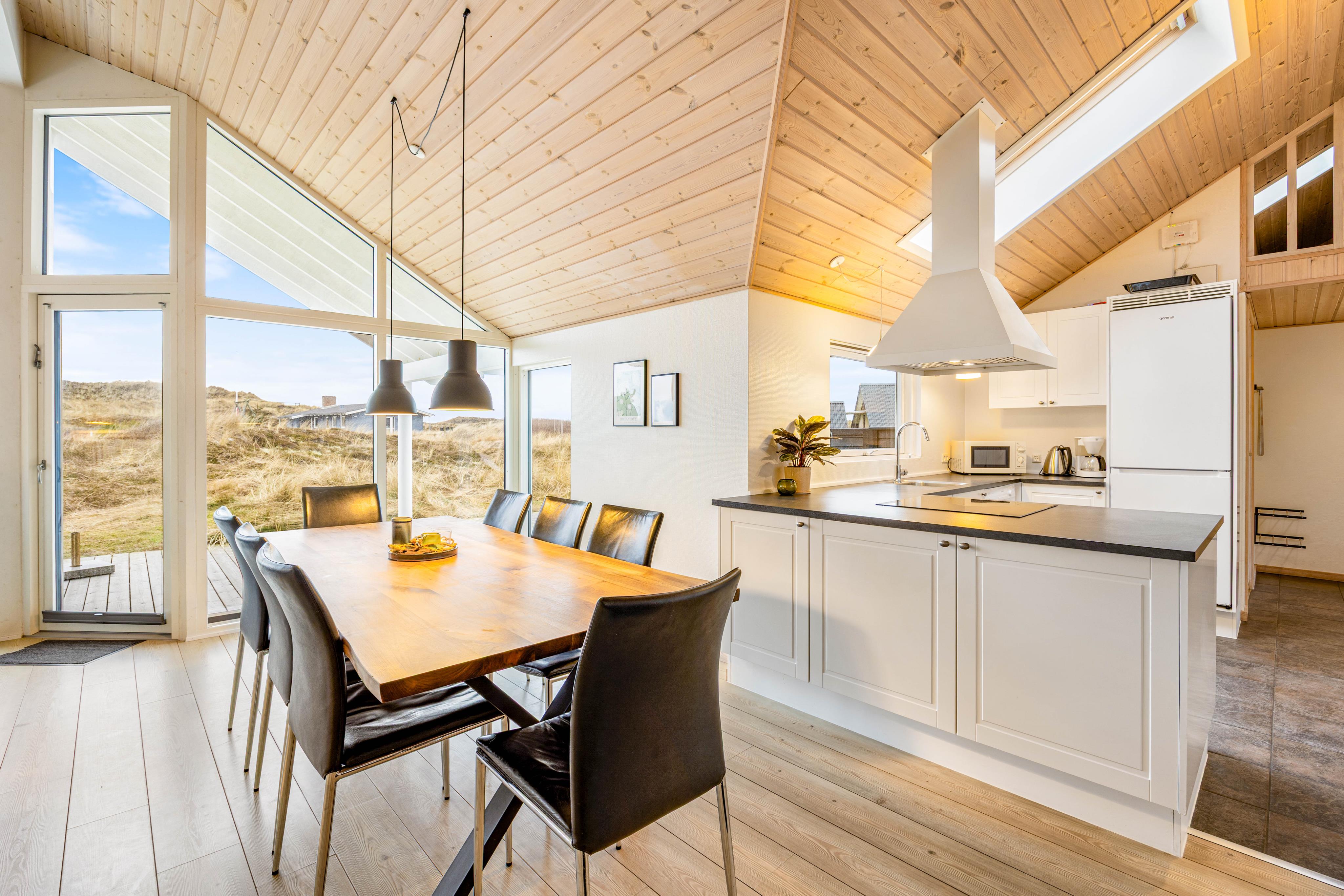 Huset er rummeligt og gennemtænkt udformet, således at man på en ferie med 8 personer har plads til at være sammen men også tilstrækkelige tilbagetrækningsmuligheder. Smuk og lys stue-/spisestue-køkkenområde med smuk udsigt til klitterne, ovn, et fantastisk aktivitetsrum med billard og bordtennis, tilstrækkeligt store soveværelser og hyggelig hems. Godt og nyt badeværelse og køkken, praktisk husholdningsrum med vaskemaskine og tørretumbler. Ny og stilfuld indretning – og terrassen er kæmpestor! Man går på få minutter over klitkammen til havet for at bade eller til lange gåture – med eller uden hund. Et sommerhus til en vidunderlig Nordsøferie!