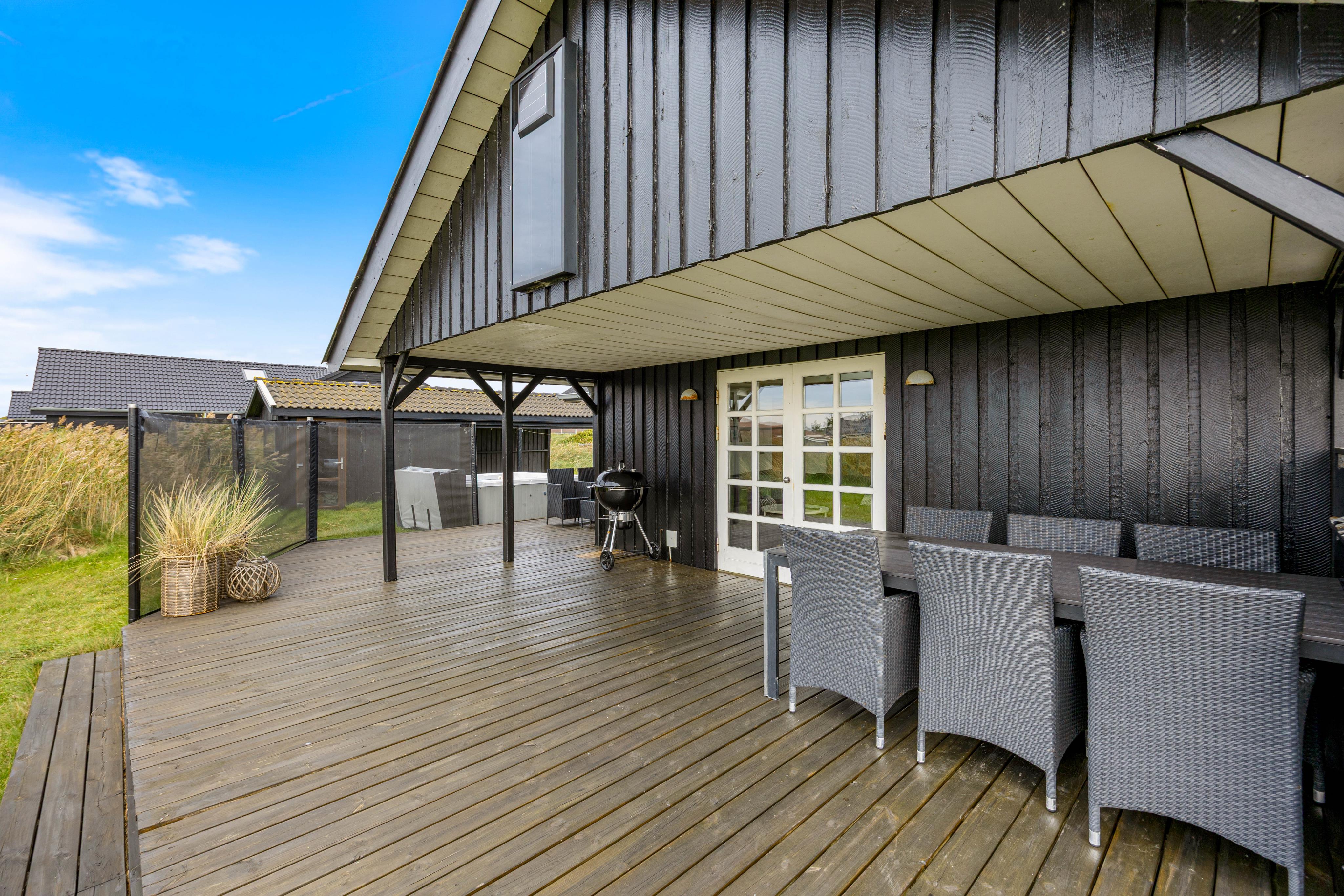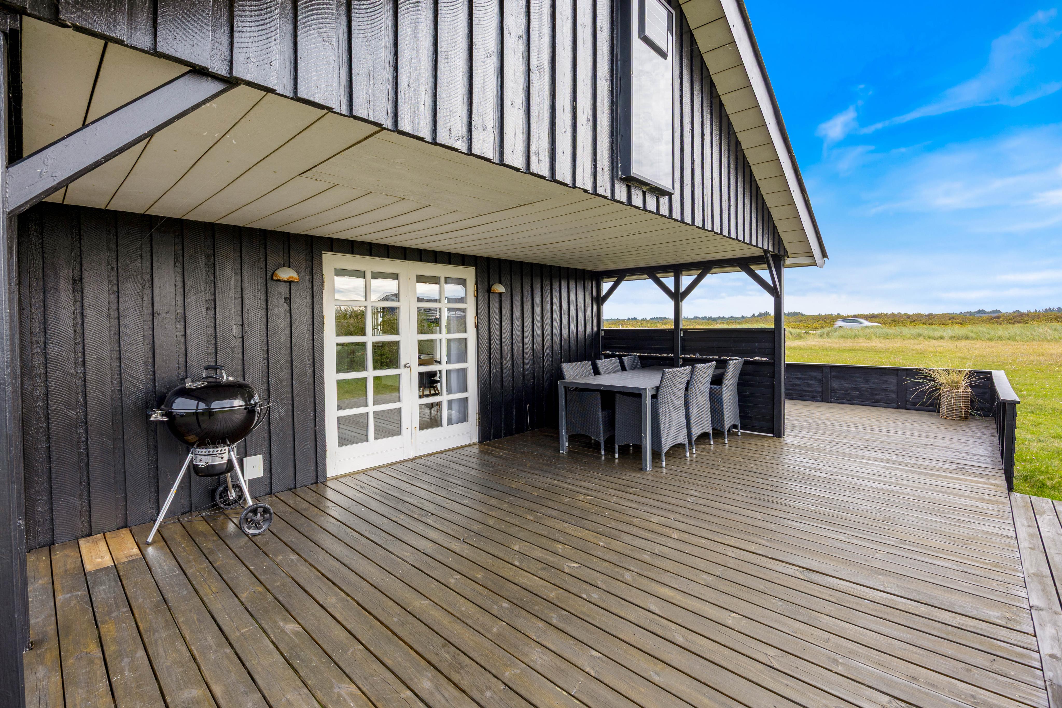 Fra stuen kommer I ud på den store træterrasse, der fortsætter næsten hele vejen rundt om huset. Her er der flere små hyggekroge og gode havemøbler, hvor I kan nyde de varme solskinsdage. Med afskærmningen får I god læ, selv på de blæsende dage. Terrassen er fuld af forskellige hyggekroge hele vejen rundt om huset der gør, at I uanset vind og vejr og tidspunkt på dagen kan nyde den friske vestenvind og eventuelle solstråler.