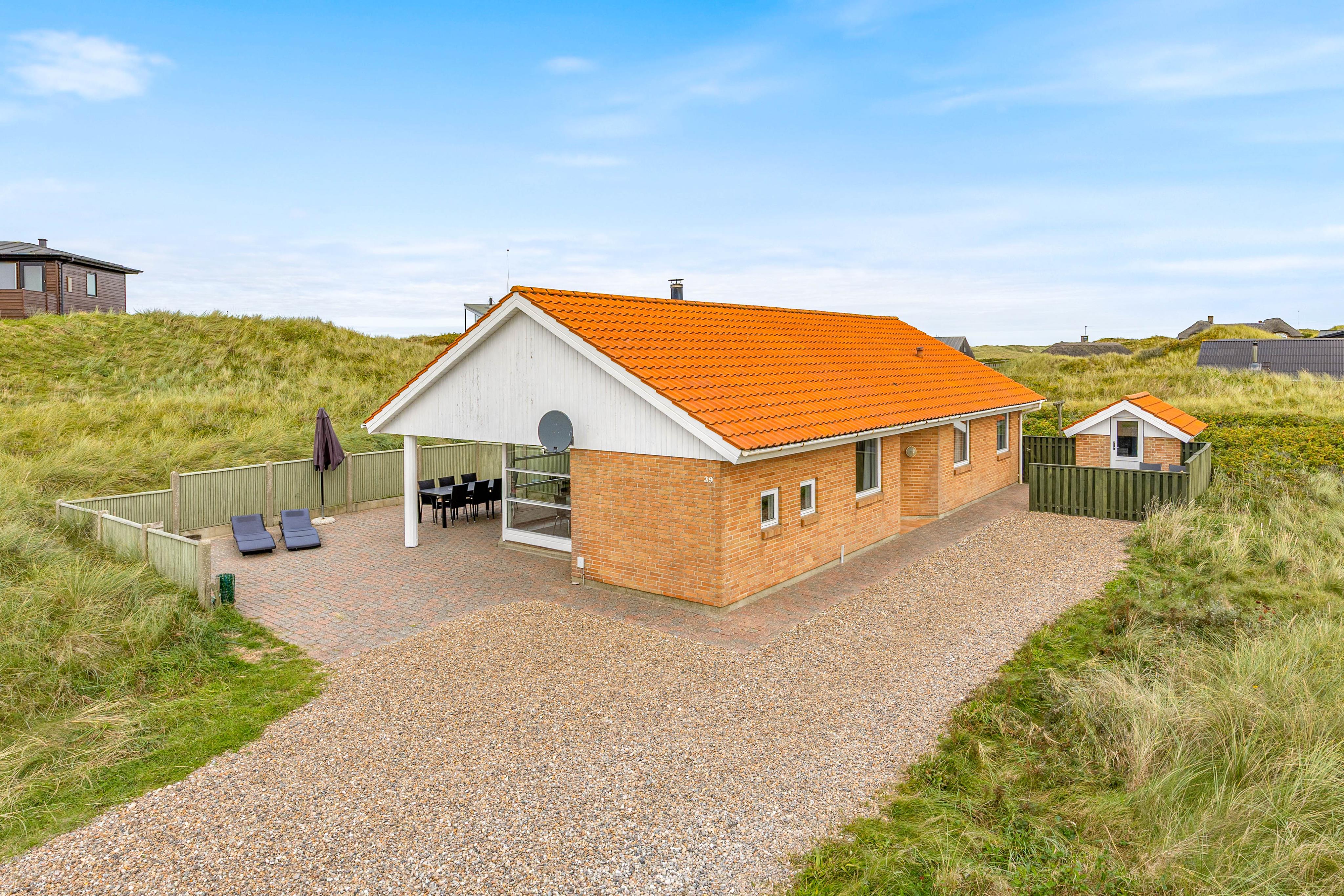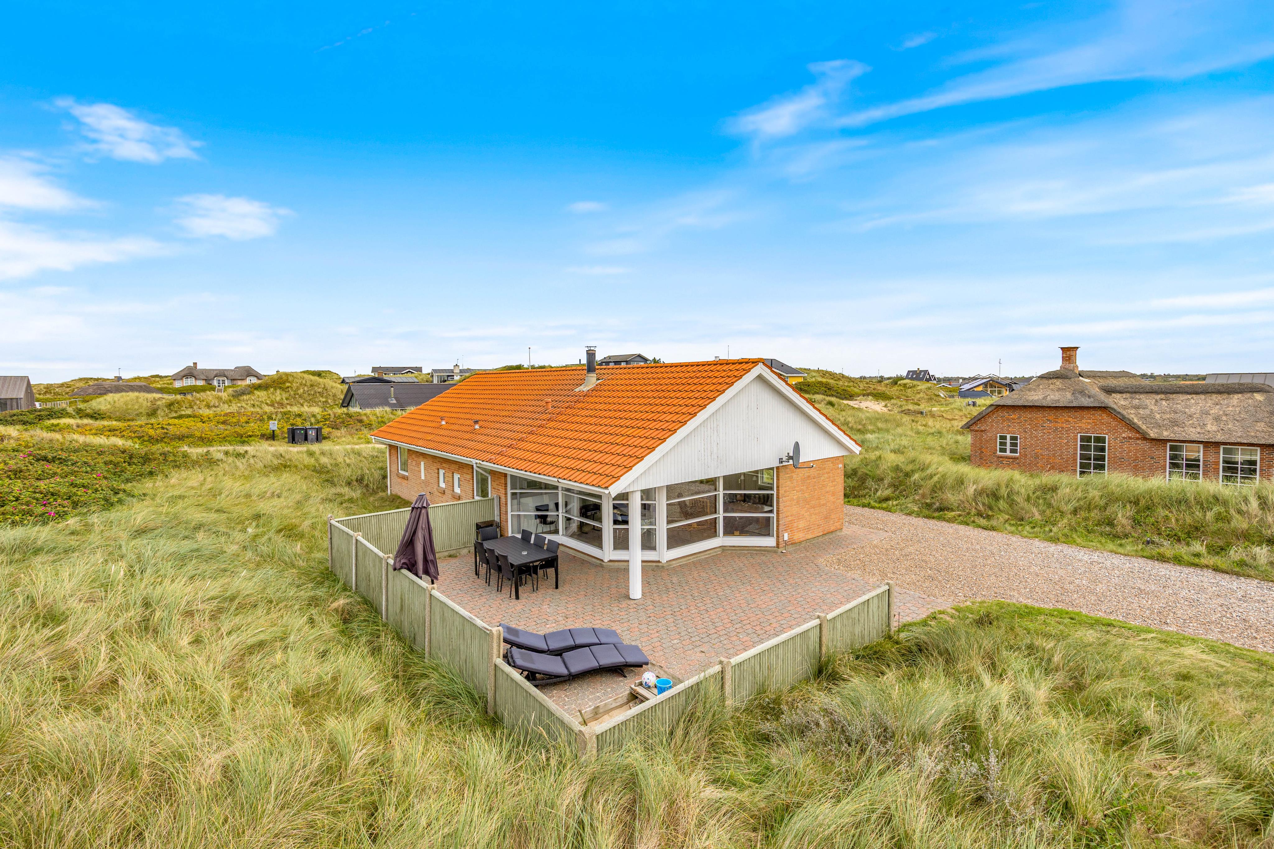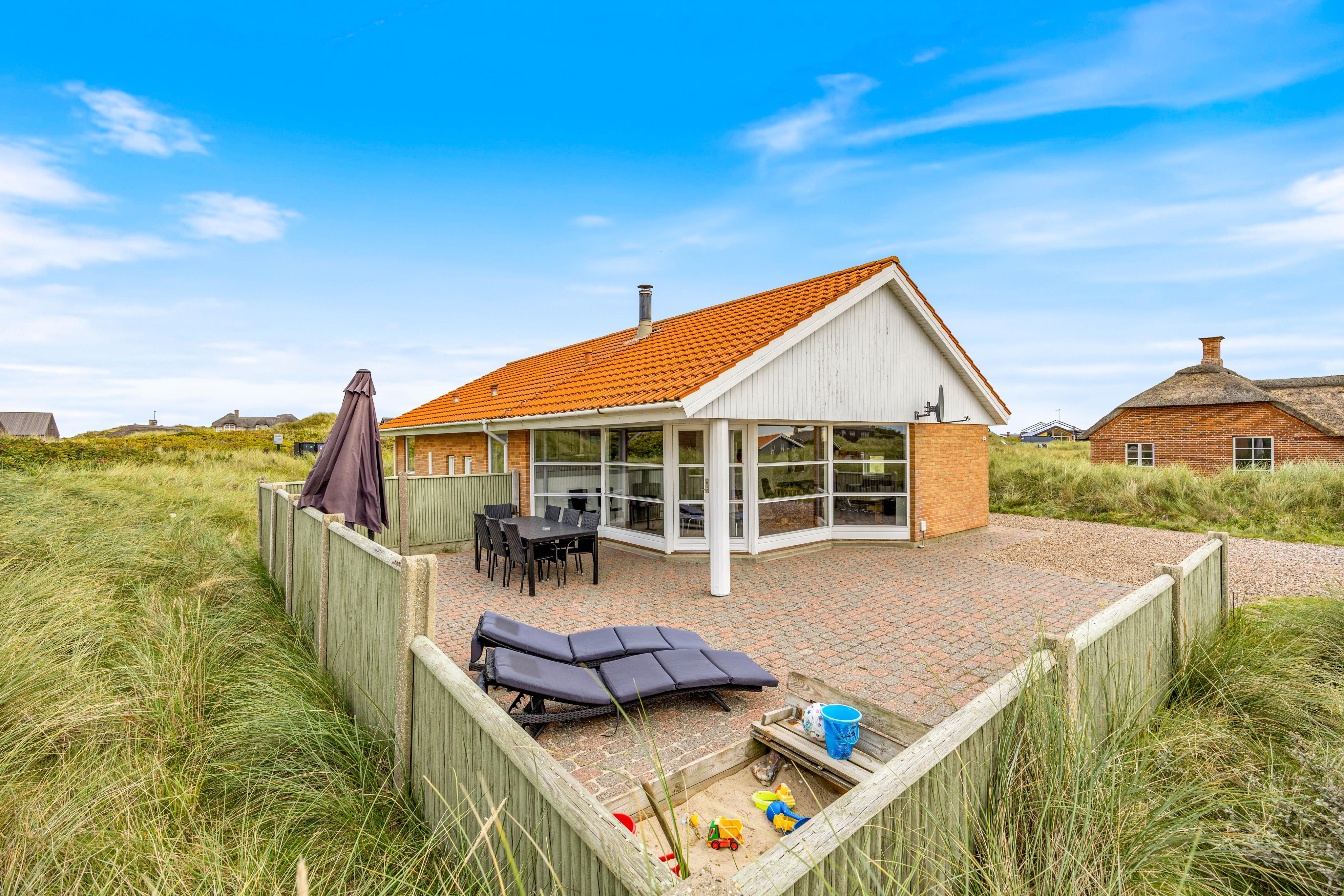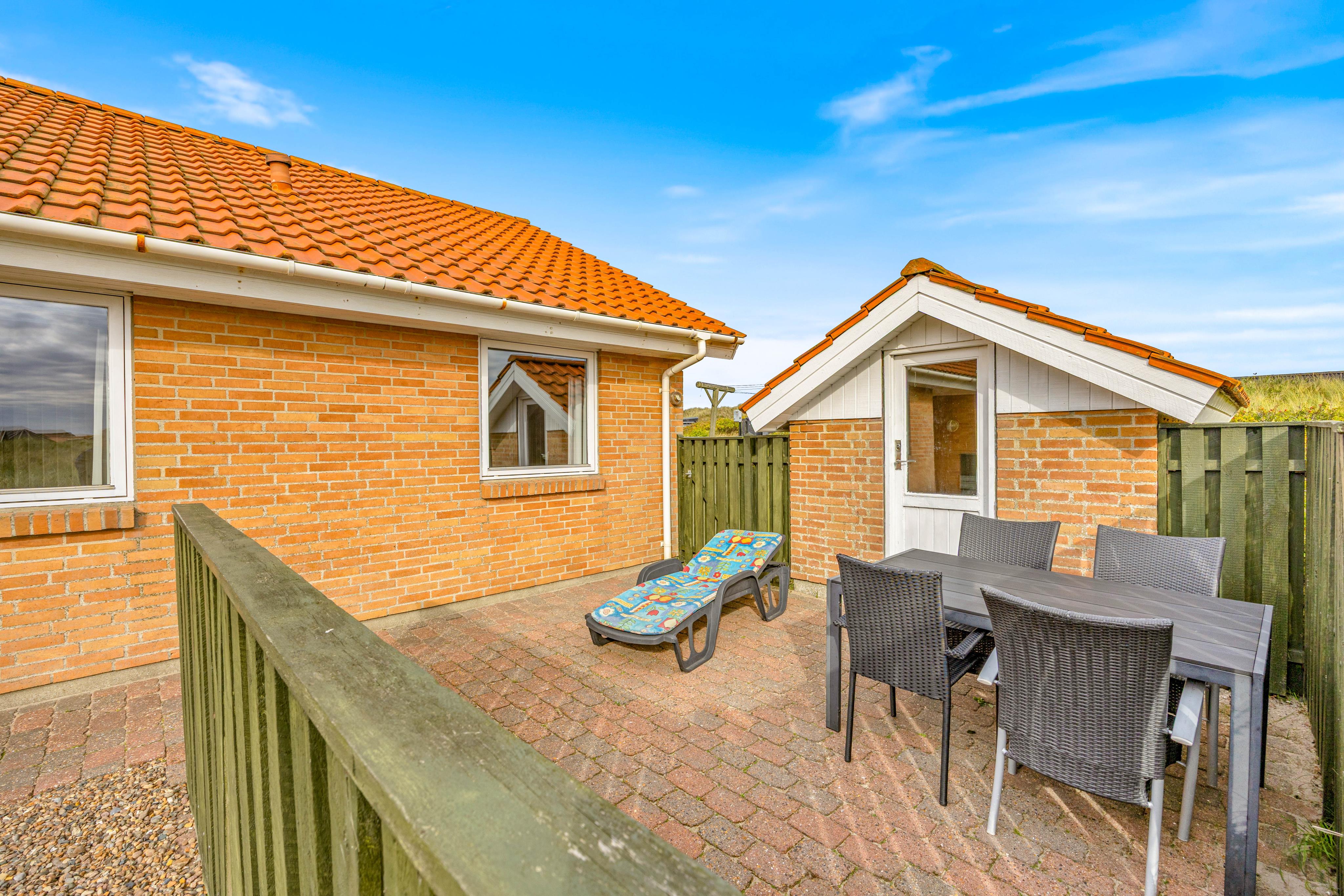 Huset har en stor, delvist afskærmet terrasse hvor man bare kan nyde duften af Vesterhavet, som kun ligger 150 meter væk. Udeområdet indbyder til masser af sjov og afslapning. En afskærmet terrasse komplet med grill og havemøbler venter på jer, så I kan nyde de varme sommeraftener under åben himmel. Børnene vil elske sandkassen på den naturlige grund, og hvis I har søde firbenede familiemedlemmer, er de også velkomne - dog er maksimalt to husdyr tilladt.