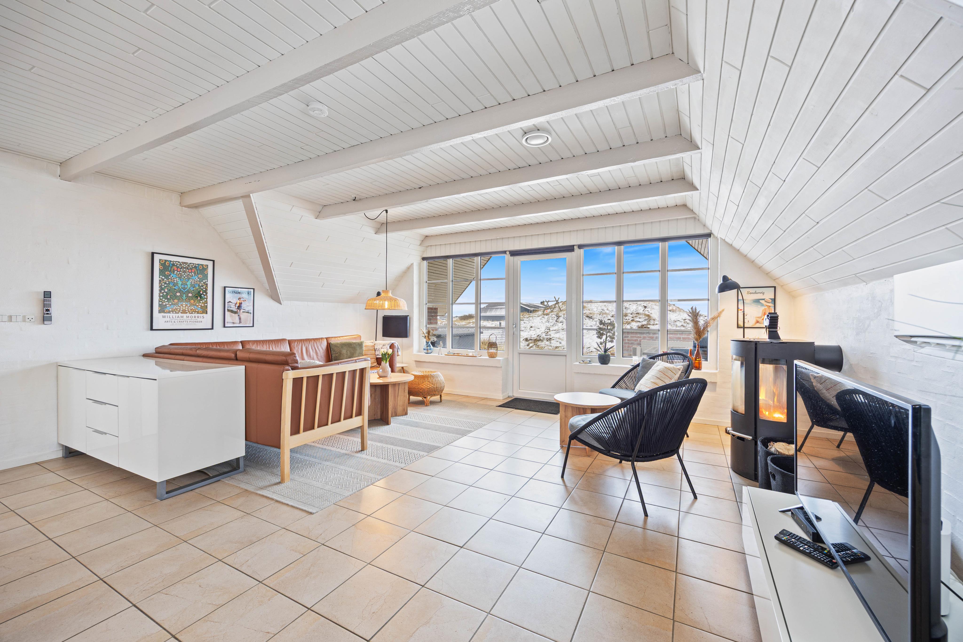 Dette velindrettede sommerhus i Søndervig byder på en skøn brændeovn, der sikrer hyggelige aftener i samvær med dem, I elsker. Sommerhuset har med sine 3 gode soveværelser plads til 6 personer. To af værelserne er med dobbeltsenge og det tredje med køjesenge til børnene. Sommerhuset har et dejligt, lyst badeværelse med gulvvarme, bruseniche og indgang til sauna. I den hyggeligt møblerede stue er der faste tæpper på gulvene og en dejlig brændeovn til kølige dage.
