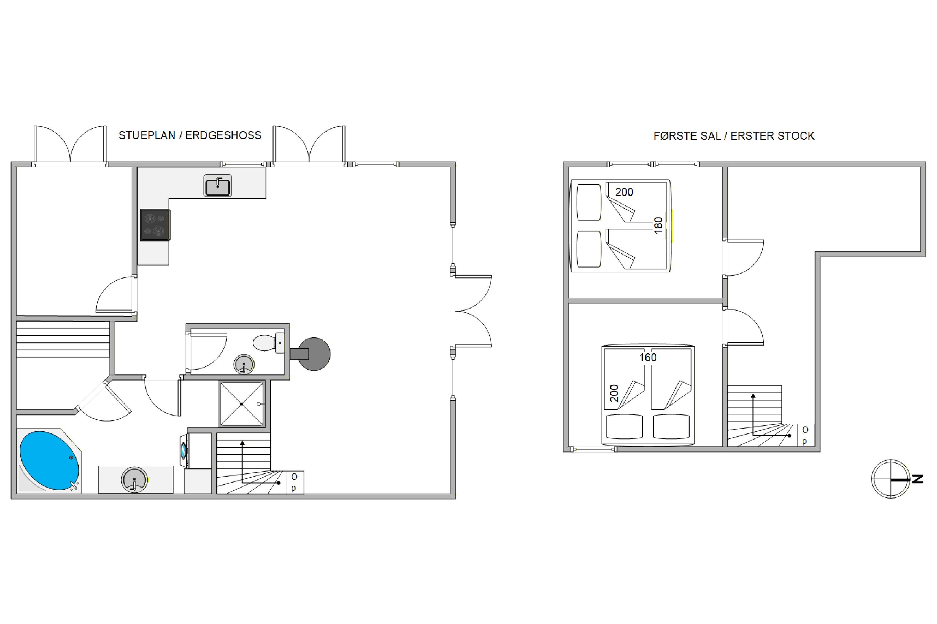I stueplan finder I køkkenet, som ligger i åben forbindelse med spiseplads og stue - lejlighedens centrale rum, som bringer hele familien sammen. Dertil kommer det store badeværelse med sauna og spabad samt et gæstetoilet, begge med gulvvarme. Her kan I nyde godt af lidt ekstra wellness efter en lang spadseretur i den friske havluft.