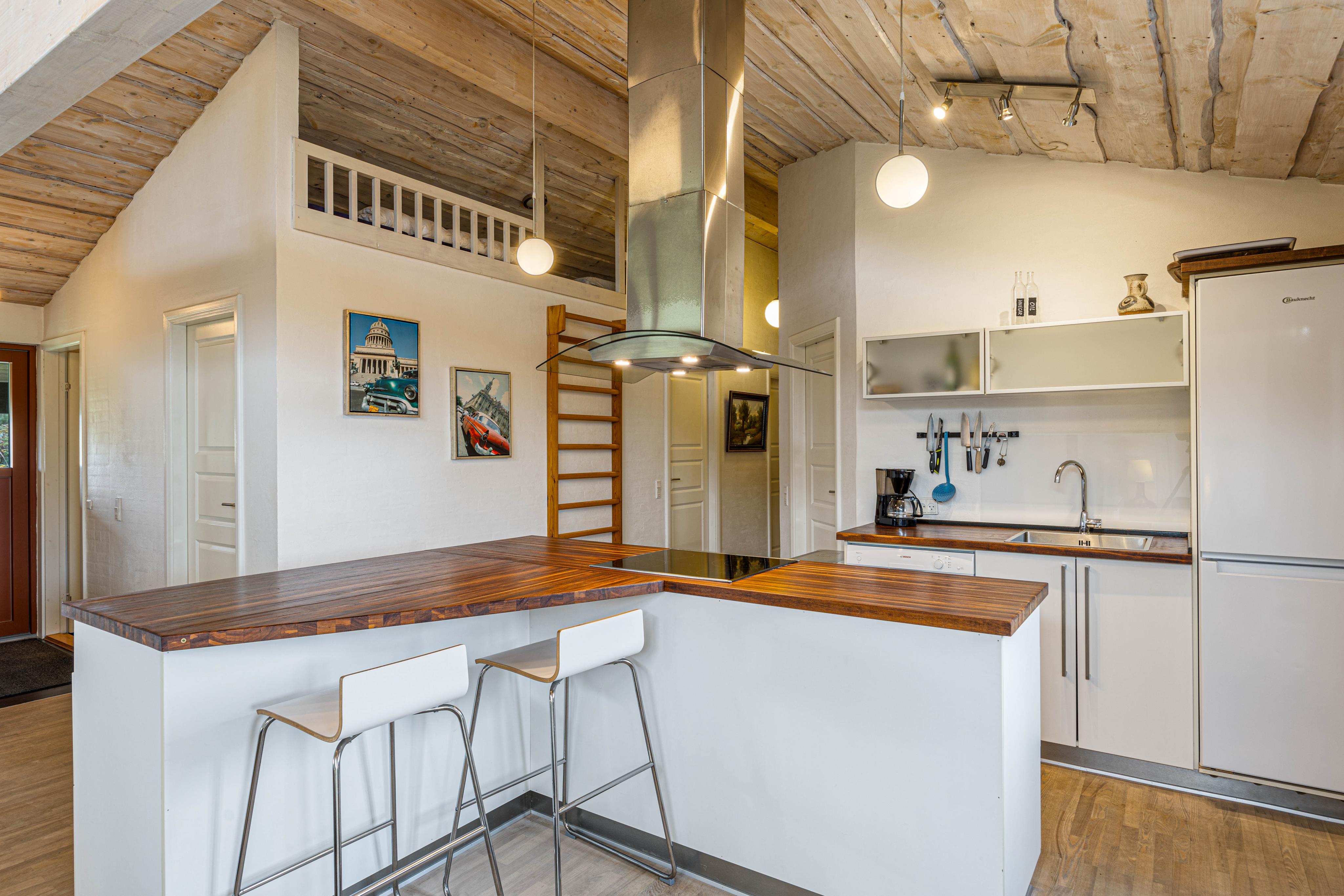 Et highlight er bestemt det flotte køkkenalrum med nedsænket stue og spiseafdeling. Her er højt til loftet og et fantastisk lysindfald fra de mange vinduer, og det moderne interiør skaber flotte farvekontraster. Der er sørget for flere små hyggelige siddekroge, hvor I kan læne jer tilbage med en god bog og nyde feriefreden med en god kop kaffe.