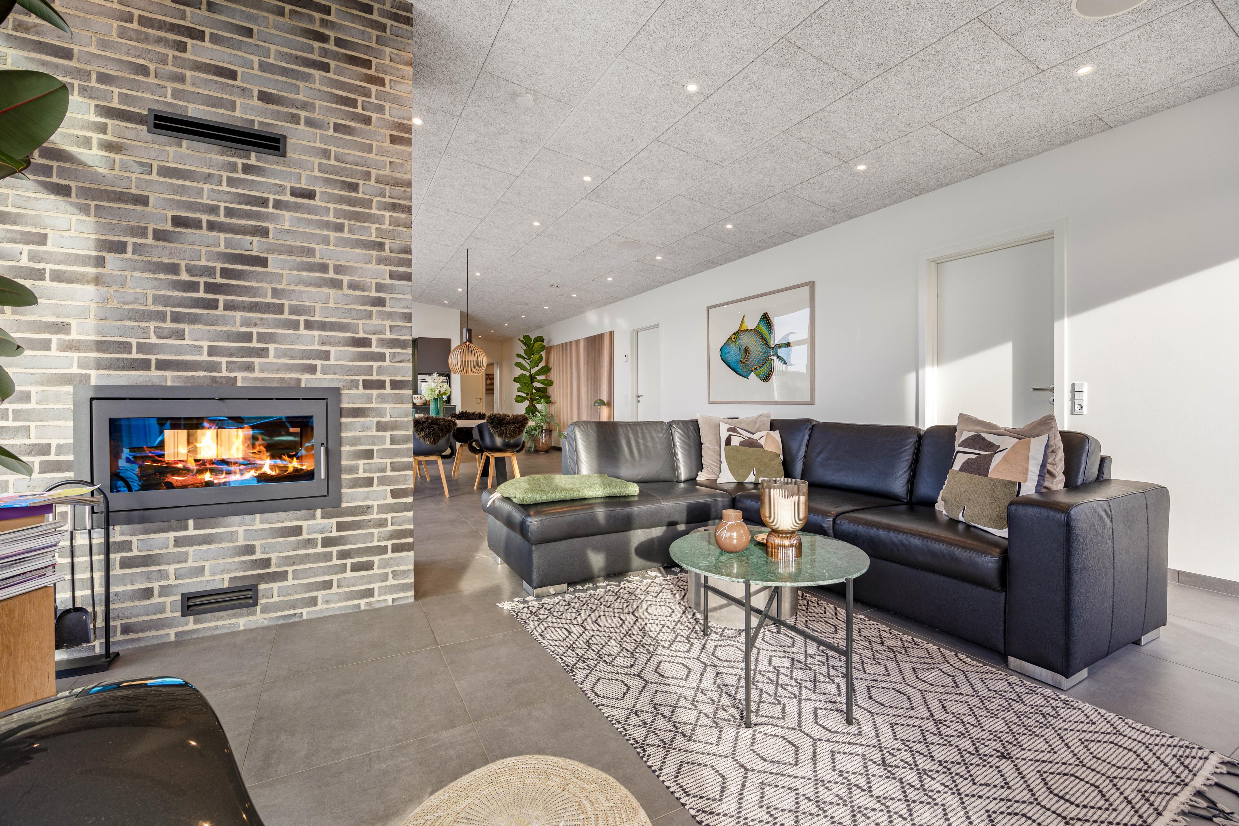 Feriehuset troner nærmest over Søndervig. Udsigten over havet fra spisebordet og terrassen var vidunderlig. Hyggen opstår gennem pejsen, der giver indsigt fra to sider.