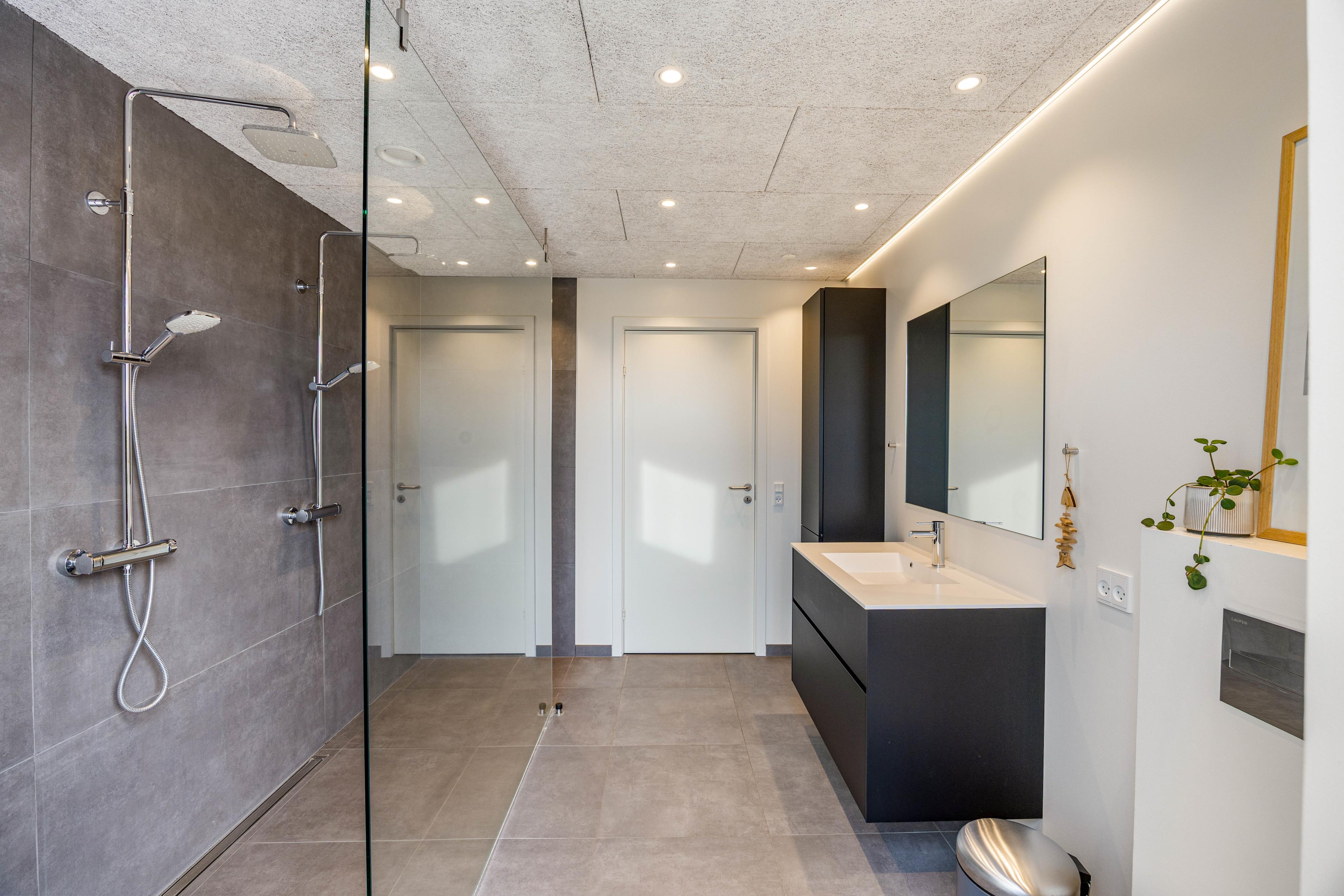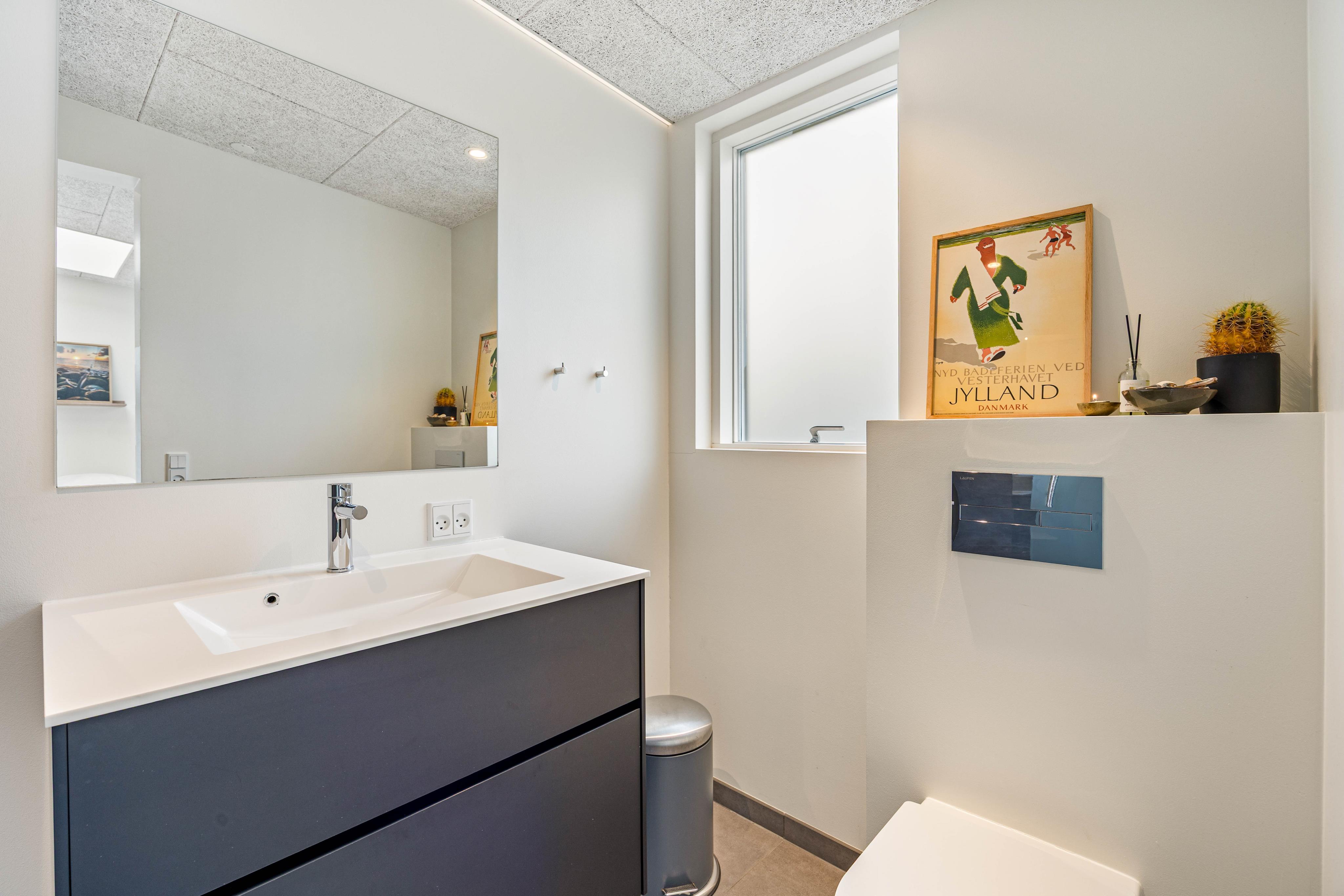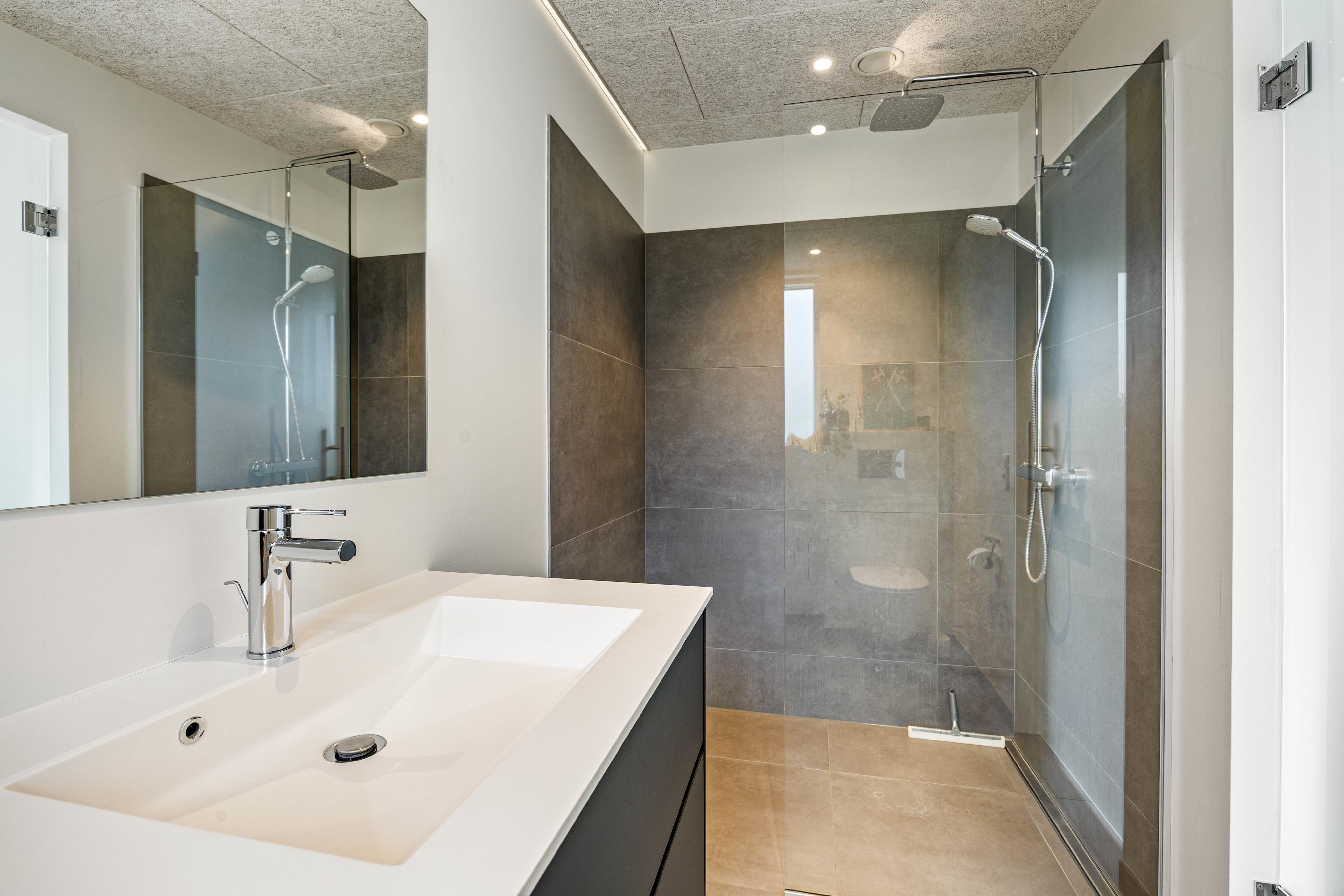 Ud over de 3 badeværelser i forlængelse af soveværelserne rummer sommerhuset desuden et ekstra badeværelse med dobbeltbruser. De i alt 4 badeværelser er selvfølgelig alle udstyret med gulvvarme, ligesom der er gulvvarme i opholdsrummet.