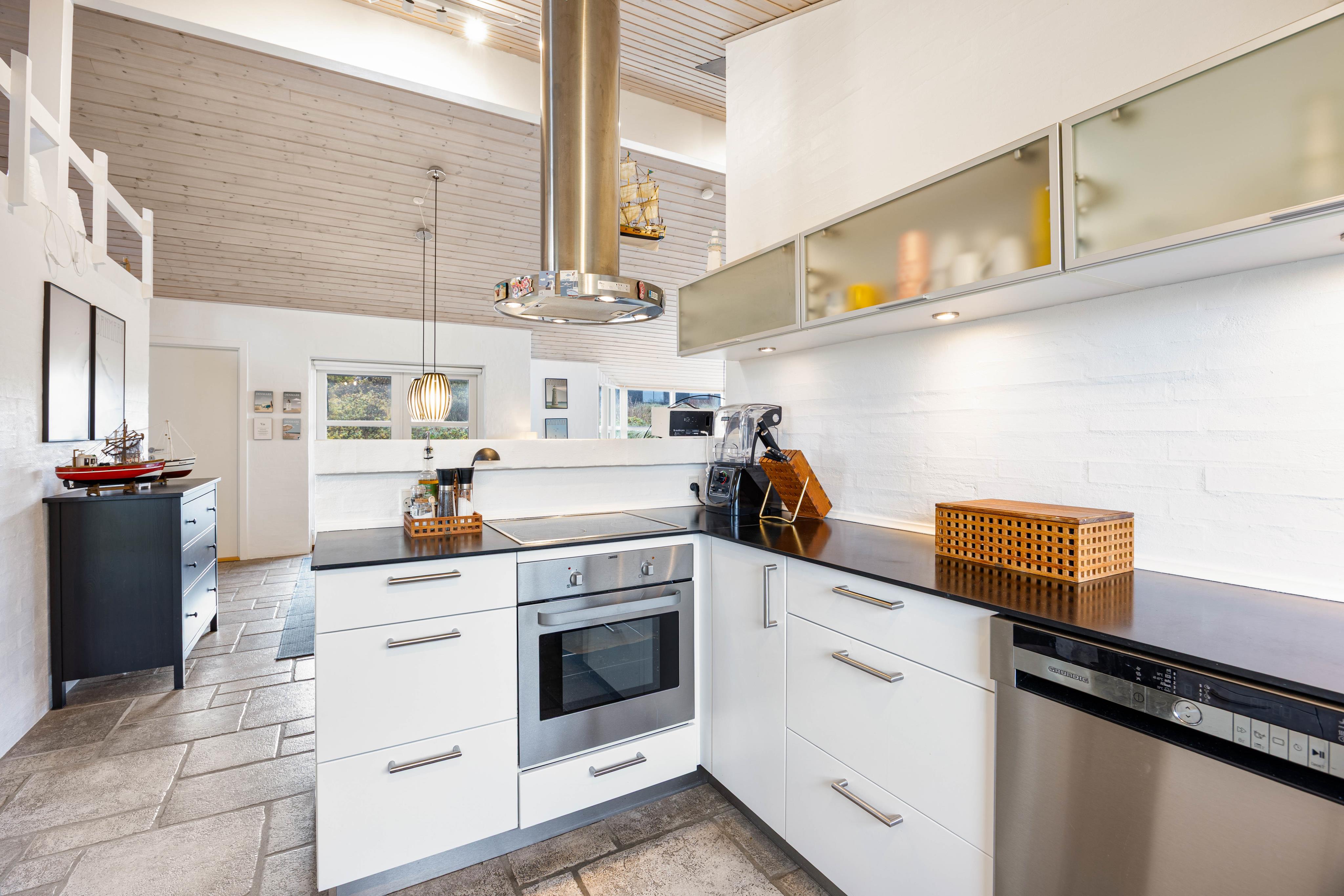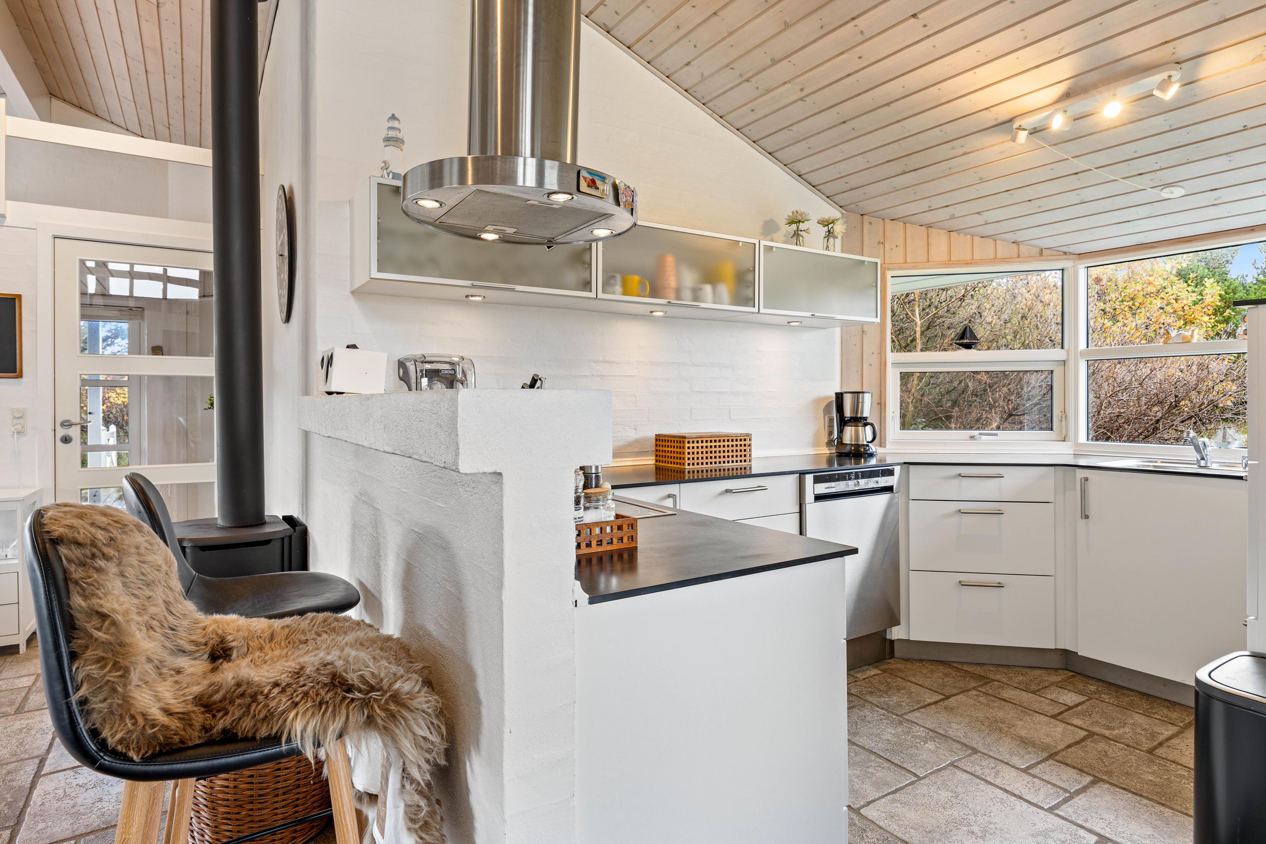 Det store, åbne køkkenalrum er husets hjerte. Her finder I både et godt og veludstyret køkken, et godt spiseområde samt et dejligt sofaafsnit med et flot kig til husets udeområde. Det store rum har højt til loftet og sammen med det flotte lysindfald, får man en god fornemmelse af plads omkring sig samtidig med, at de små hyggekroge skaber rum til fordybelse og nærvær. Når vejret ikke er til at sidde ude, er det helt oplagt at sidde i en god stol i stuen og nyde udsigten til svejende marehalm og forhøjninger i landskabet. På køligere dage er det oplagt at tænde op i husets brændeovn og kigge på flammernes knitren.