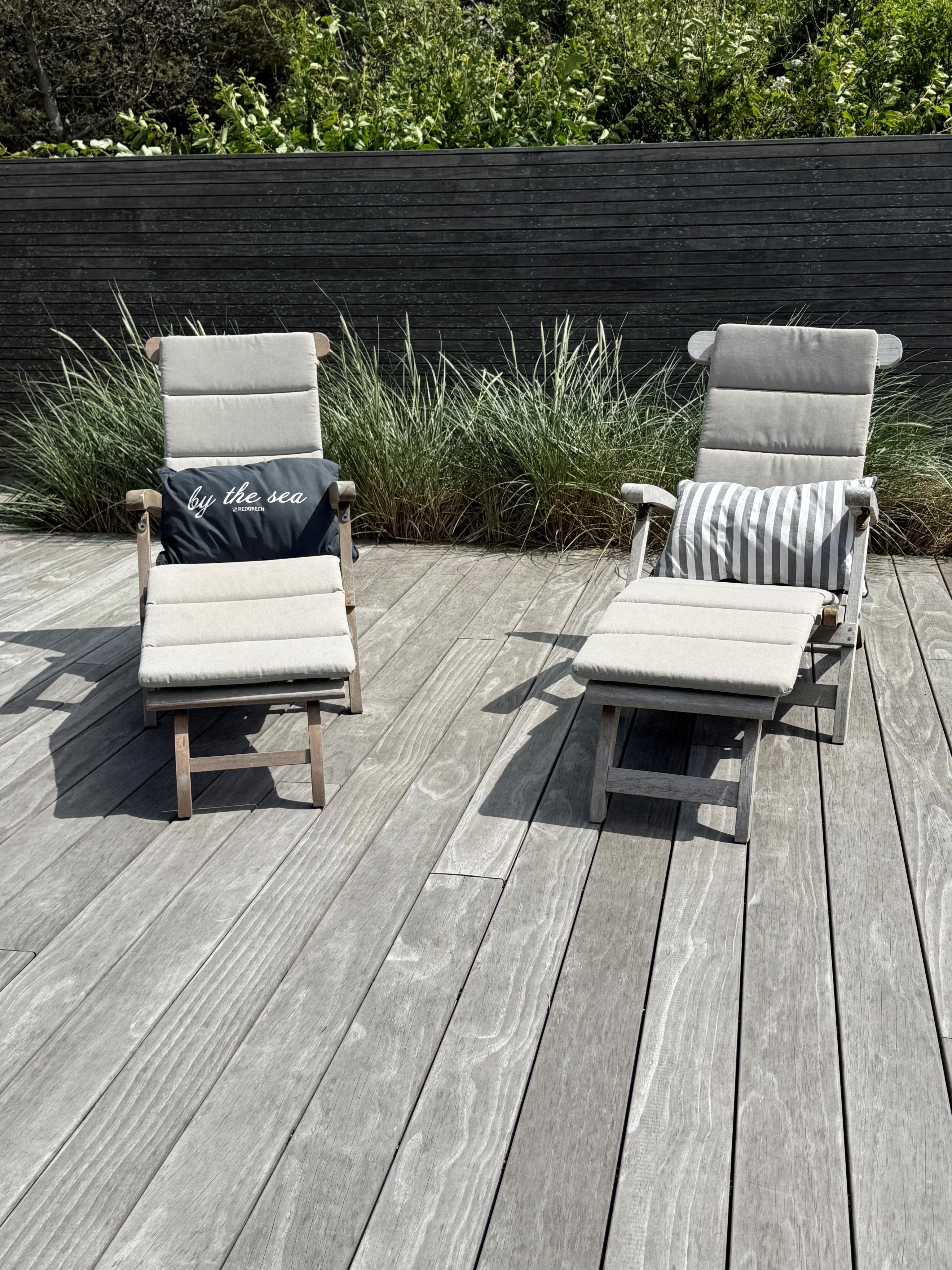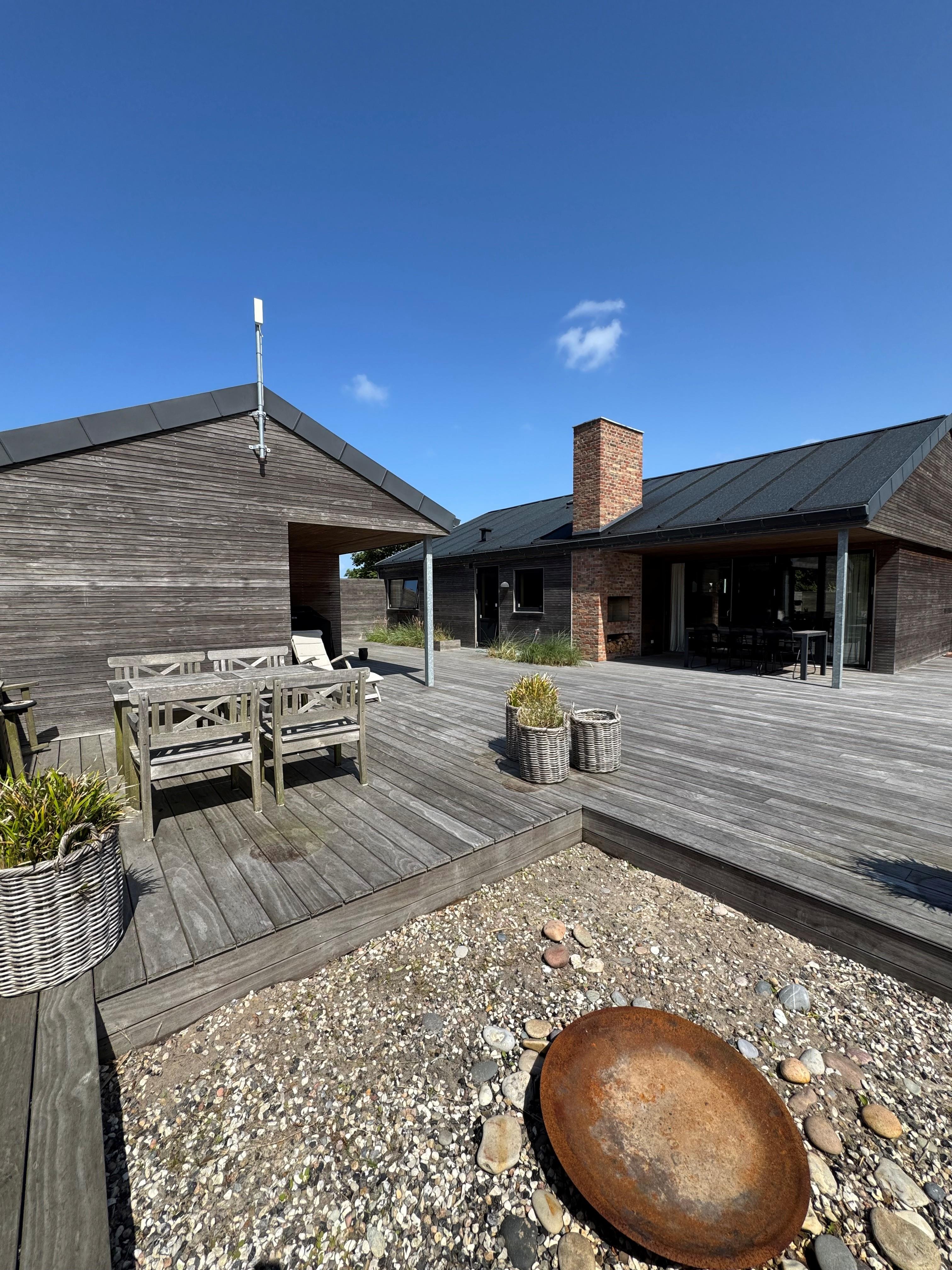 Skøn afskærmet træterrasse med bålplads, udebruser og hængekøje