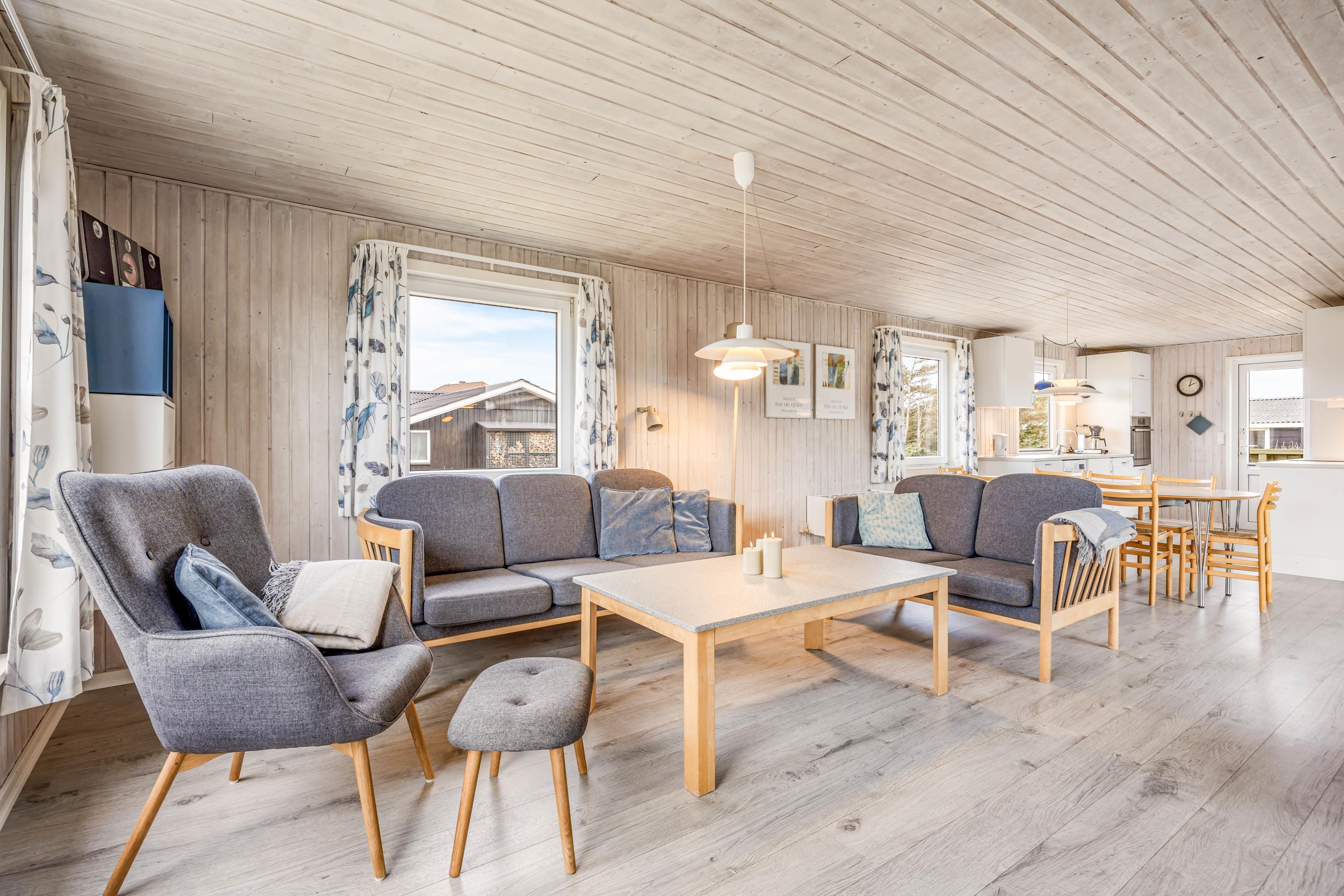 Feriehusets hjerte er køkkenalrummet, som binder hele feriehuset sammen. Her har hele familien mulighed for at være sammen, uanset om I står i køkkenet, og tilbereder et lækkert måltid mad, eller om I sidder i stuen, og streamer en god film på fjernsynet via sommerhusets tilhørende Chromecast. Det er også i stuen, I finder brændeovnen, som er oplagt at tænde op for på de lidt køligere dage, så I rigtig kan mærke den helt rigtige sommerhusstemning. Er brændeovnen ikke i gang, har I mulighed for at benytte jer af den energibesparende luft til luft varmepumpe, som bidrager til et godt og behageligt indeklima.
