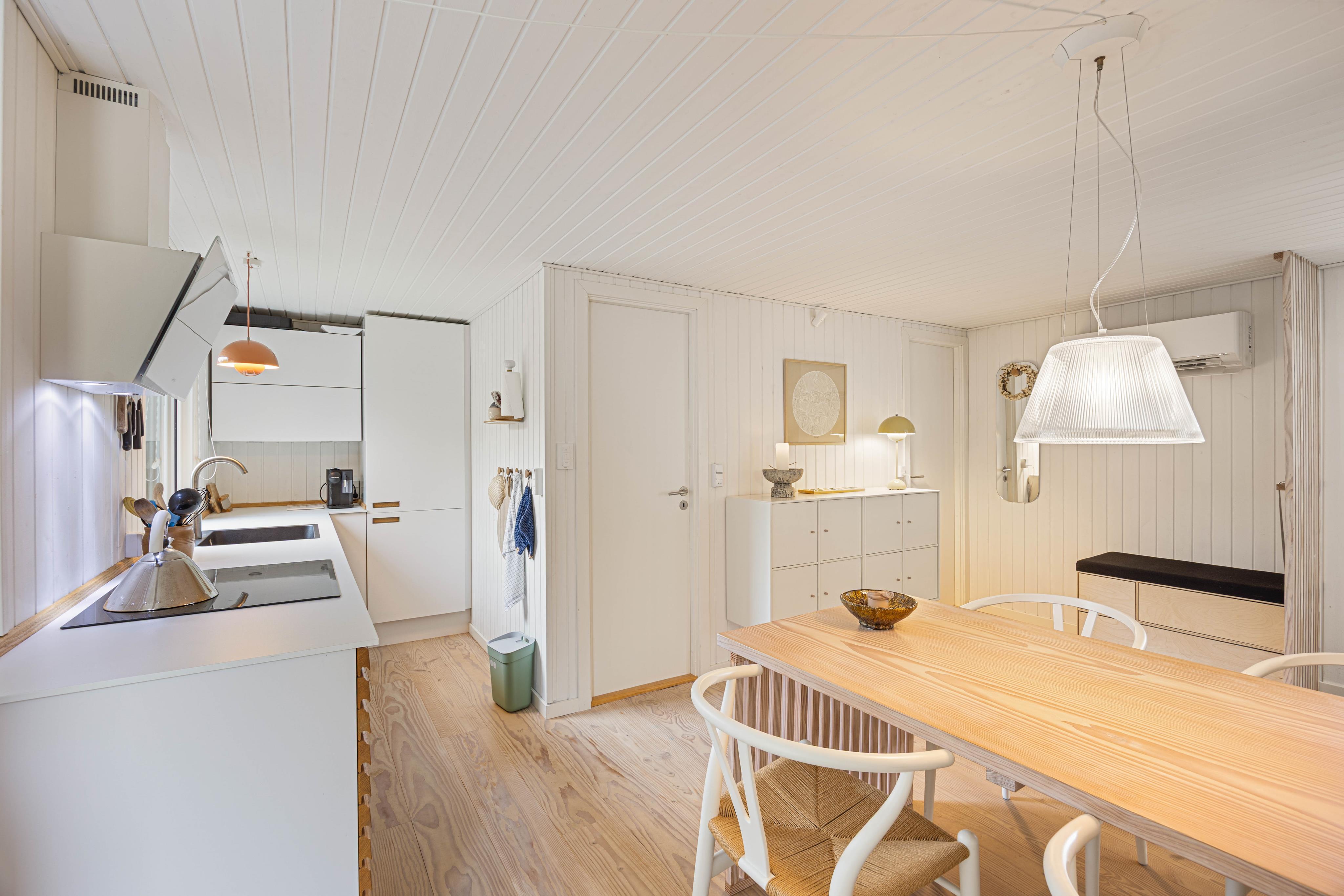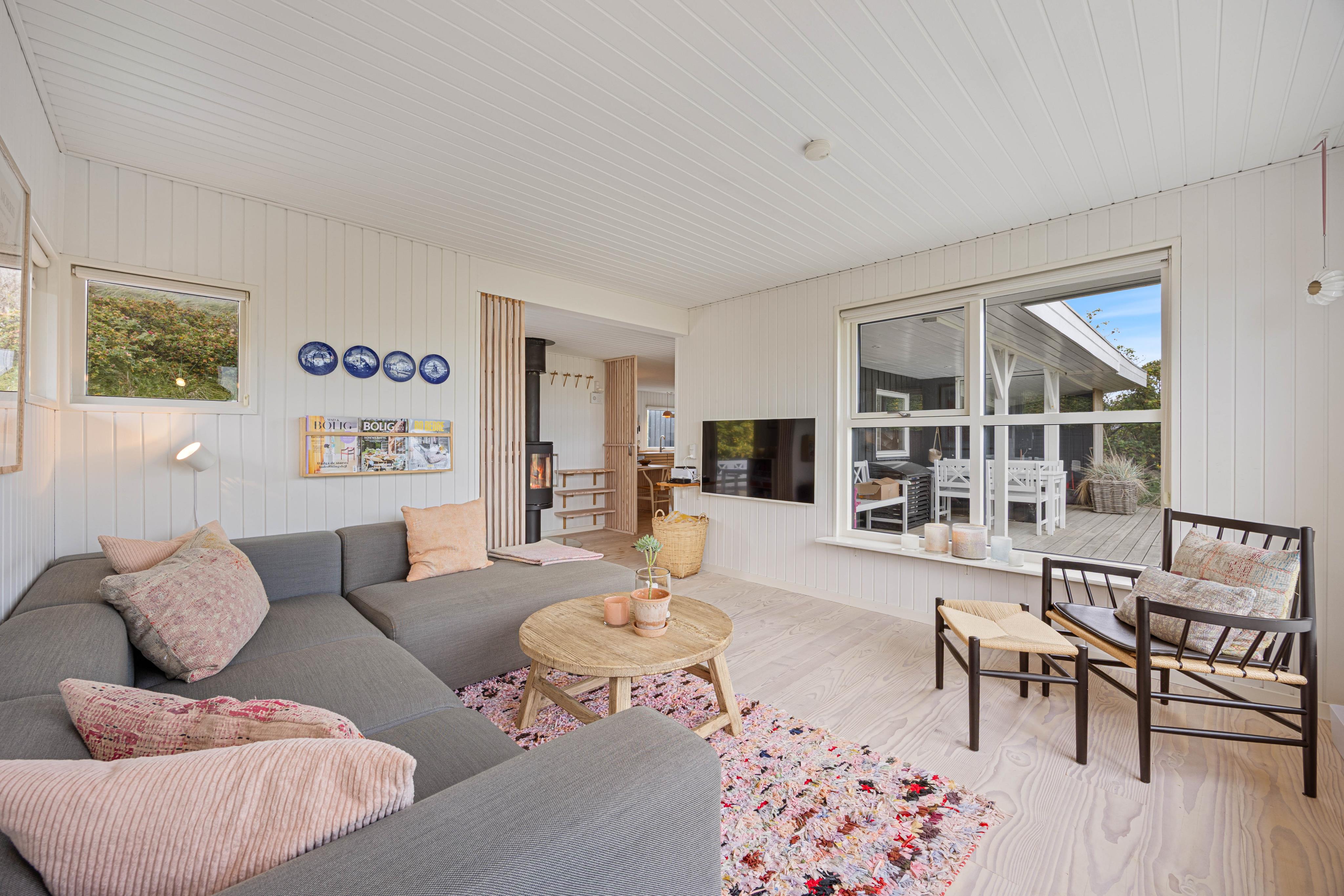 I stuen som er feriehusets hjerterum, er det oplagt at samles hele familien, og se en god film sammen. I det lille værelse har I adgang til en Chromecast, så I kan streame jeres egne film. På de lidt koldere dage er det oplagt at tænde op for brændeovnen, som bidrager med en ekstra hyggelig sommerhusstemning. Har I ikke gang i brændeovnen, kan I bruge den energibesparende luft til luft varmepumpe, som bidrager til et behageligt indeklima.