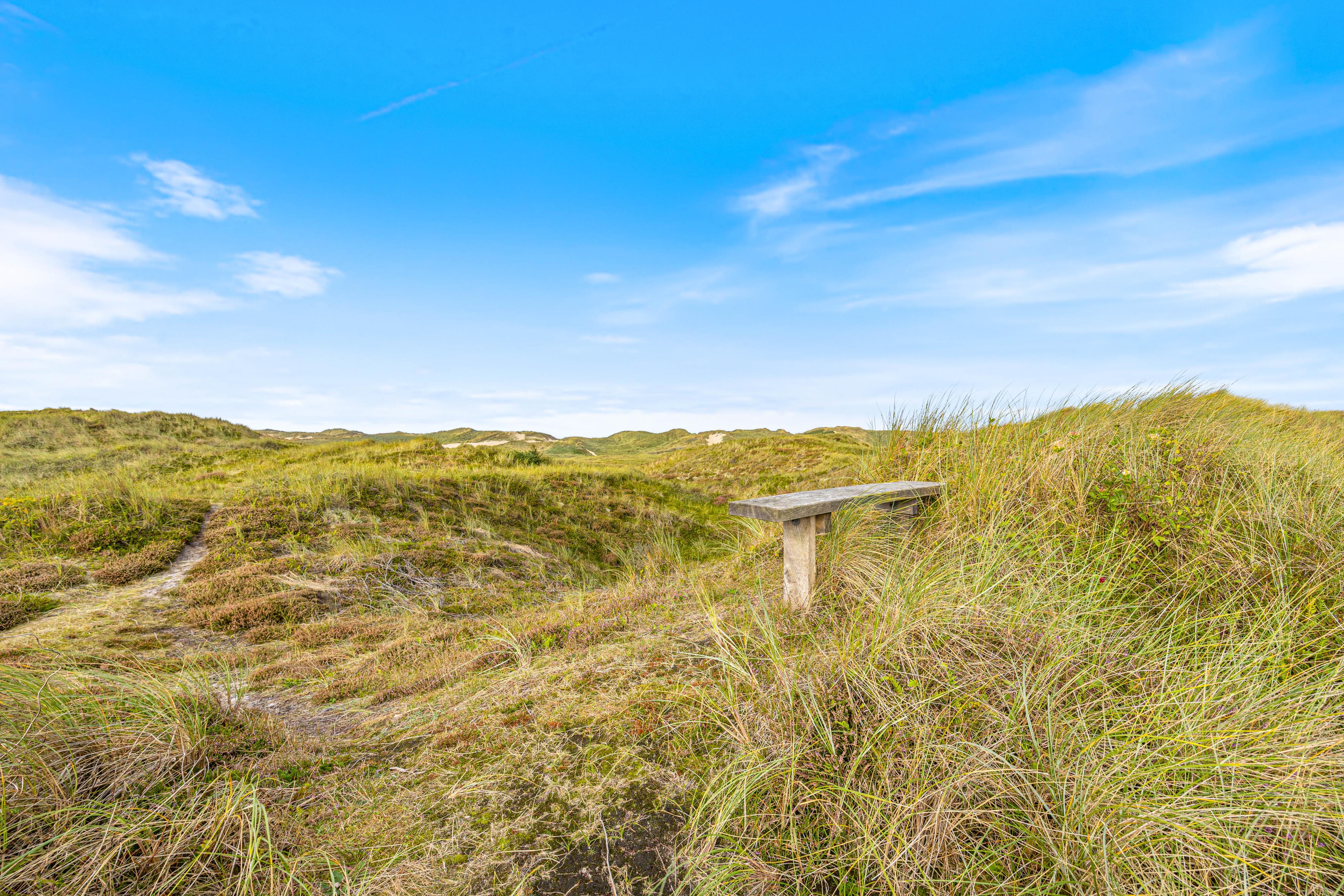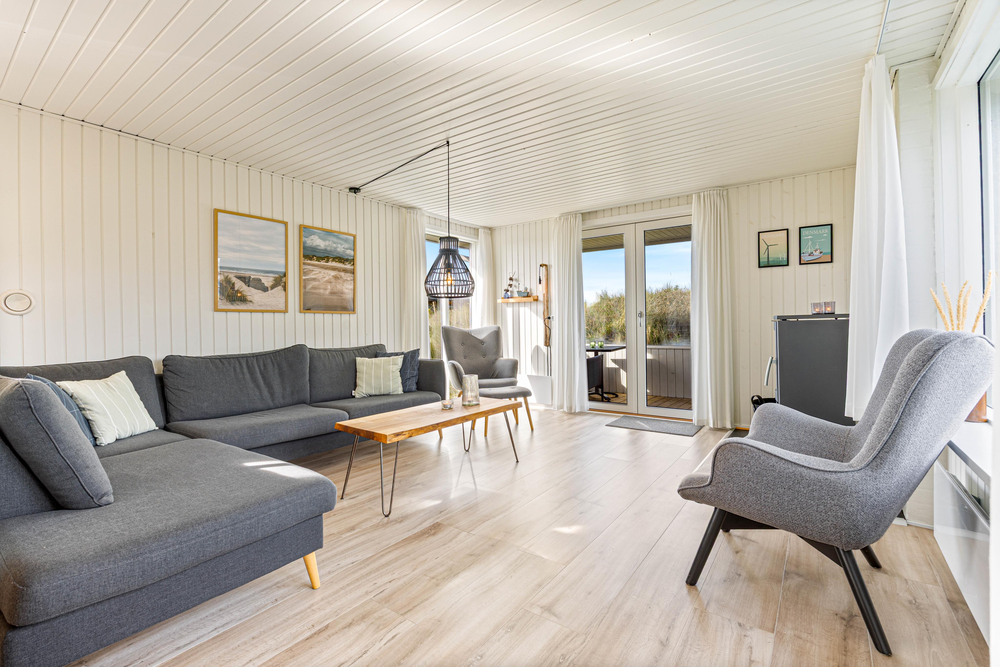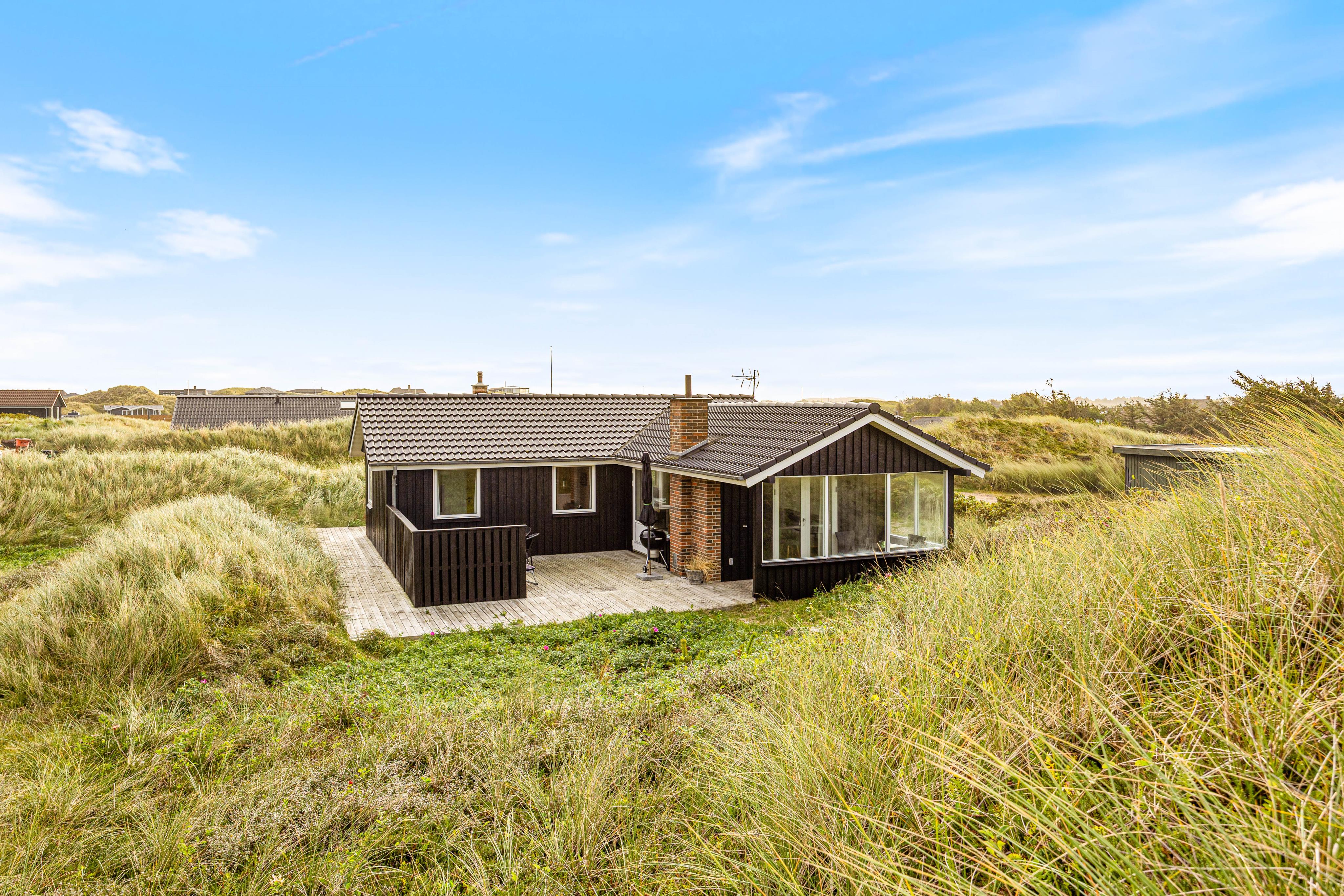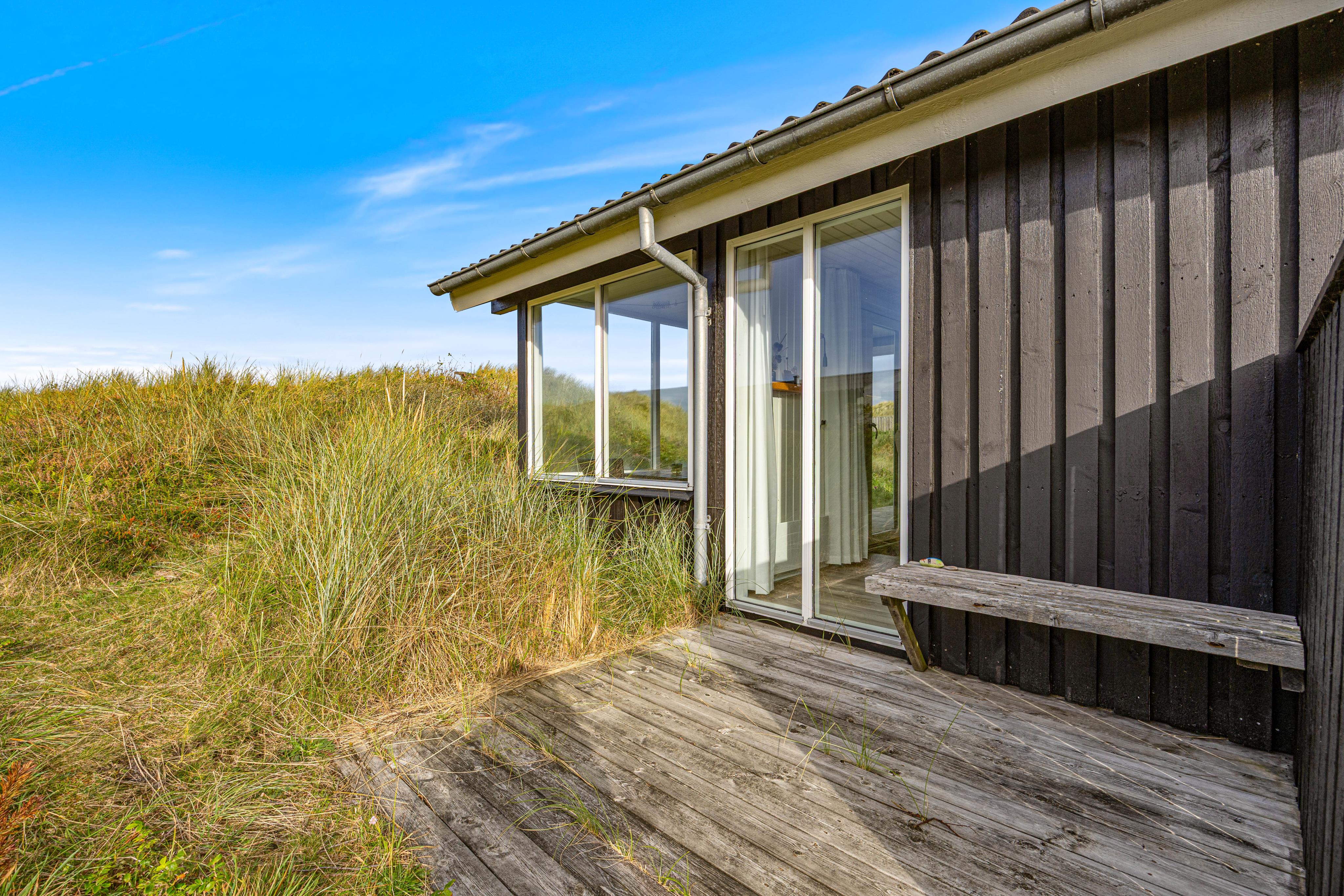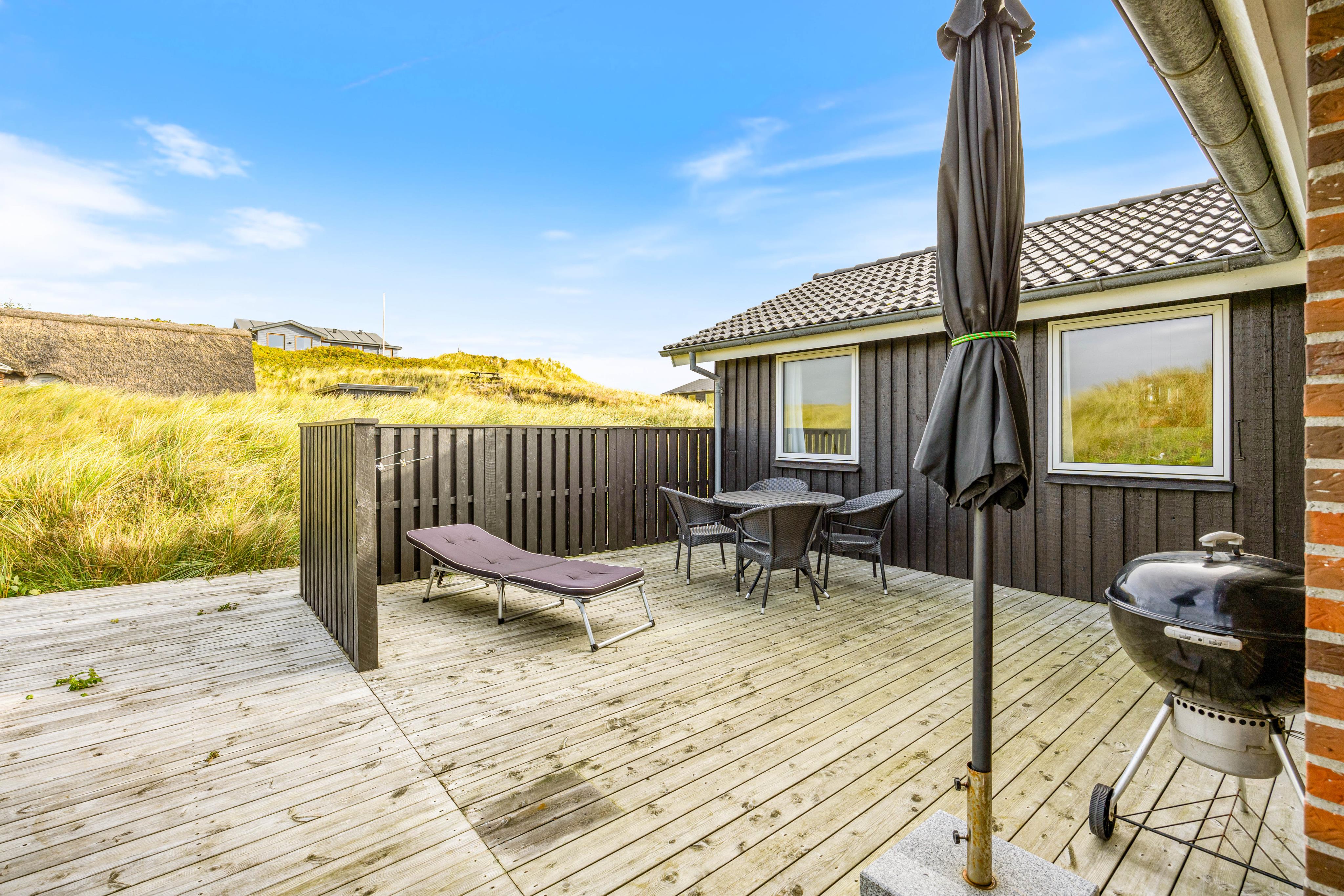En stor træterrasse kredser rundt om hele huset. Her er derfor altid er sted i læ at finde. En del af terrassen er overdækket og afskærmet, så man på de dage med mindre godt vejr også kan nyde den friske havluft udenfor, med en kop morgenkaffe i hånden. Terrassen er udstyret med diverse havemøbler og en grill, så I kan grille og hygge hele dagen.Fra huset er der også en sti, som vil føre jer direkte til havet, der er et syn for sig selv uanset om det er midt i Juli, eller om det i december.