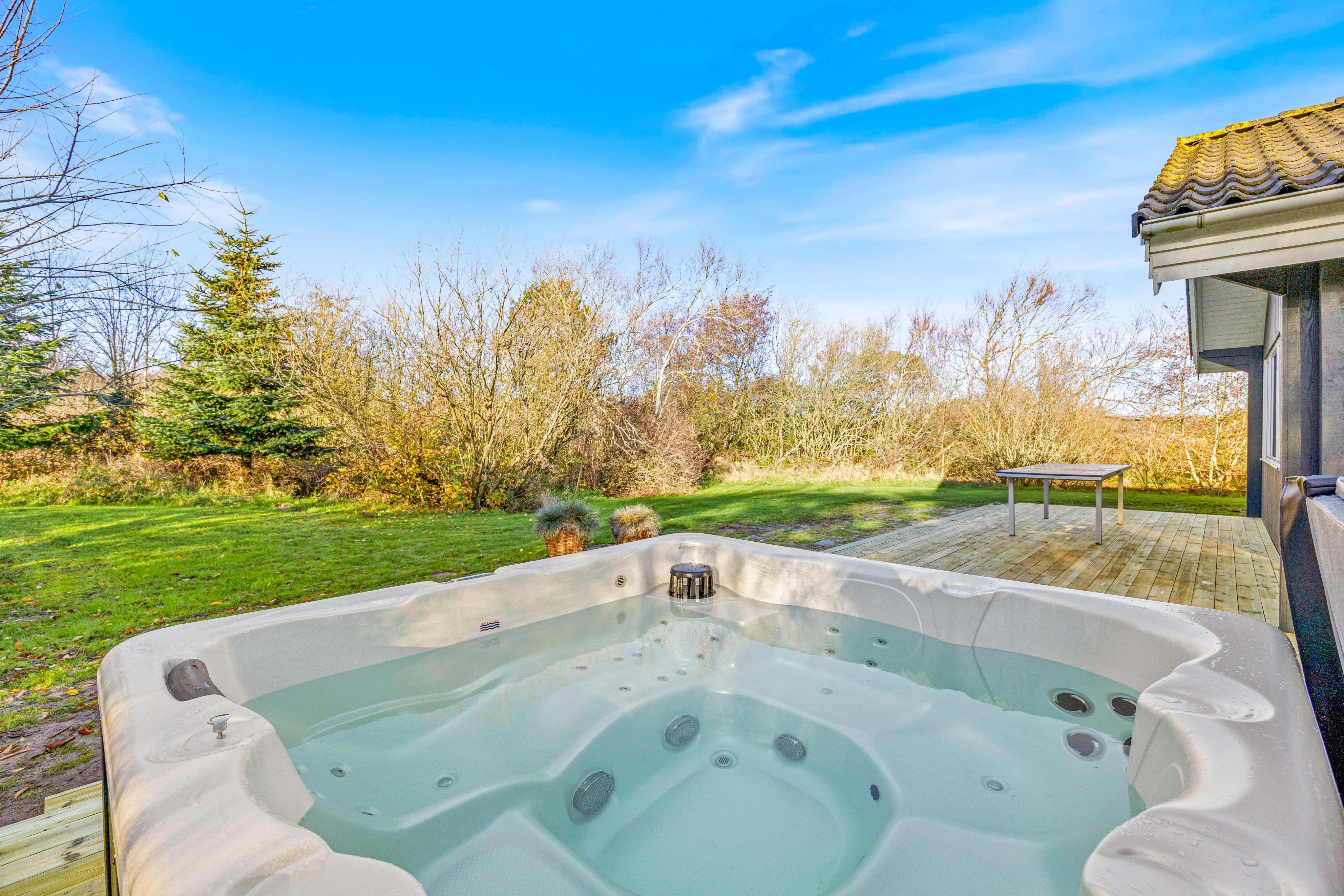 Der er gode muligheder for at nyde ferien på de forskellige terrasser i dette hus. Mod sydvest er der en helt åben terrasse, hvor der ofte kan findes læ. Mod vest er der en delvist overdækket terrasse, som også er delvist afskærmet. Her kan man grille om aftenen, mens børnene spiller fodbold på græsplænen lige ud for. Vesterhavet er kun 1700 meter fra huset, en kort køretur eller en frisk travetur.
