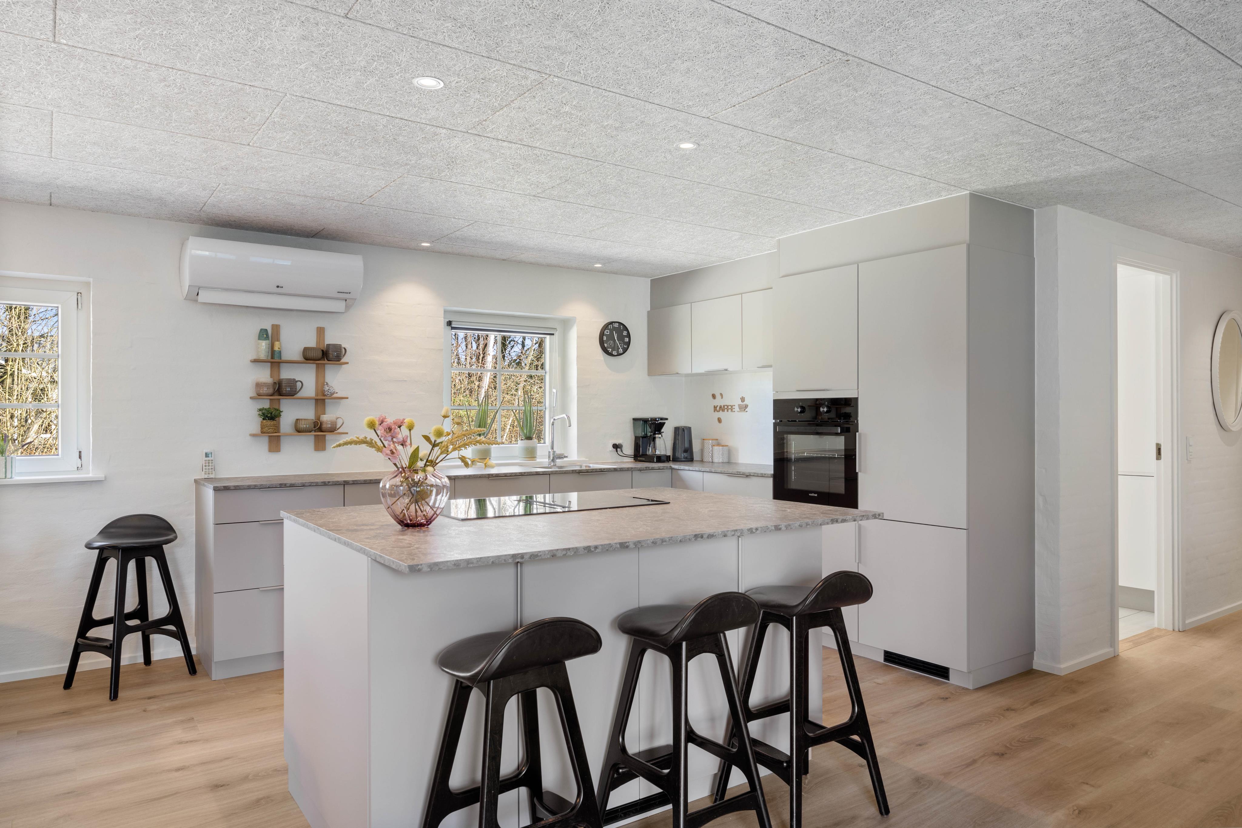 Sommerhuset på Risbjergvej 1 fremstår lyst og venligt med klassisk sommerhus-interiør, og det nye køkken samt den integrerede stue med brændeovn, vil uden tvivl danne rammen om mange gode feriestunder. Sommerhuset på Risbjergvej 1 rummer alle de praktiske nødvendigheder, der skal til for at gøre ferien afslappende. Der er både opvaskemaskine, vaskemaskine og tørretumbler i sommerhuset. Som en ekstra konmfort er der gulvvarme på badeværelset, så man ikke fryser om fødderne om morgenen. Feriehuset indeholder hele 3 badeværelser, så der ikke opstår kø ved morgenrutinen. Sommerhuset har 6 gode soveværelser, hvoraf det ene består af 2 køjesenge.