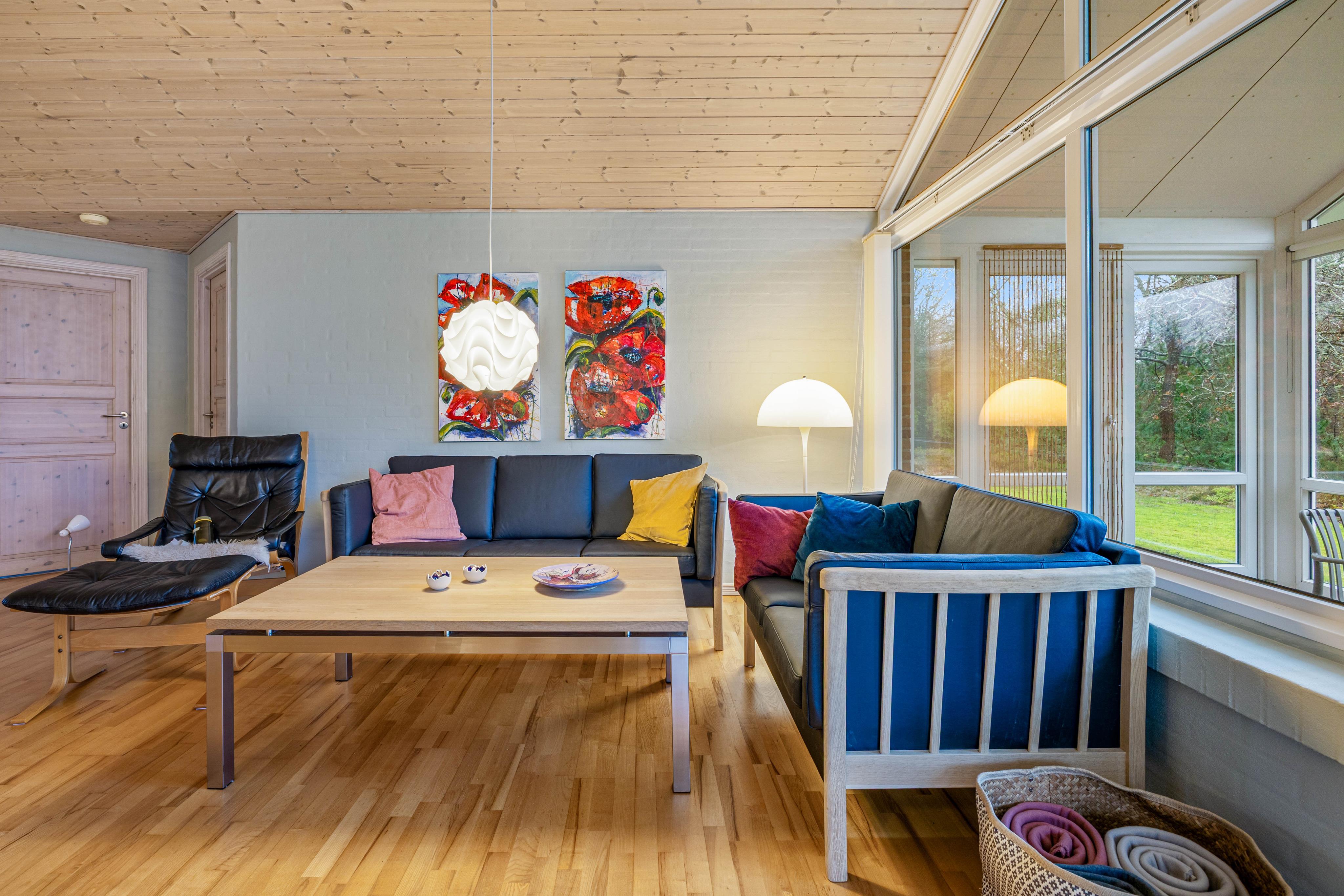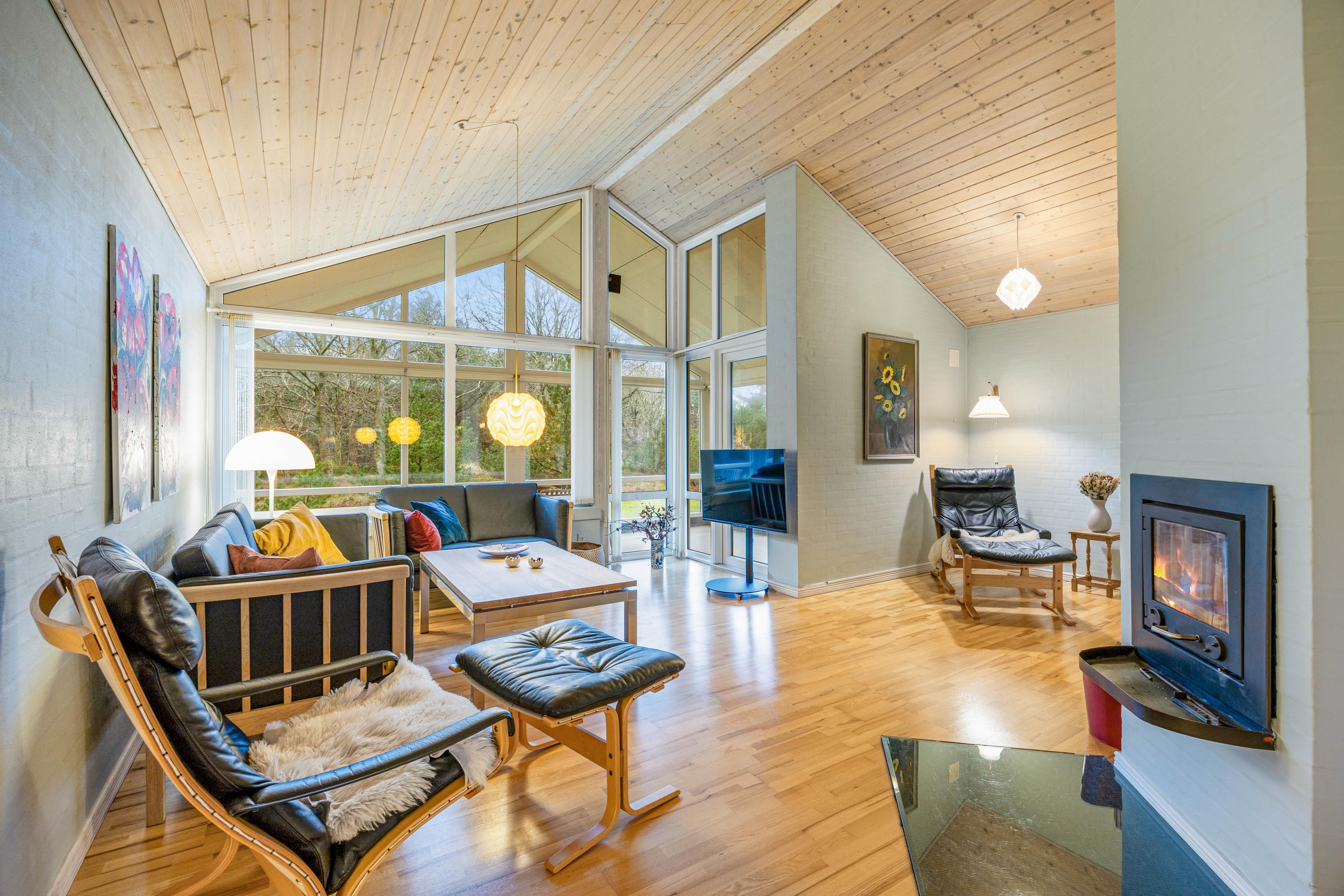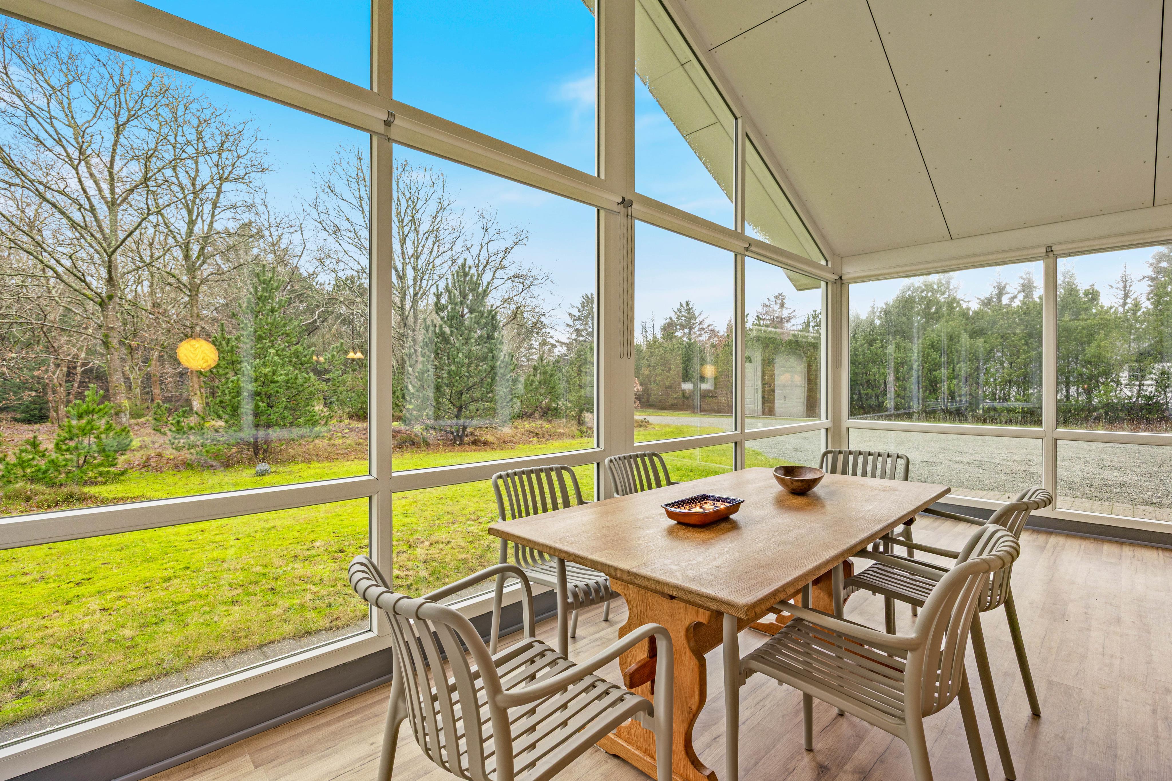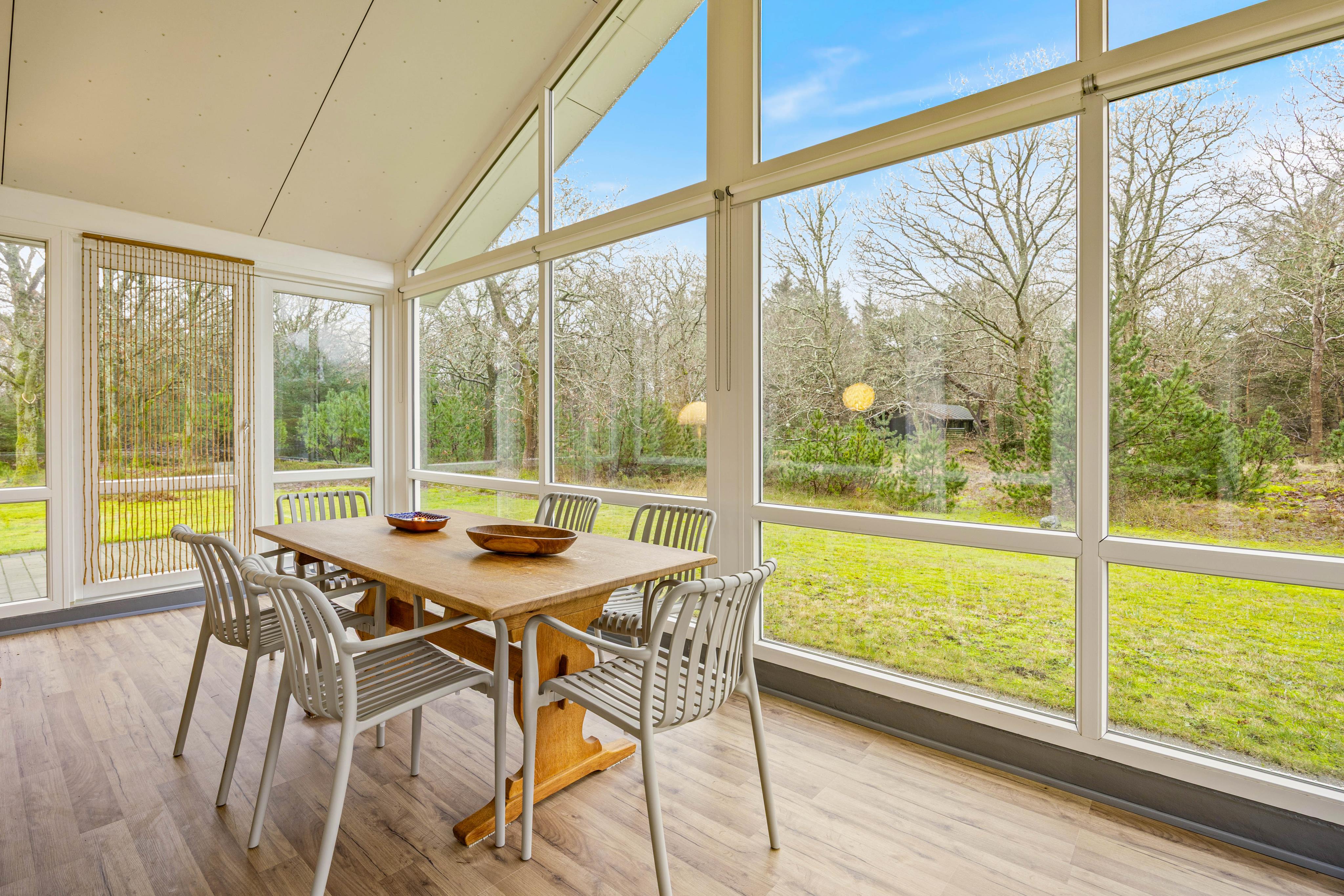 Skulle vejret ikke vise sig fra sin bedste side, kan I trække indenfor i den lyse udestue, hvor det store lysindfald og udsigten over den naturrige have skaber en rolig og afslappende stemning.