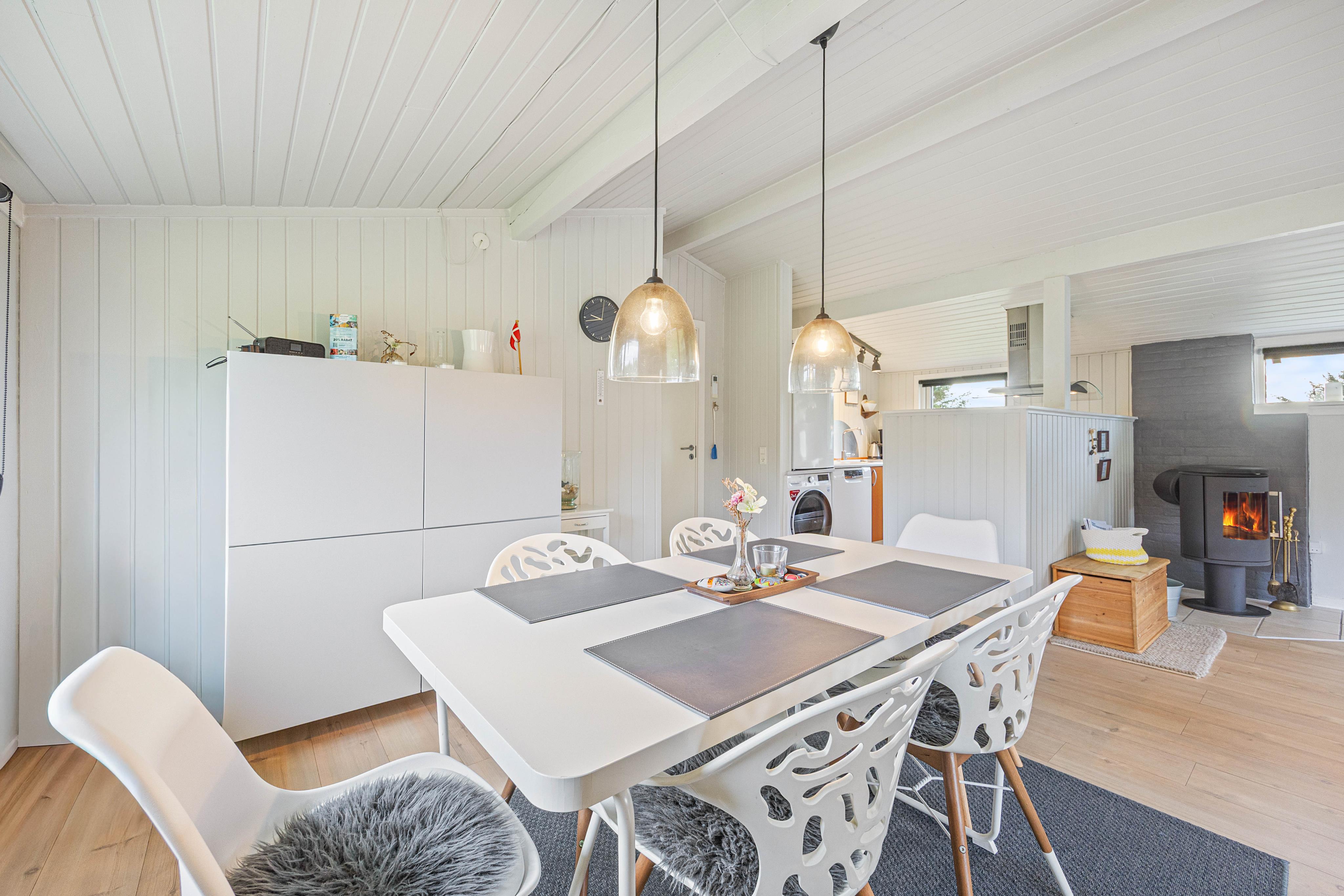 En ekstra stemningsspreder er selvfølgelig den klassiske brændeovn, som med sine knitrende flammer sørger for, at også de grå og blæsende feriedage bliver utrolig hyggelige. Og med opvaskemaskine i køkkenet får I endnu mere tid til at nyde feriehyggen, samværet og stilheden langt væk fra den travle hverdag.