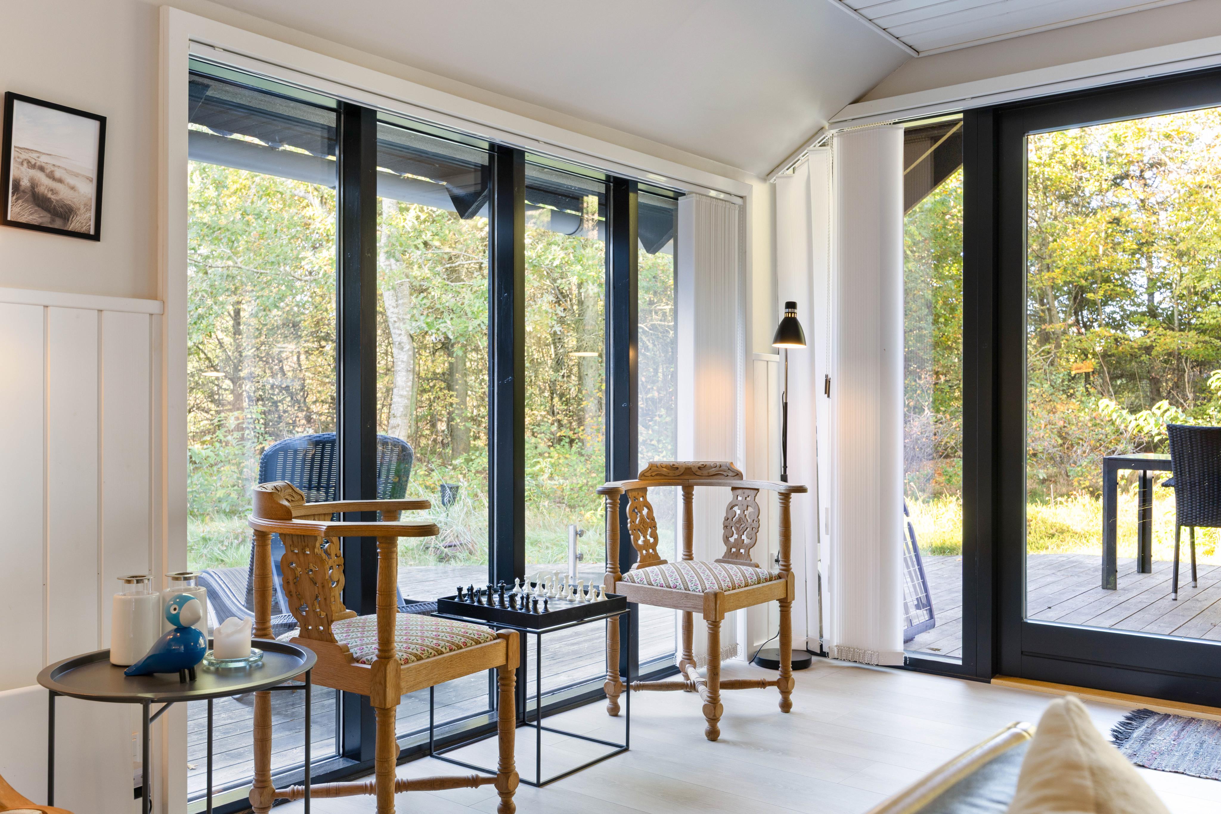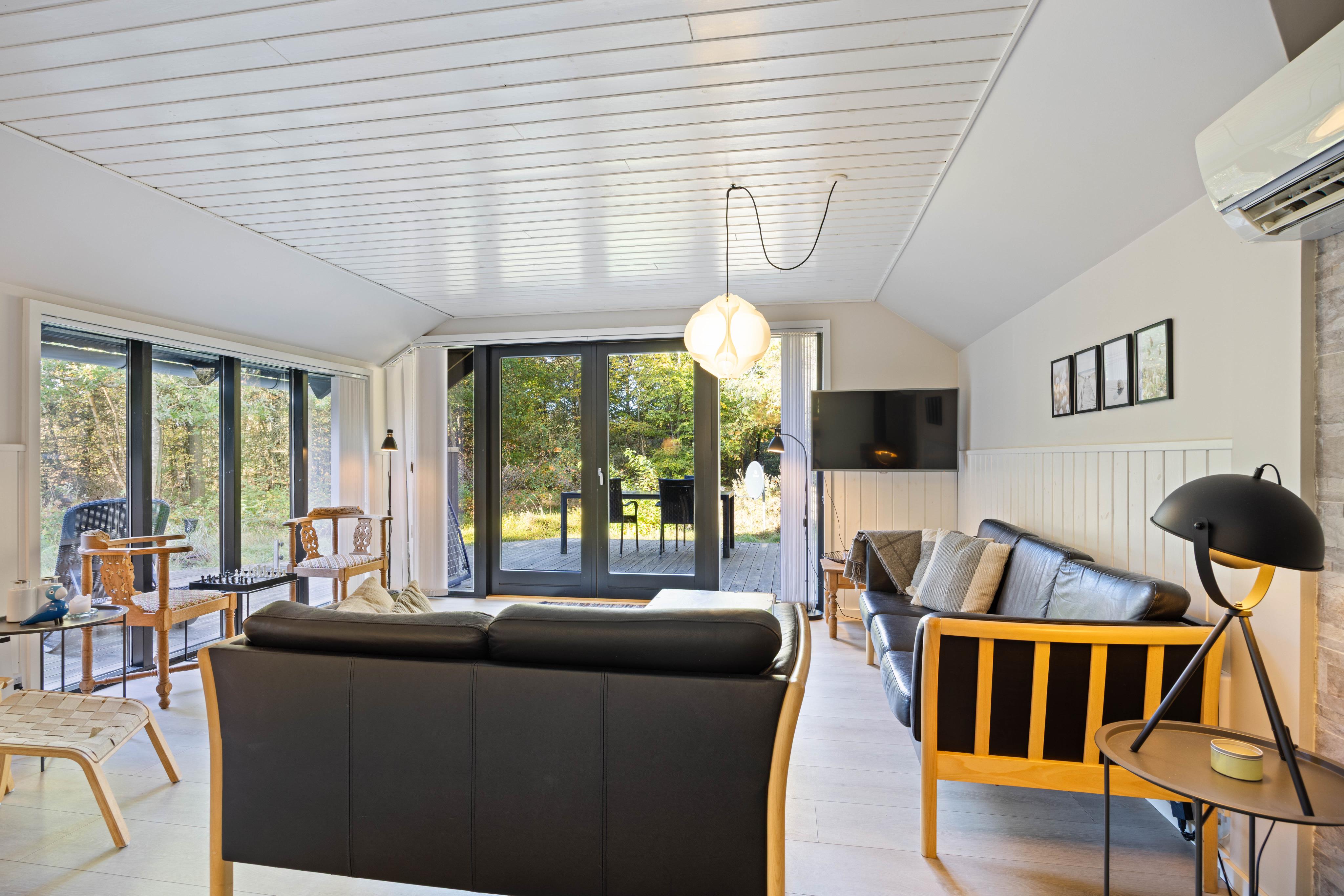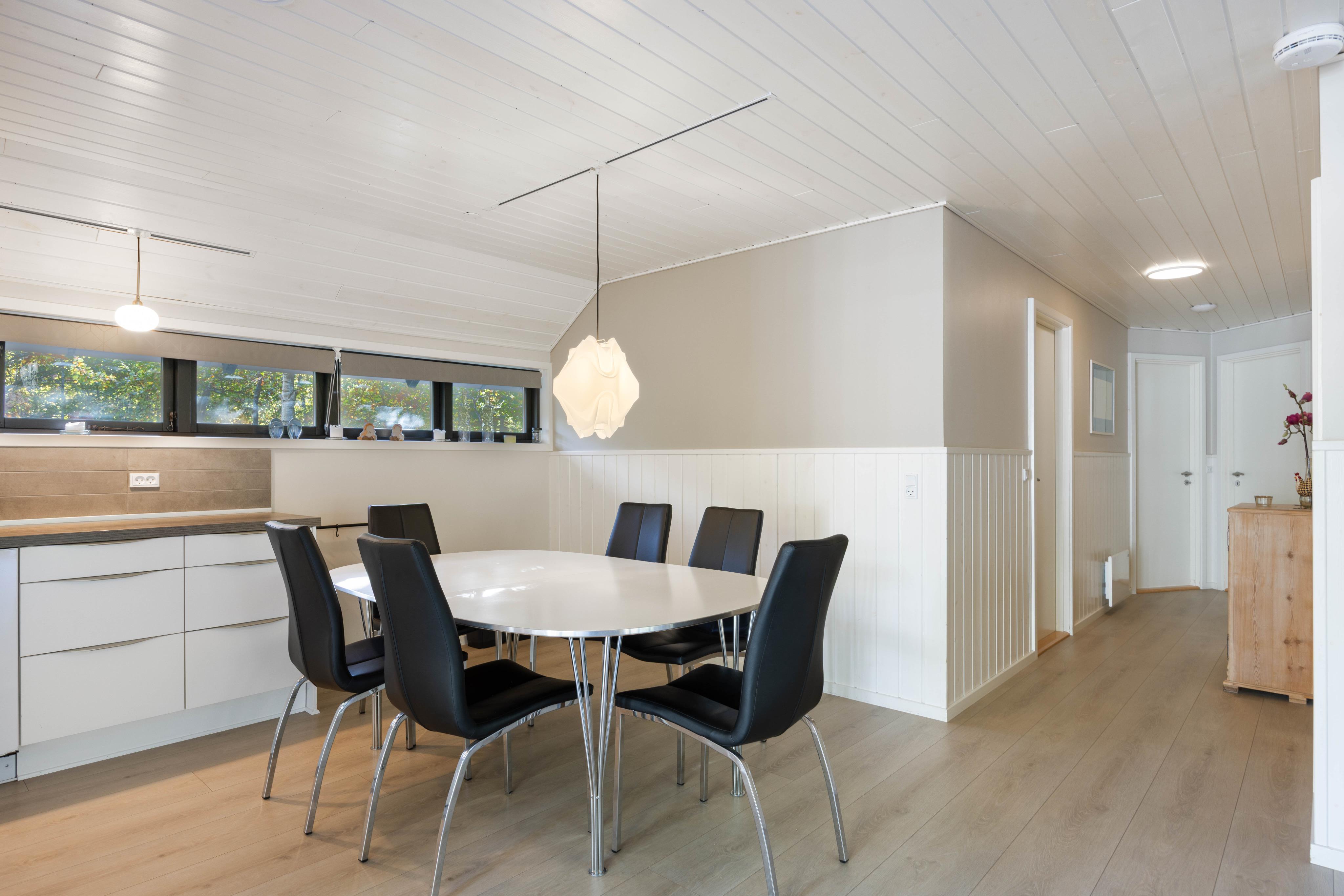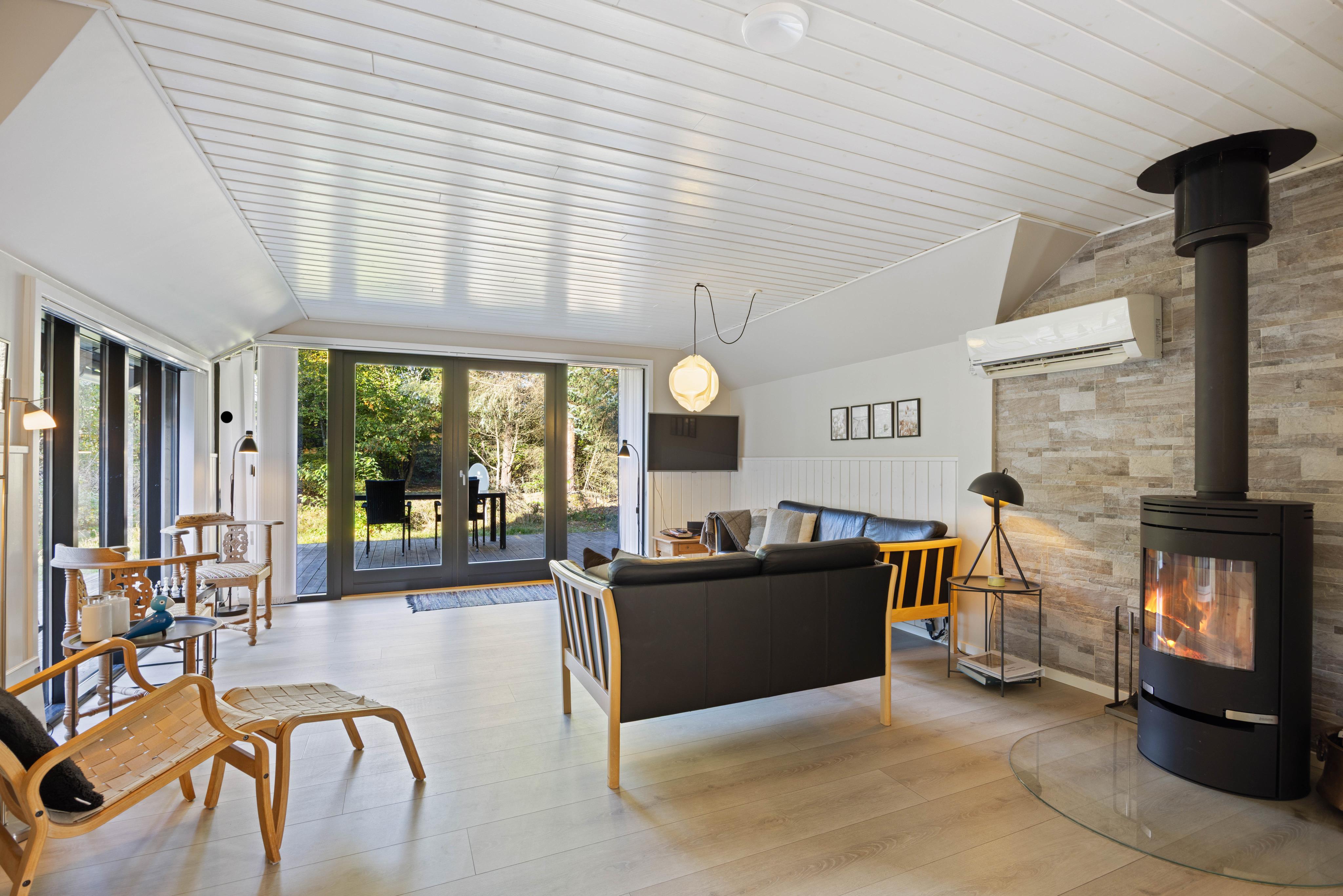 Det lyse og indbydende interiør på Ahornalle 14 skaber en rolig og afslappet atmosfære, hvor I straks vil føle jer hjemme. Det store, åbne opholdsrum forener køkken, spiseområde og stue i ét sammenhængende fællesrum – ideelt til fælles madlavning, hyggelige middage og afslapning foran brændeovnen. Den funktionelle indretning og det gode indeklima gør sommerhuset behageligt og komfortabelt året rundt, uanset om I besøger det i sommermånederne eller til en rolig vinterferie tæt på naturen.