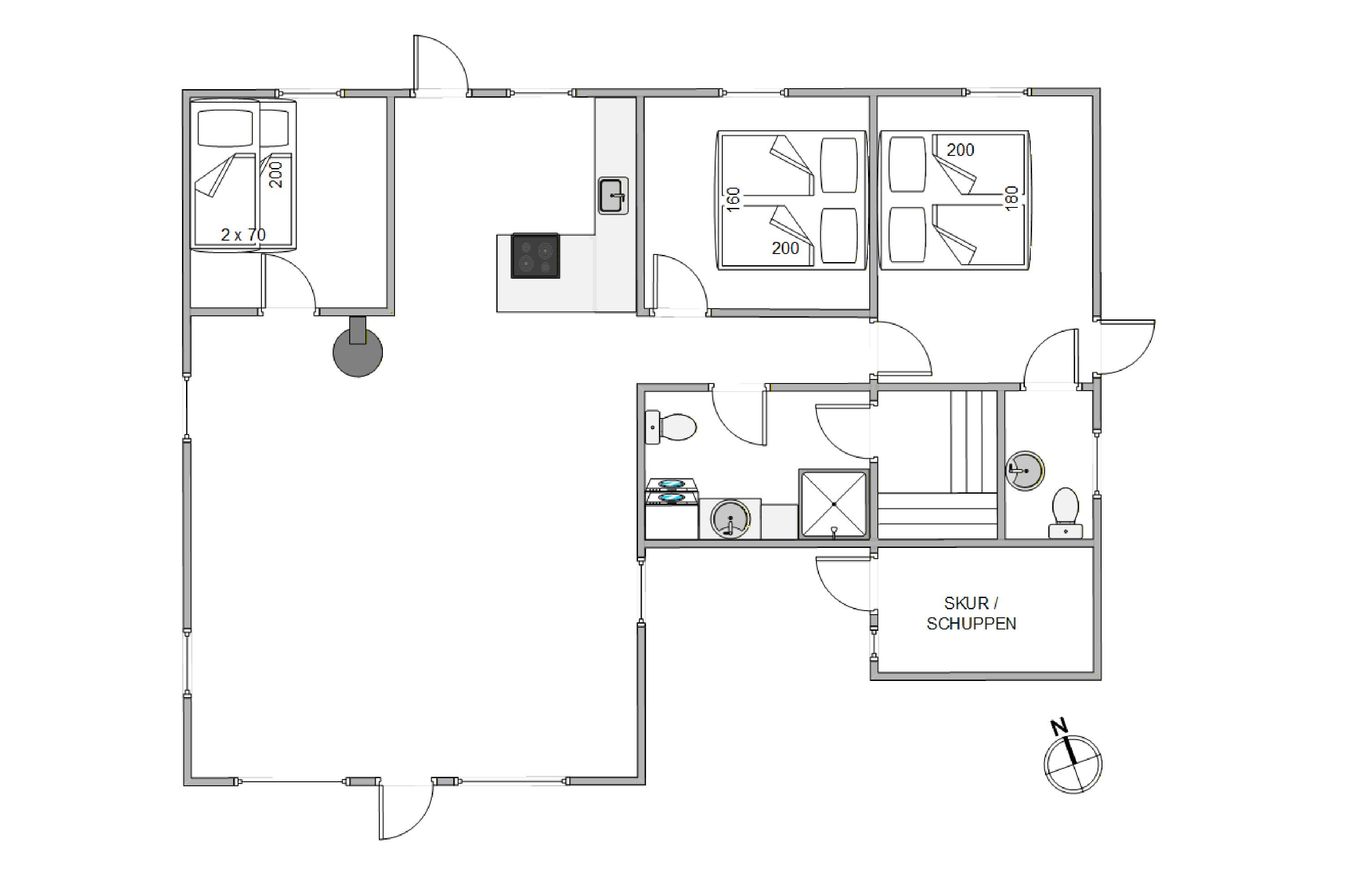 Om aftenen kan I fordele jer på feriehusets 3 soveværelser, som er udstyret med 1 køjeseng og 2 enkeltsenge, der er skubbet sammen. Her har I mulighed for at genoplade jeres batterier. For at undgå trængsel på badeværelset er der også et gæstetoilet ved siden af. Feriehusets sauna giver en ekstra dosis afslapning i løbet af ferien.