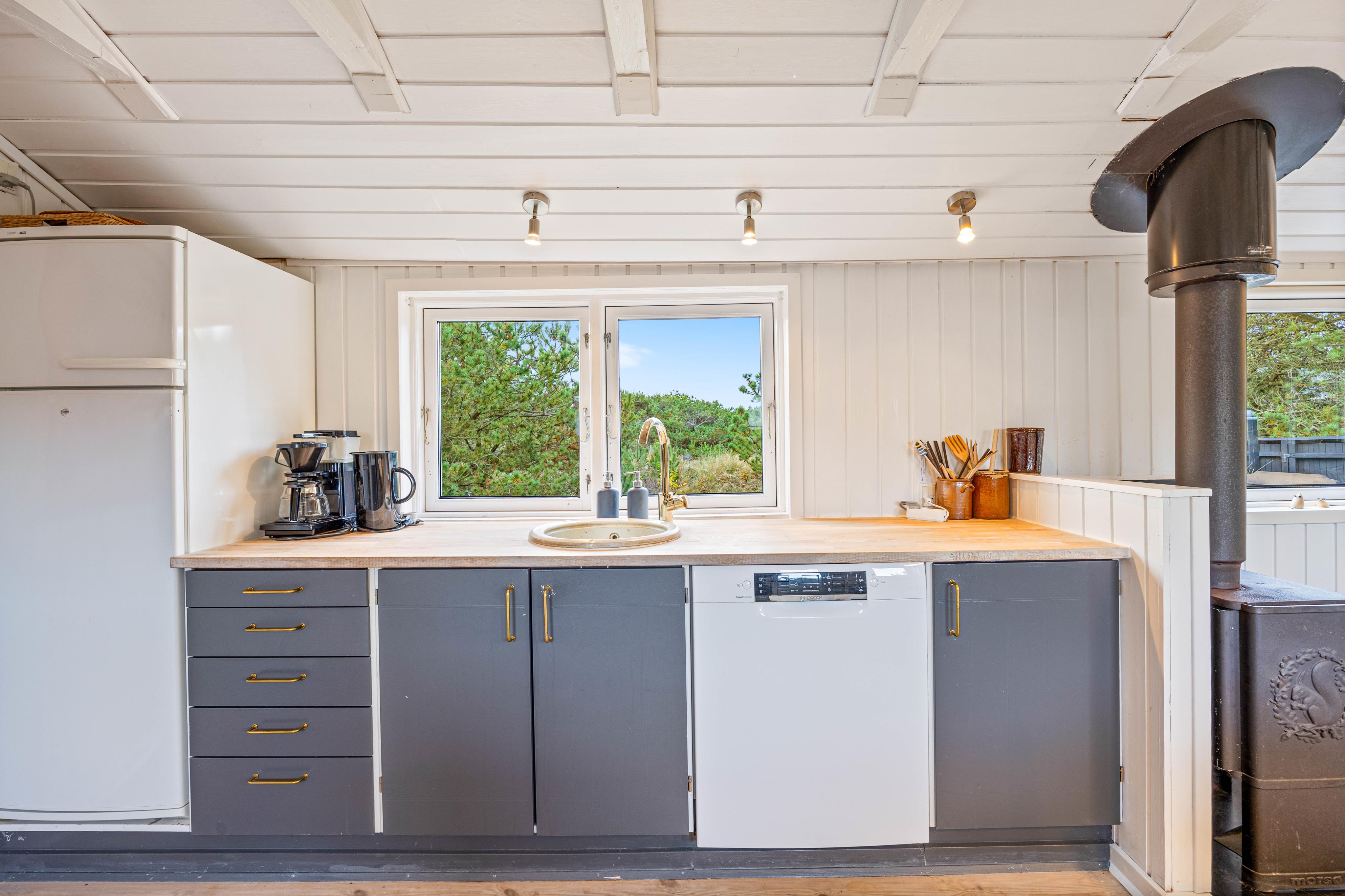 Sommerhuset er beliggende på en hele 3.000 kvadratmeter stor naturgrund i Fjand, der er godt afskærmet af træer og buskads. Her kan I ganske ugeneret nyde den friske luft på en af de gode terrasser. Alle terrasserne er lukket af, hvilket ikke kun giver jer privatliv, men også er praktisk, hvis I har hunden med på ferie. Her finder I også en lækker ugeneret udebruser, så I kan få skyllet jer efter en varm dag i solen.